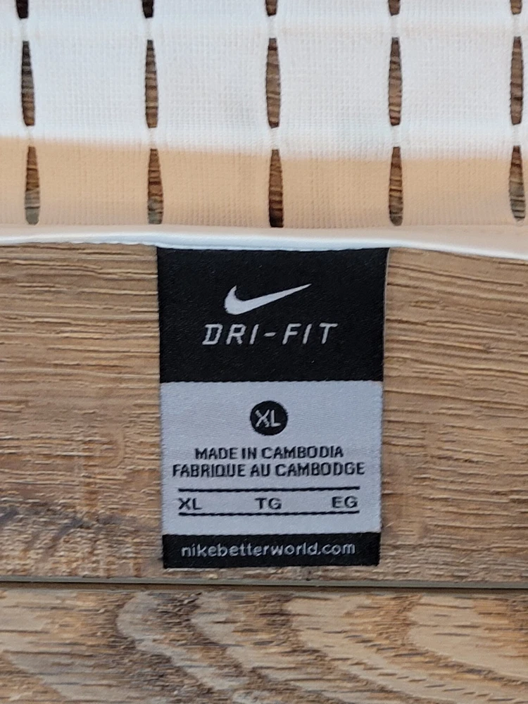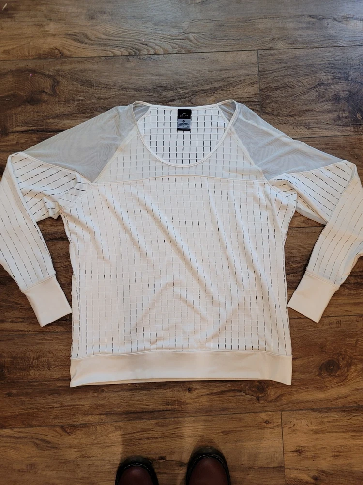 This Nike Dri-Fit sweatshirt top is perfect for active women who want to stay comfortable while working out. The top features a scoop neck and long sleeves with a solid pattern and ivory color. It is made of a nylon blend mesh fabric that allows for ventilation and breathability during intense workouts. The sweatshirt also has the Nike logo on it, making it a stylish choice for athletic women. The women's sweatshirt is a size XL and has a regular fit, making it a great choice for women who want a comfortable and relaxed fit. It is designed for athletic activities and can be worn for a variety of workouts. This Nike Dri-Fit sweatshirt is a must-have for women who want to stay comfortable and stylish while working out. K
