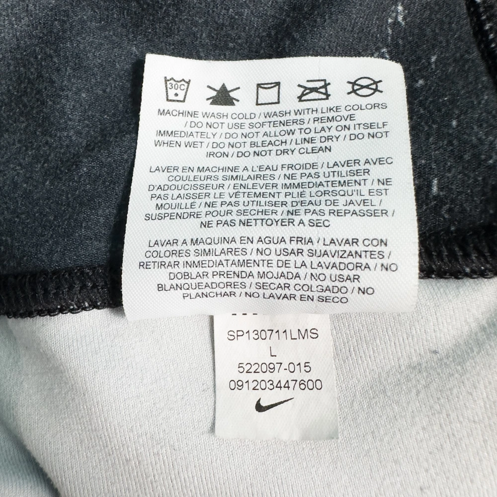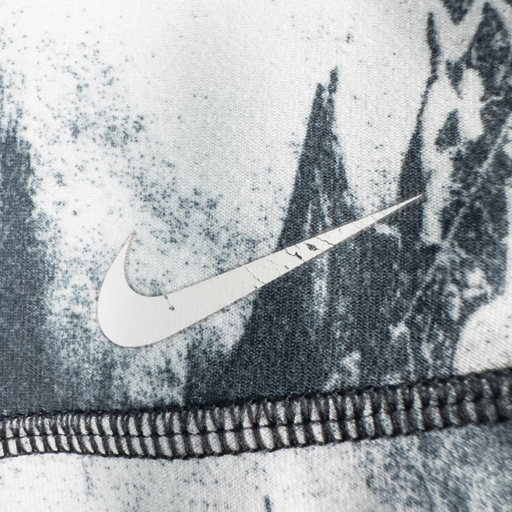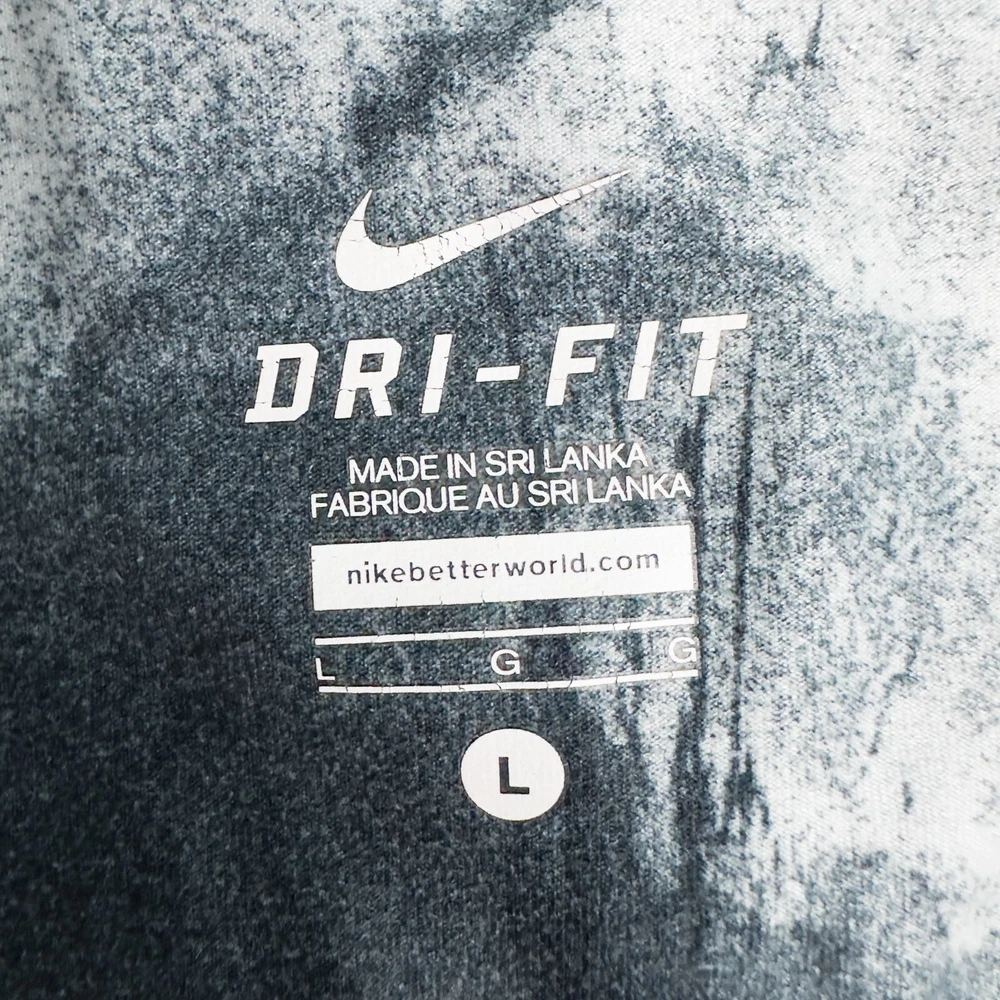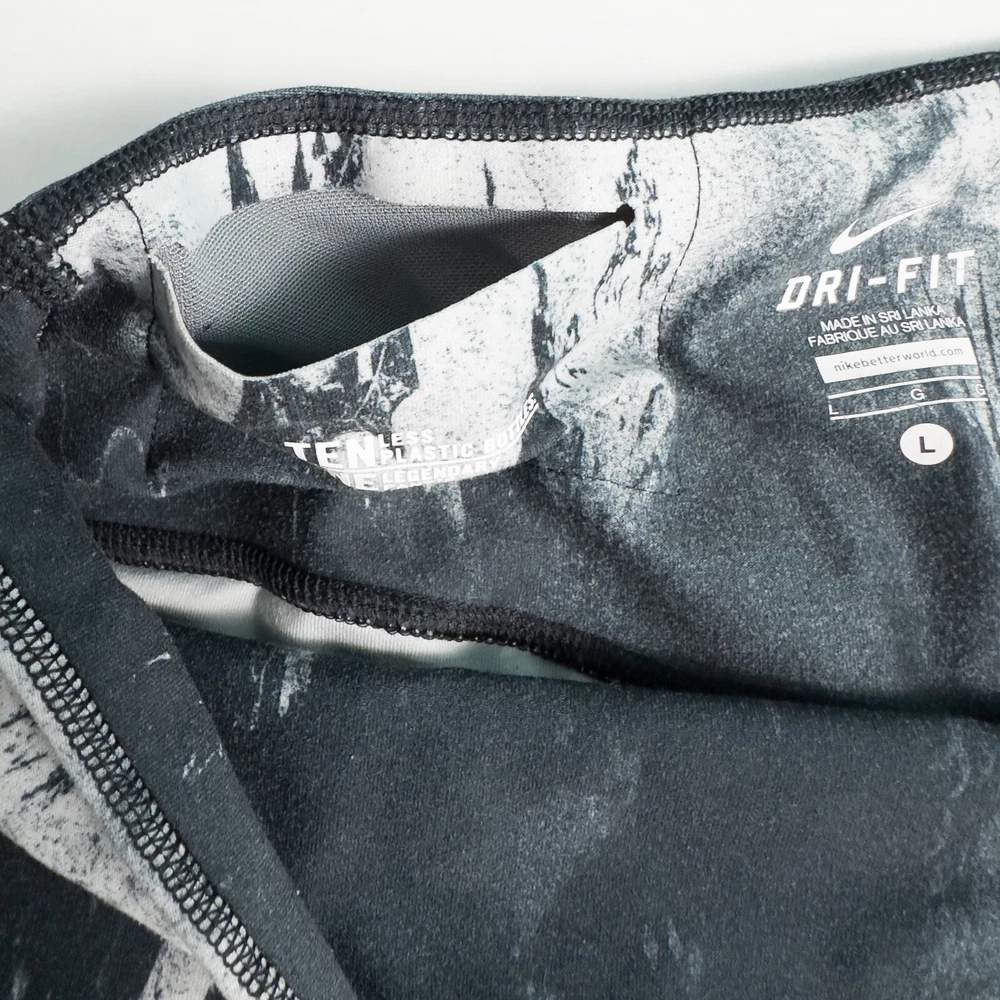 Nike Women's Dri-Fit Ten One Athletic Leggings * Condition: Good pre-owned condition. There's wash wear throughout and some cracking of the inside printed tag and waistband logo. No stains or holes. Please see photos. * Size: Large * All measurements are approximate and taken lying flat. Please see photos as well. * Waist: 15” across * Inseam: 28.5” * Rise: 10.25” * Color: Gray, black, white * Pattern: Marble * Material: 88% Recycled Polyester, 12% Spandex * Wide stretchy waistband * Inner waistband pocket * Sweat wicking and quick drying material * Style Number: 522097-015 * Machine Washable Style Profile: Athletic, Activewear, Athleisure, Gym, Training, Running, Fitness All of my items are stored in a smoke-free, dog-friendly home.