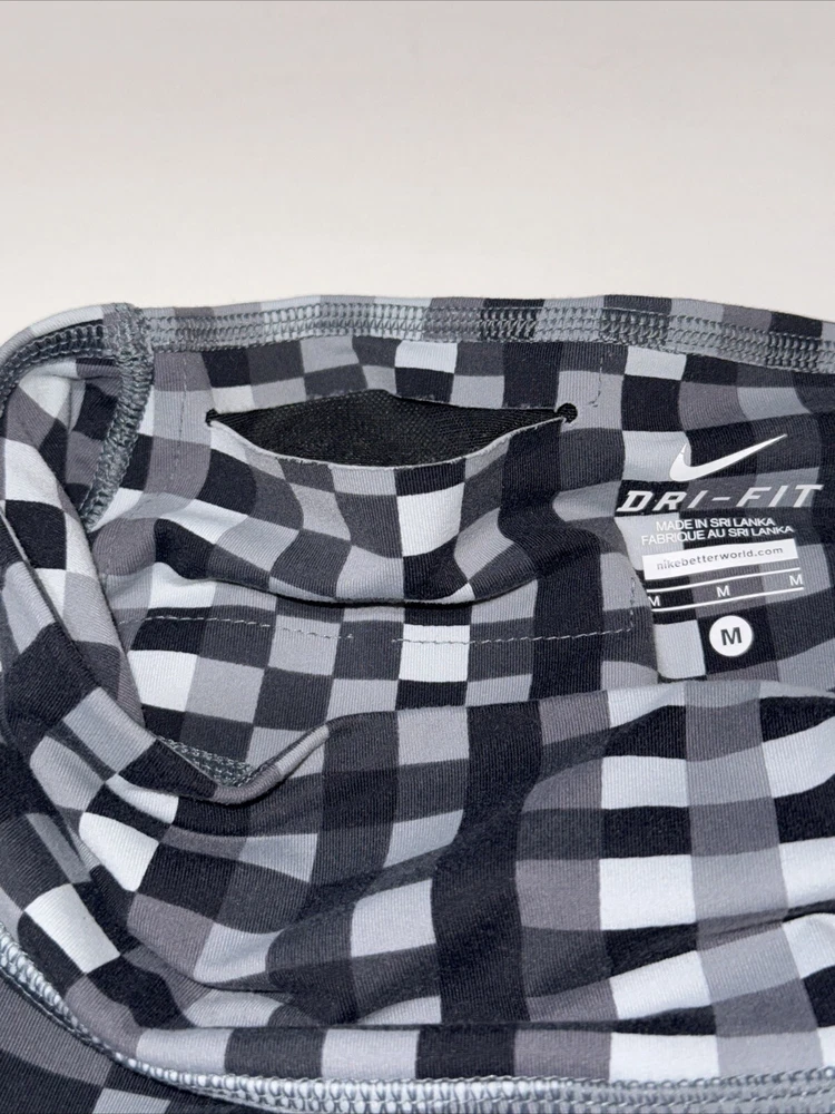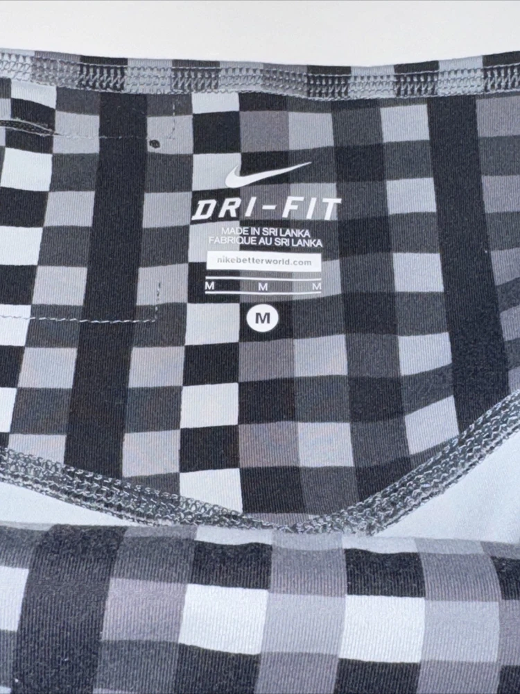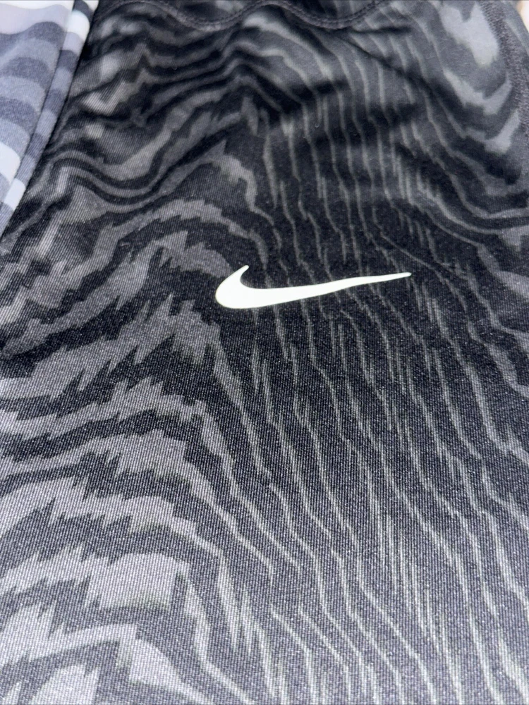 Elevate your activewear game with these Nike Dri-Fit leggings capris. The black and grey colorway with white accents is perfect for any athleisure outfit. Made with a blend of polyester and spandex, these leggings are machine washable and have an elastic waist for a comfortable fit. Ideal for gym and training, cross training, dance, CrossFit, yoga, and bodybuilding, these leggings have a mid-rise and are available in size M with a waist size of 24 inches. The Nike Dri-Fit technology wicks away sweat, keeping you cool and dry during your workouts. Show off your love for sports and fitness with these stylish leggings capris.