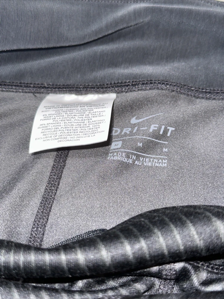 Rise: Mid (8.5-10.5 in) Theme: Athleisure, Logo, Sports Type: Leggings Capris Fabric Wash: Dark Season: Fall, Spring, Summer, Winter Department: Women Pattern: Solid Brand: Nike Size Type: Regular Occasion: Activewear Product Line: Nike Dri-Fit Color: Black Grey Performance/Activity: Bodybuilding, CrossFit, Cross Training, Dance, Gym & Training, Yoga Country/Region of Manufacture: Vietnam Waist Size: 24 in Personalize: No Garment Care: Machine Washable Handmade: No Style: Leggings Capris Material: Polyester, Spandex Size: M Features: Elastic Waist