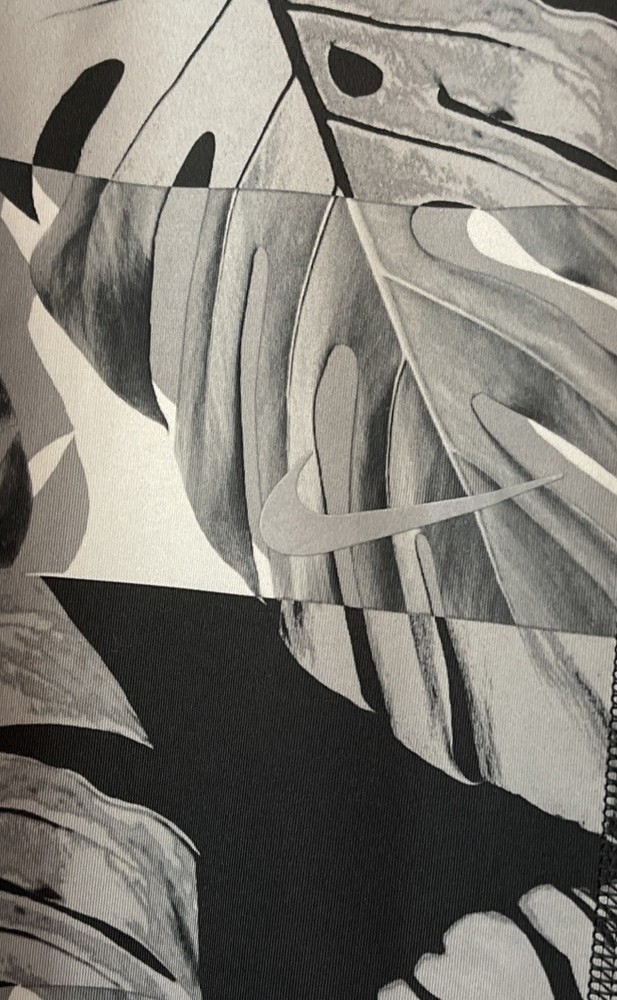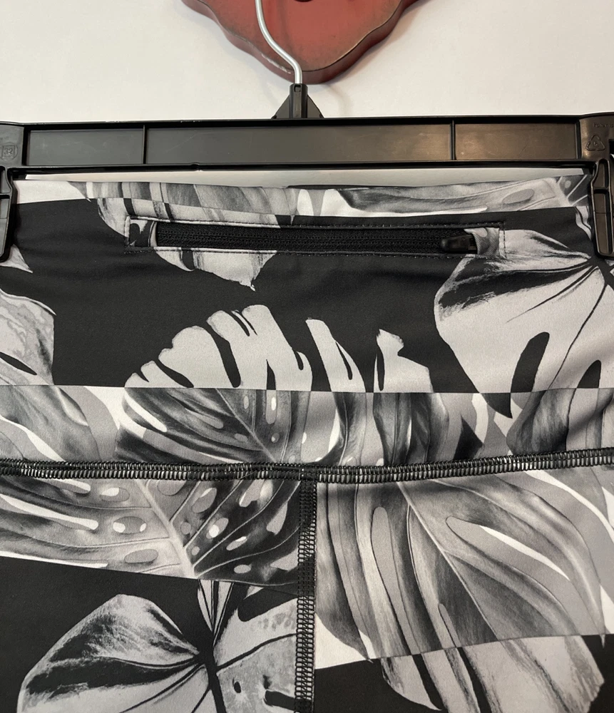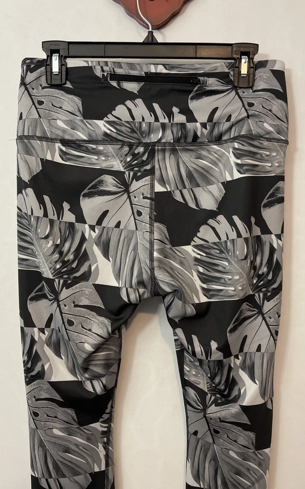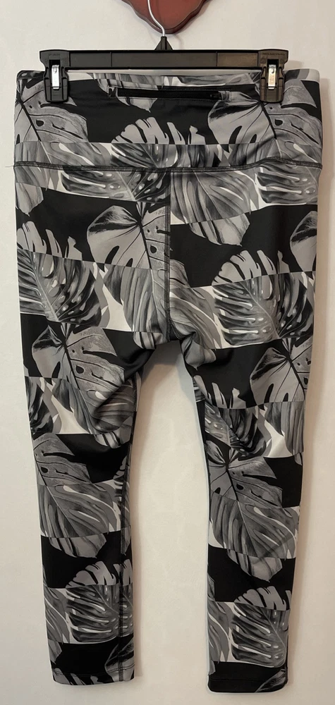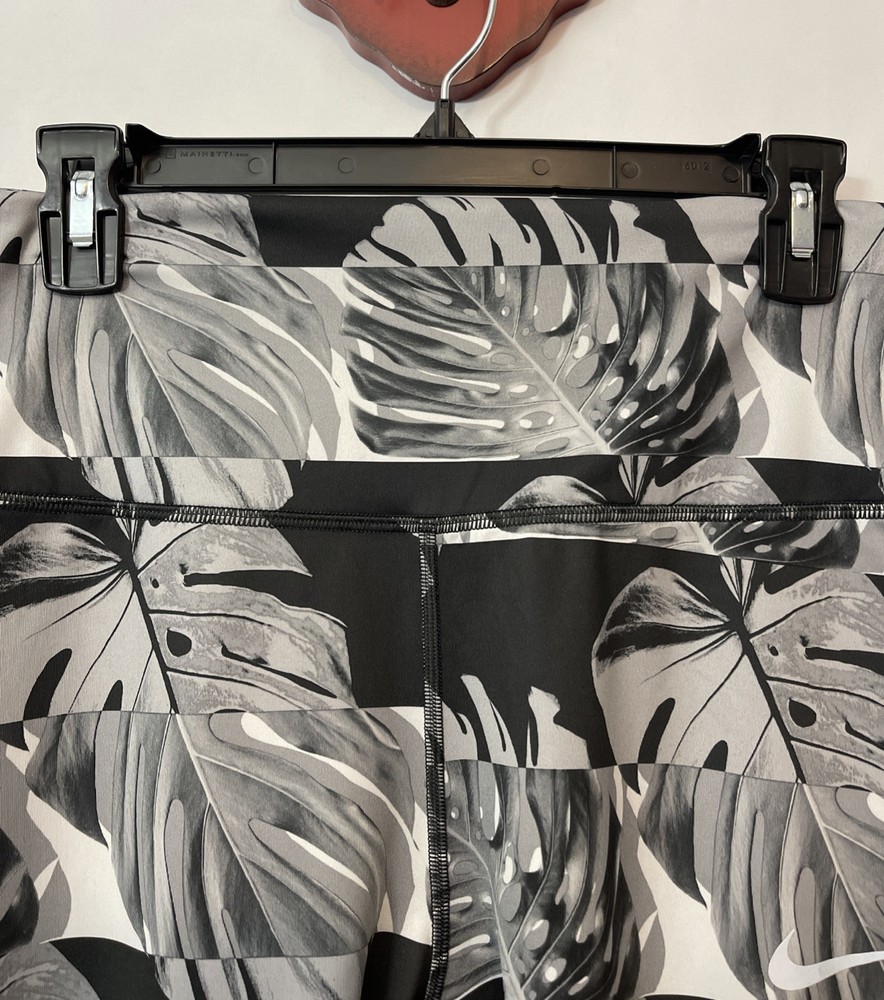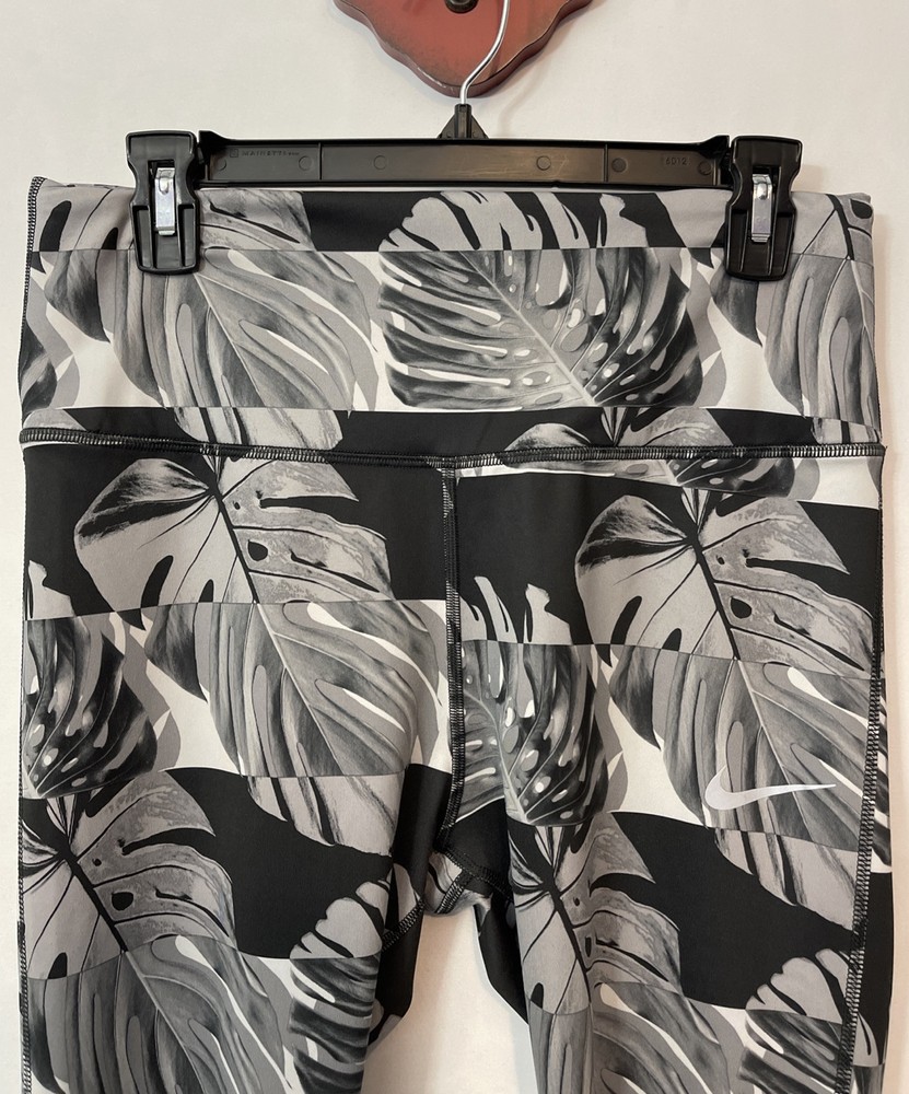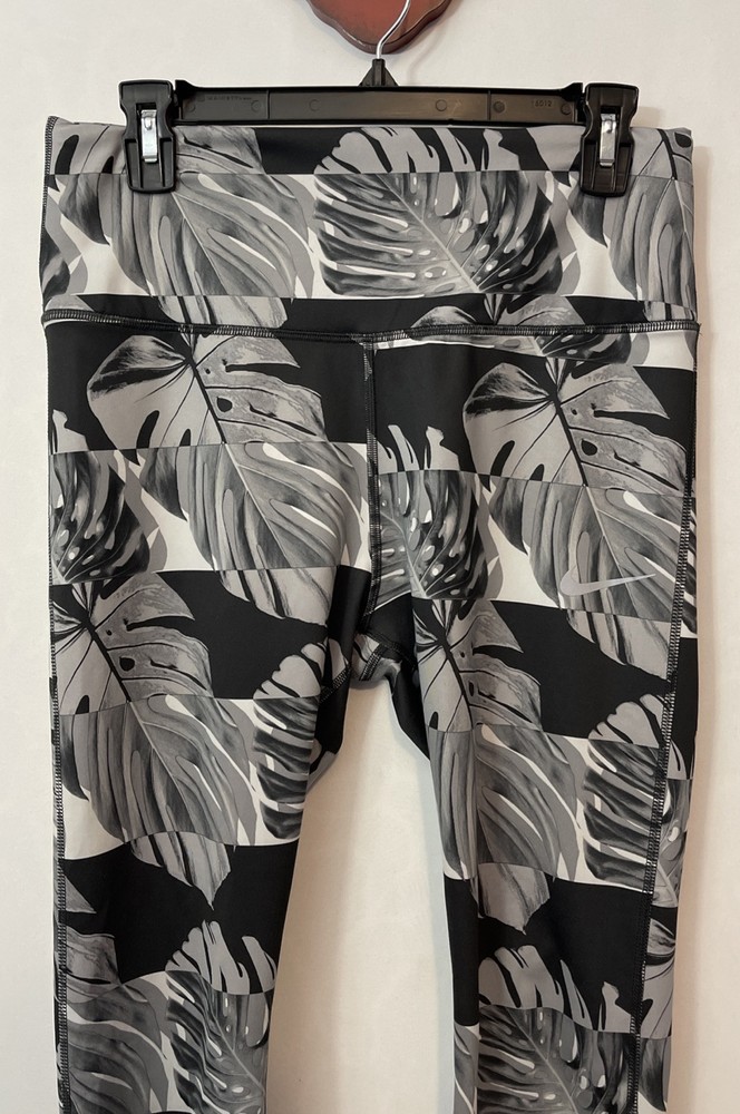 The Nike Dri-Fit Women's Capri Leggings in size large feature a stylish striped leaf-print design in black and gray. These athletic leggings have a pull-on closure and are made from a blend of polyester and spandex for a comfortable and stretchy fit. With compression areas on the buttocks, thighs, waist, legs, and abdomen, these leggings offer a fitted shaping and slimming benefit. They also include features such as an elastic waist, moisture-wicking technology, and a media pocket, along with an additional zip pocket on the back, making them suitable for activities like gym training, yoga, and running. Perfect for active women looking for both style and performance in their activewear. Inseam: 21 inches. Waist: 14.5 inches across laying flat.