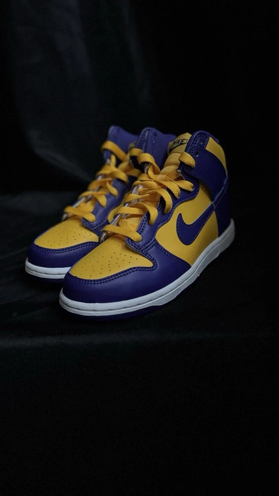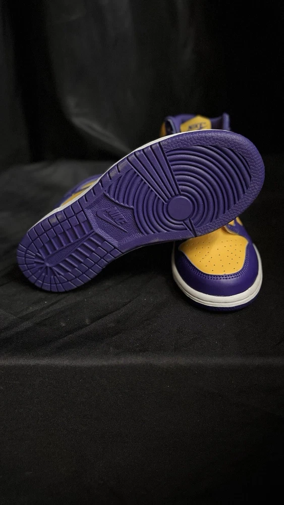 Step up your game with the Nike Dunk High Kids Size 1Y in the iconic Yellow Court Purple colorway, inspired by the legendary Lakers team. These stylish and comfortable high-top sneakers feature a premium design, perfect for young athletes and sneaker enthusiasts alike. Whether on the court or out on the streets, these shoes provide both performance and bold, standout style. Key Features: • Premium Materials: Crafted with high-quality leather and durable synthetic overlays for a smooth, premium feel. • Bold Colorway: Vibrant Yellow and Court Purple combination pays tribute to the Lakers’ iconic colors. • Classic Dunk High Design: High-top silhouette provides ankle support and a timeless, athletic look. • Comfortable Fit: Cushioned midsole for comfort and support throughout the day. • Durable Outsole: Rubber outsole with a classic herringbone pattern ensures excellent traction for both indoor and outdoor activities. • Perfect for Kids: Designed with young feet in mind for a comfortable, secure fit with easy-on laces. Specifications: • Model: Nike Dunk High • Size: 1Y (Youth) • Colorway: Yellow Court Purple • Style Code: DZ4455-500 • Condition: Brand New Condition: These Nike Dunk High shoes are brand new, unworn, and come in their original box. The shoes are in perfect condition with no signs of wear or damage. Give your young one a boost in both style and comfort with these Nike Dunk High Lakers-inspired high-top sneakers. Perfect for daily wear, sports, or as a standout addition to any sneaker collection!