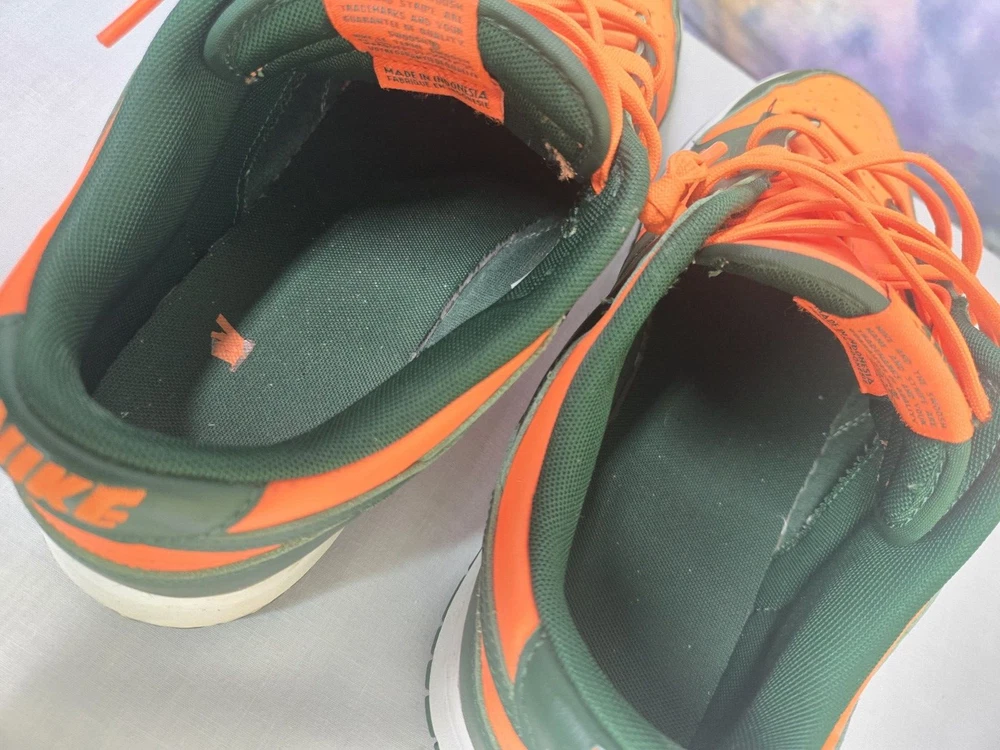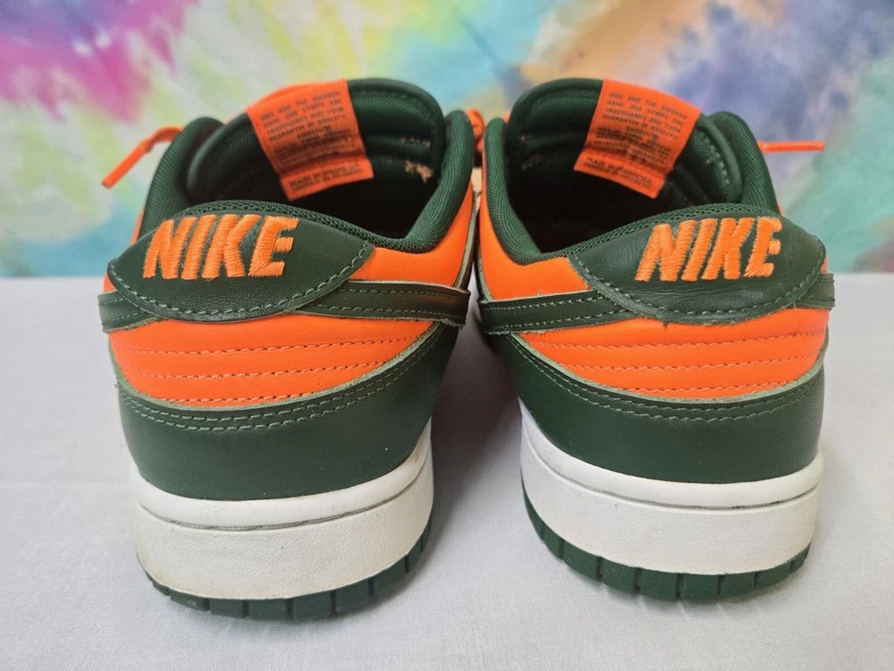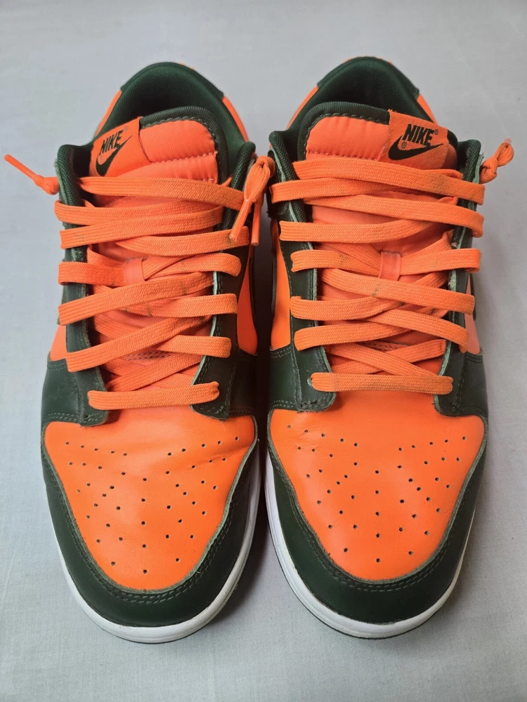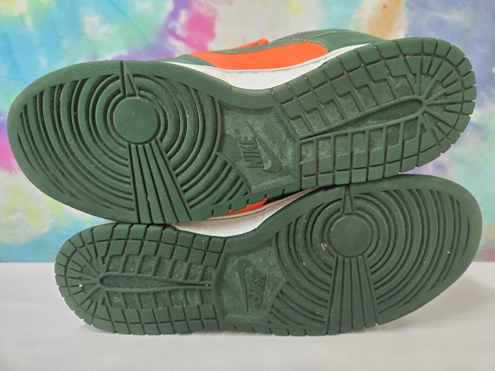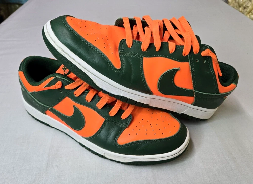 Elevate your sneaker game with these Nike Dunk Low Miami Hurricanes Gorge Green Orange Sneakers. The lace-up closure ensures a secure fit while the rubber outsole provides traction and durability. Made with breathable leather upper material and synthetic lining material, these sneakers are perfect for summer, fall, and spring seasons. The Nike Dunk Low sneakers are a must-have for any sneakerhead, whether you're going to school, skateboarding, or playing basketball. The colorblock pattern adds a touch of retro and university-themed design, with characters like Astro Boy, Boba Fett, and Steph Curry. These standard-width sneakers come in US shoe size 12 and UK shoe size 11, with an EU shoe size of 46. Get your hands on these Nike Dunk Low Miami Hurricanes Gorge Green Orange Sneakers now!
