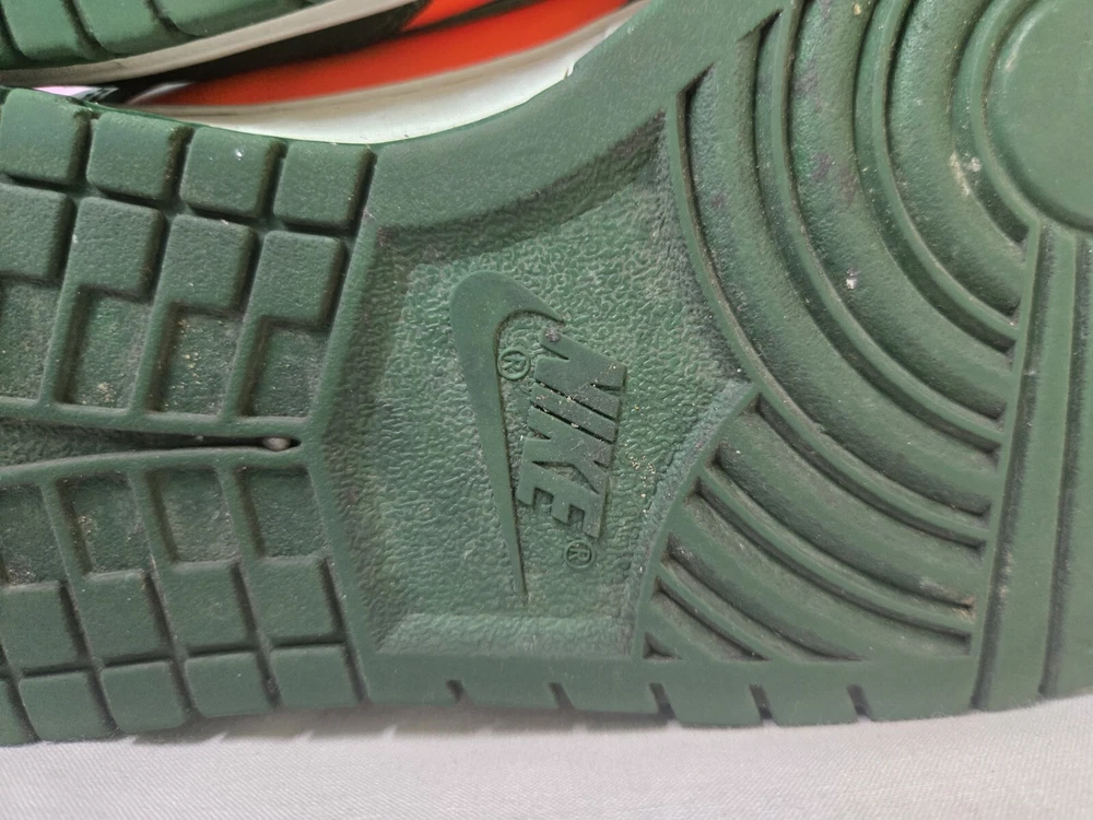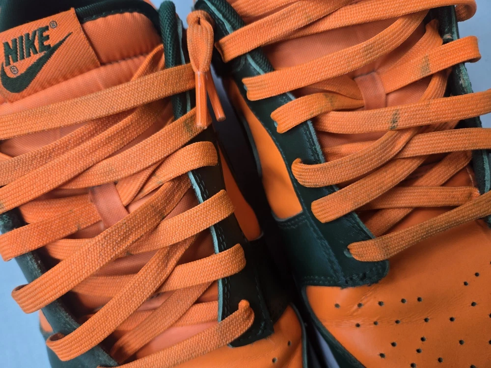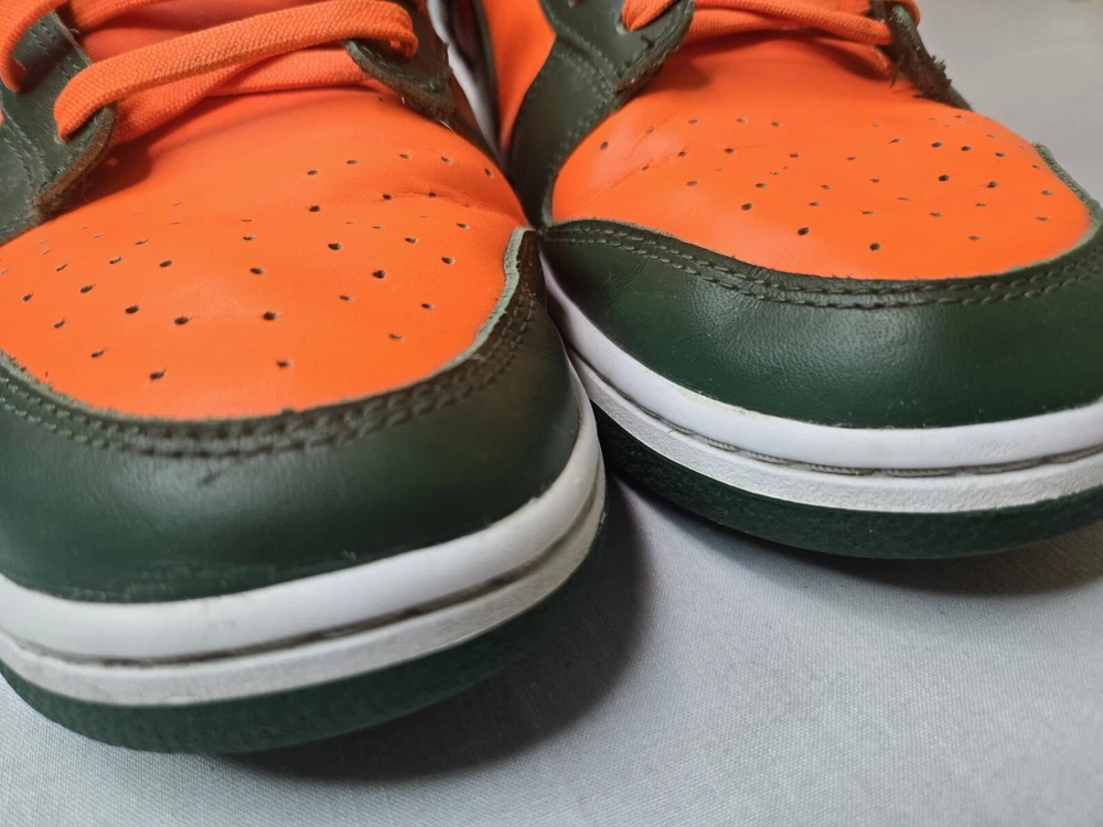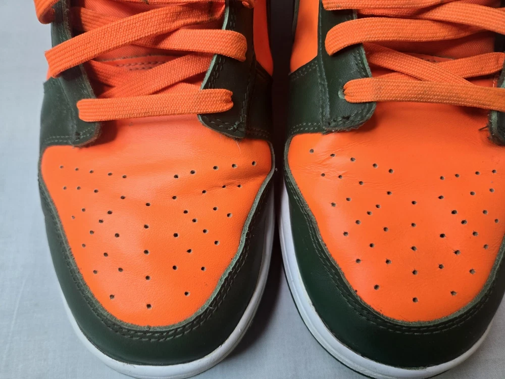 Elevate your sneaker game with these Nike Dunk Low Miami Hurricanes Gorge Green Orange Sneakers. The lace-up closure ensures a secure fit while the rubber outsole provides traction and durability. Made with breathable leather upper material and synthetic lining material, these sneakers are perfect for summer, fall, and spring seasons. The Nike Dunk Low sneakers are a must-have for any sneakerhead, whether you're going to school, skateboarding, or playing basketball. The colorblock pattern adds a touch of retro and university-themed design, with characters like Astro Boy, Boba Fett, and Steph Curry. These standard-width sneakers come in US shoe size 12 and UK shoe size 11, with an EU shoe size of 46. Get your hands on these Nike Dunk Low Miami Hurricanes Gorge Green Orange Sneakers now!