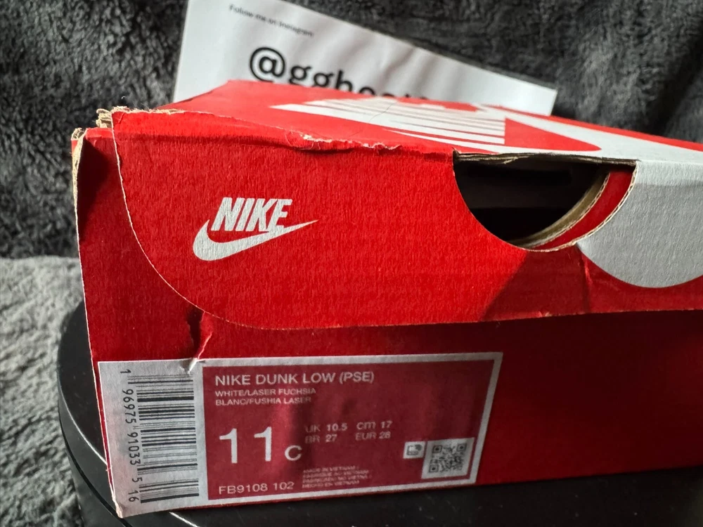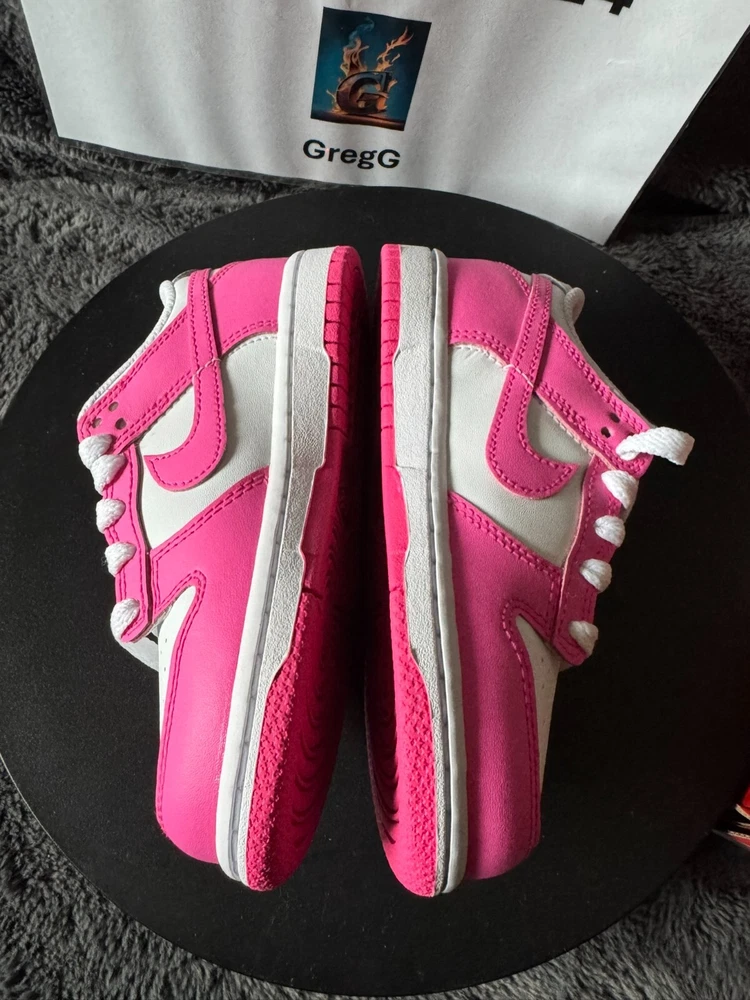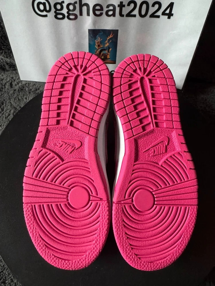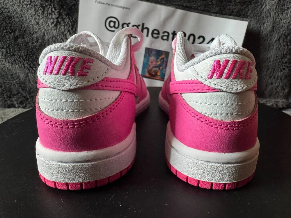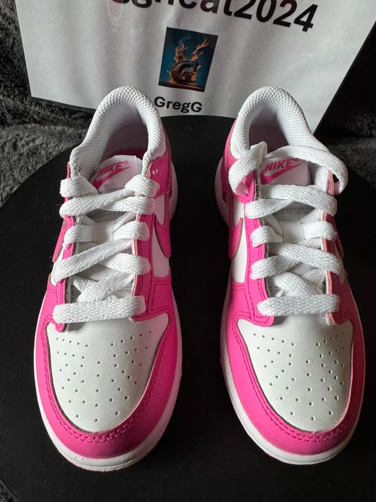 New with box. The Nike Dunk Low Retro Fuchsia Pink/White Toddler Sneakers in size 11C are a stylish choice for young kids. These athletic sneakers feature a lace-up closure for a secure fit and are designed in a vibrant pink color with white accents. The upper material is made of leather, providing durability and comfort. The Nike Dunk Low model offers a classic sneaker style that is both fashionable and functional for everyday wear, suitable for both boys and girls.