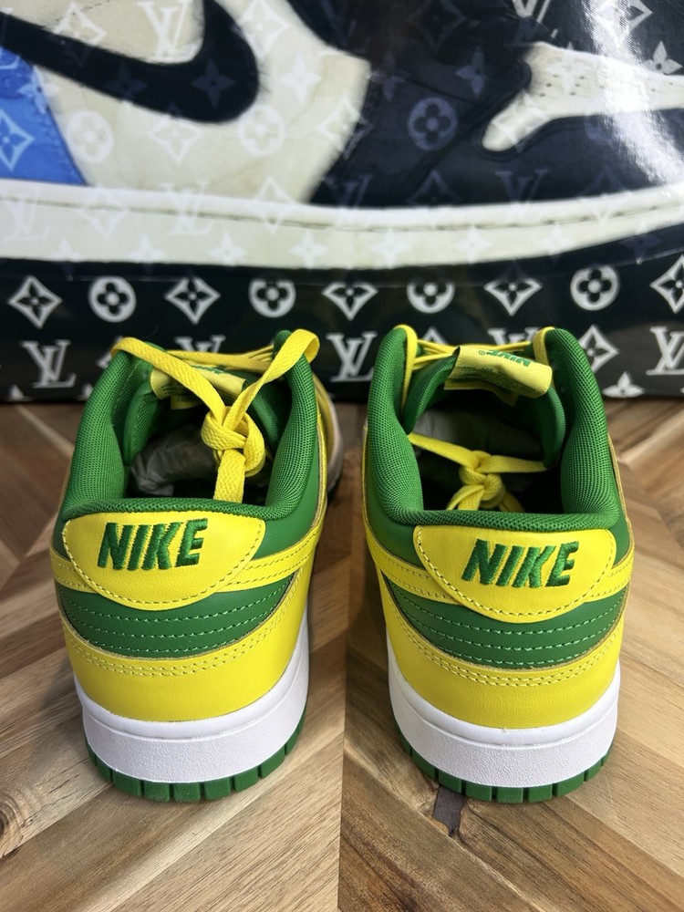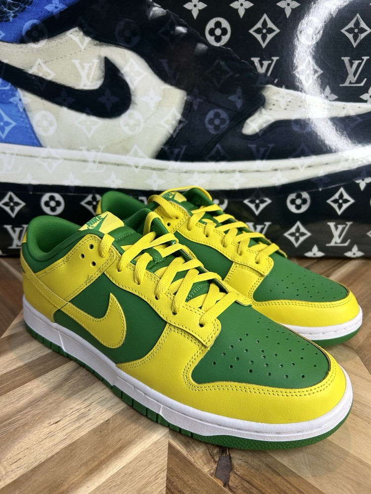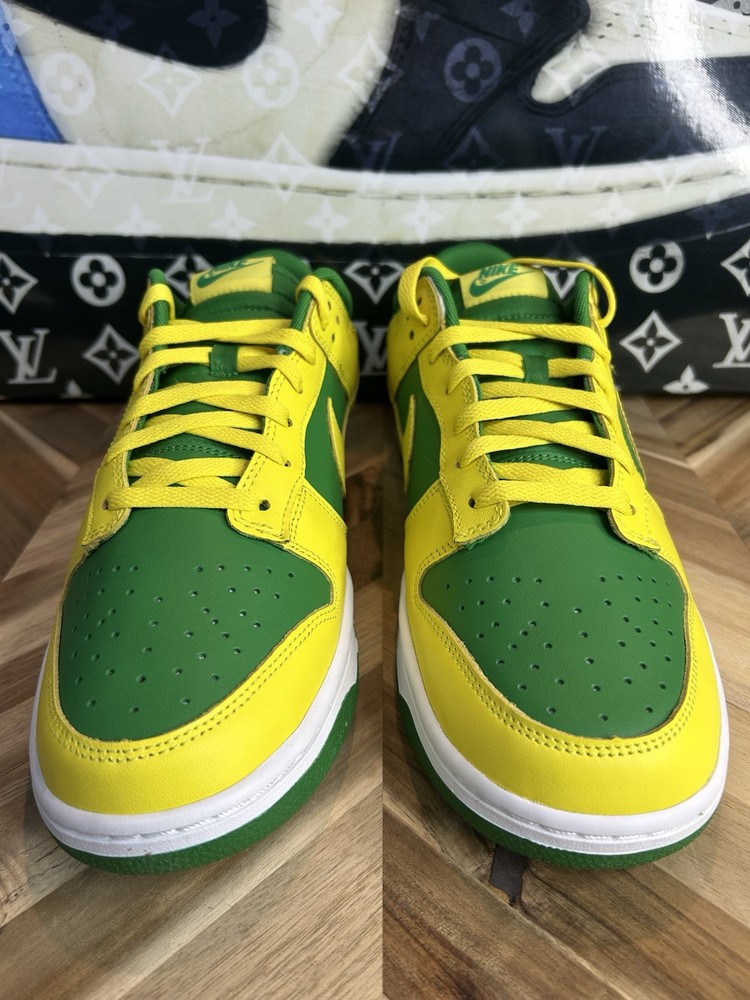 Step up your sneaker game with these limited edition Nike Dunk Low Reverse Brazil Premium Oregon Ducks DV0833 300 sneakers. Designed for men, these athletic shoes are perfect for walking, skateboarding, or basketball. The sleek green color with yellow strike-white accents and apple green/yellow strike-white manufacturer color make for a stylish addition to any outfit. Crafted from high-quality leather, these sneakers are both lightweight and comfortable, featuring a standard shoe width and a low-top shoe shaft style. The Nike Dunk Low sneakers are perfect for college and NCAA fans, with a nod to the Mighty Ducks theme. Don't miss out on the chance to own these rare, sold-out sneakers, a must-have for any sneakerhead collection.