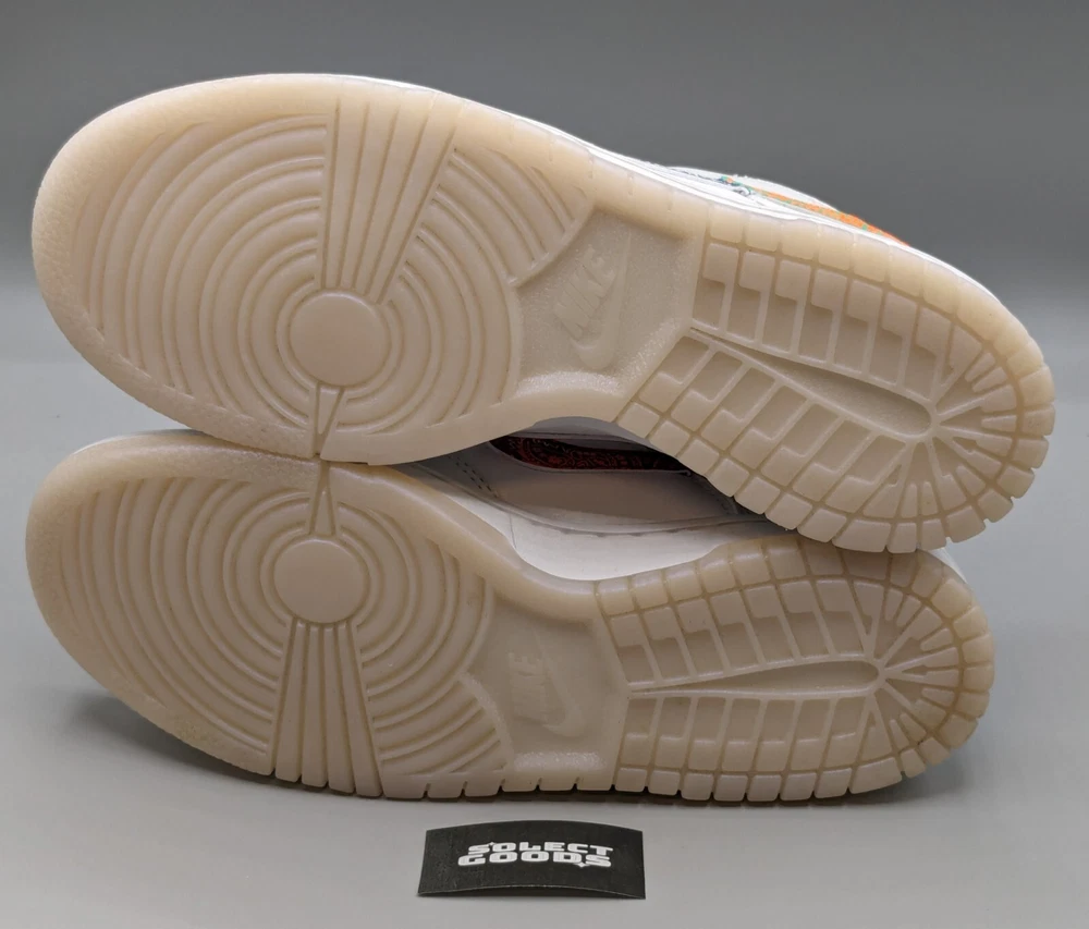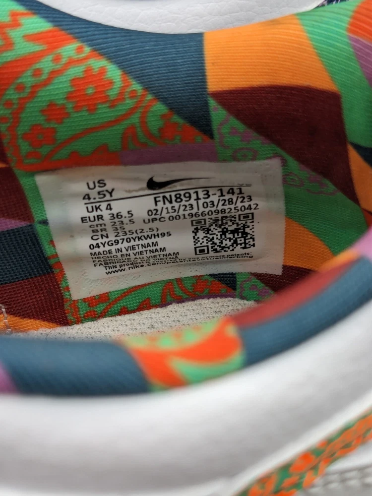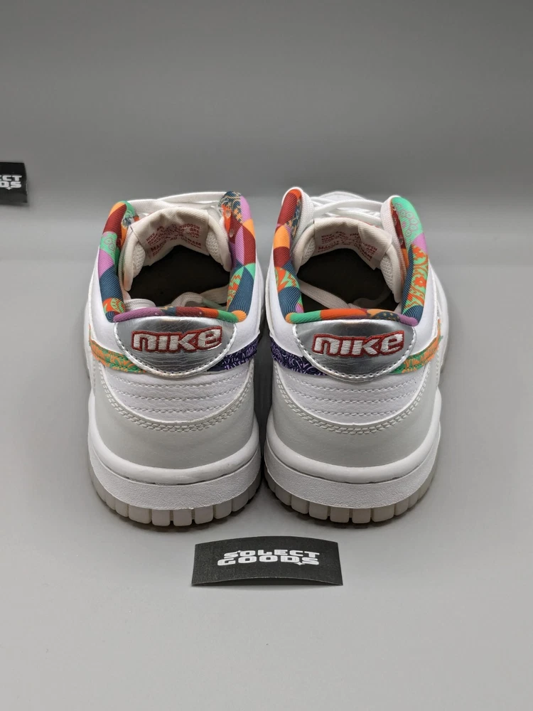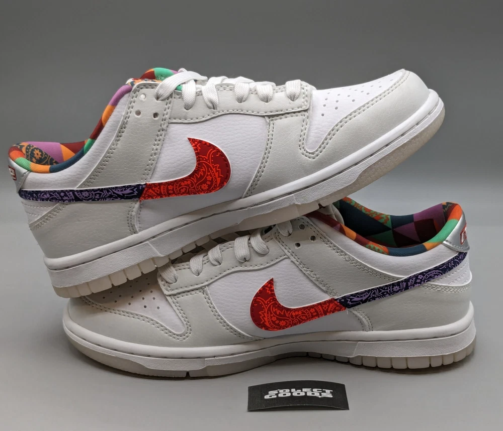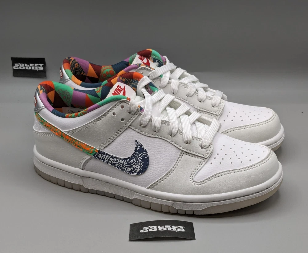 Nike Dunk Low Sneakers. Style code: FN8913-141. Pre-owned but in great condition! Light wear as shown on soles. Comes in White, Multi-Color Paisley and Size 4.5Y or Women's Size 6 (shoe tag will show 4.5y). Complete with the original box. The shoe box has some damage as shown in the photos.