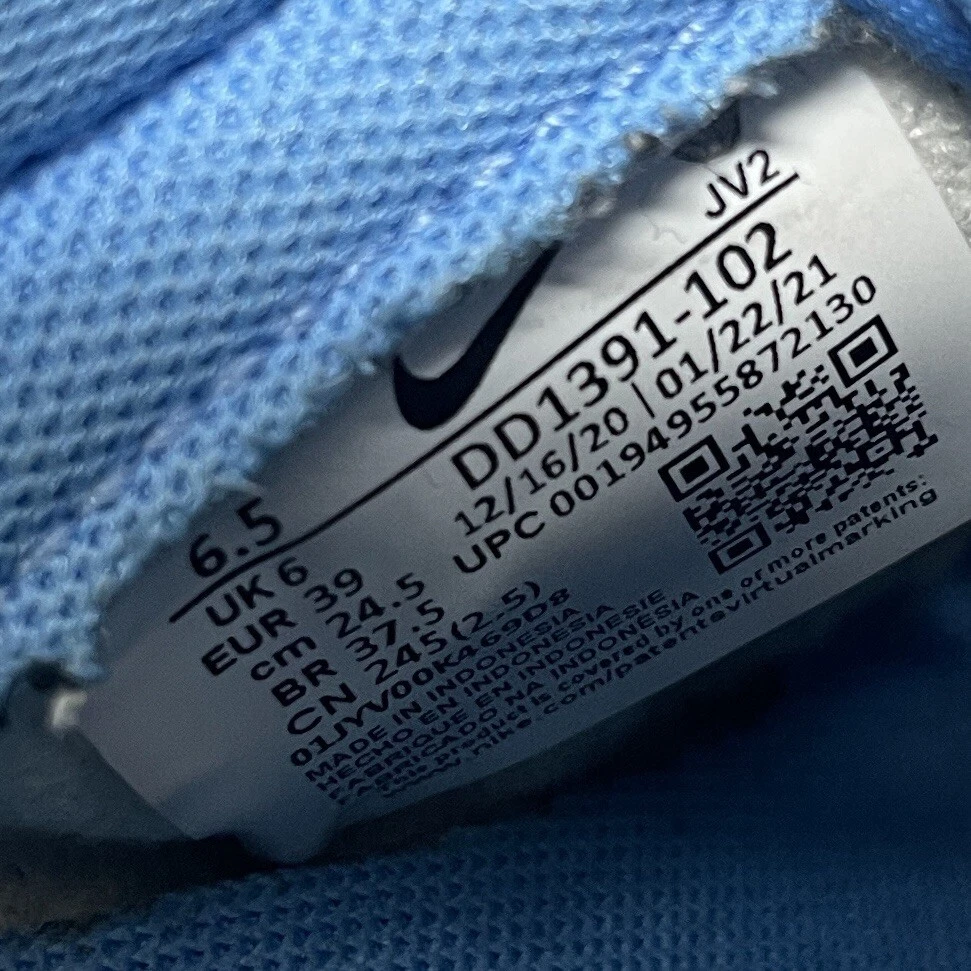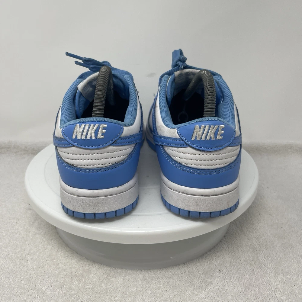 The Nike Dunk Low UNC University Blue Shoes are unisex sneakers featuring a low-top design in a solid blue color with the iconic Nike logo accents. These athletic shoes have a lace-up closure and are crafted with leather uppers and fabric lining for comfort. They are designed for various activities such as boxing, CrossFit, and basketball, offering arch support, cushioning, and a rubber outsole for enhanced performance. The sneakers are part of the Nike Dunk product line and have a stylish university theme, making them a colorful and versatile choice for both men and women. MENS 6.5 / WOMENS 8