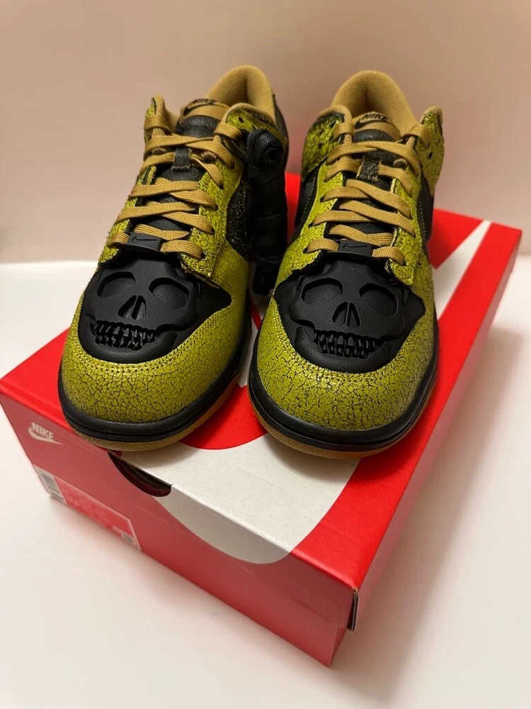 Get ready to add some spooky style to your sneaker collection with these Nike Dunk Retro Low Halloween Skull sneakers. These shoes feature a green colorway with a skull theme, perfect for the spooky season. The low-top shoe shaft style and athletic type make them ideal for casual wear or for hitting the gym. These Nike Dunks are made for men and come in US shoe size 11. The skull theme adds a touch of edginess to the design, making them a statement piece. These sneakers are part of the Nike Dunk product line and are perfect for any sneakerhead looking to add a unique touch to their wardrobe.