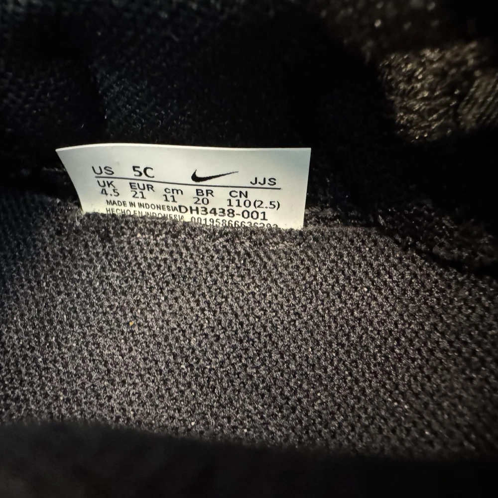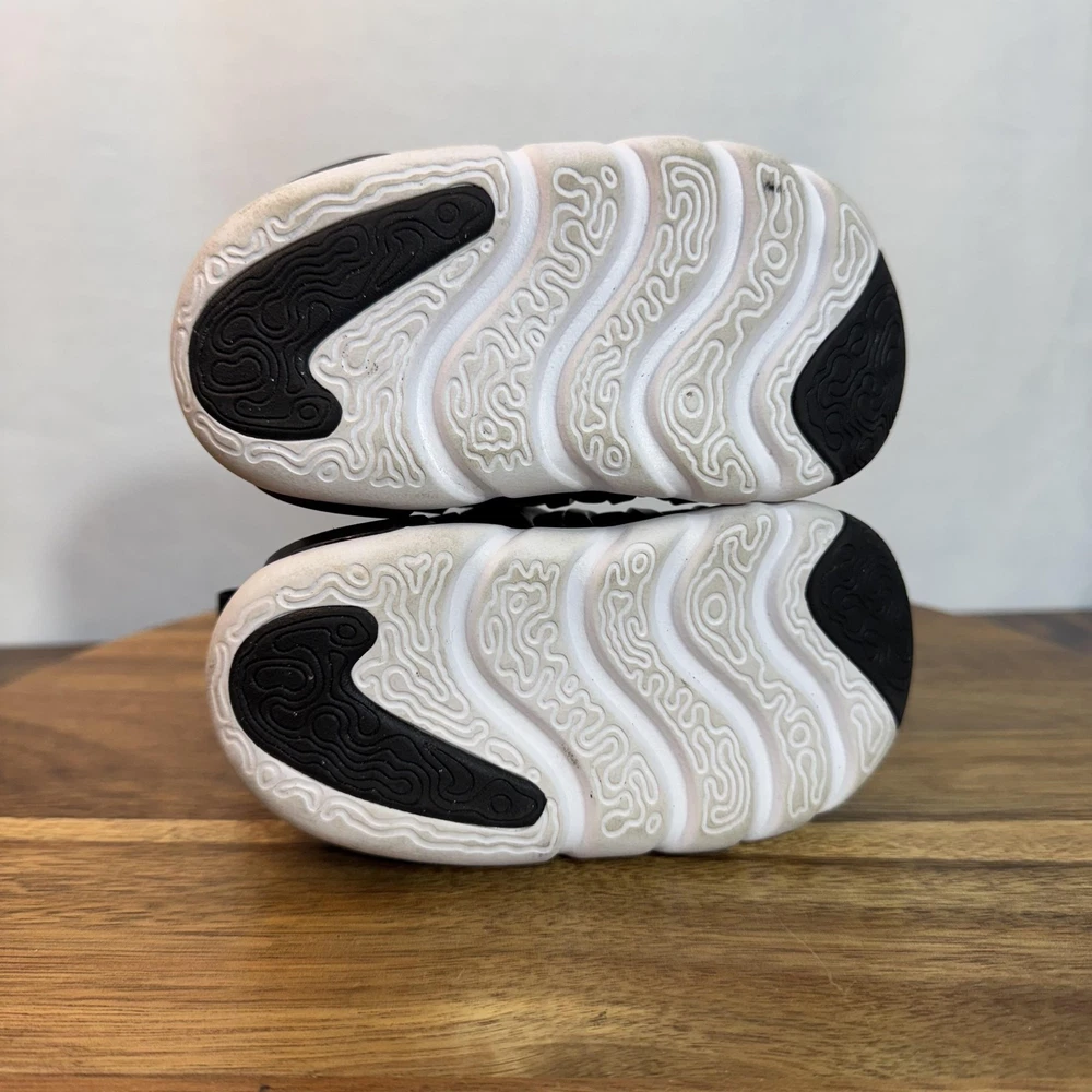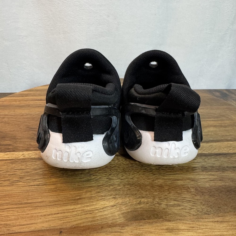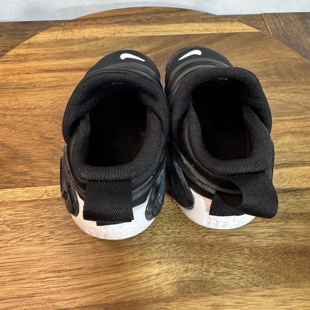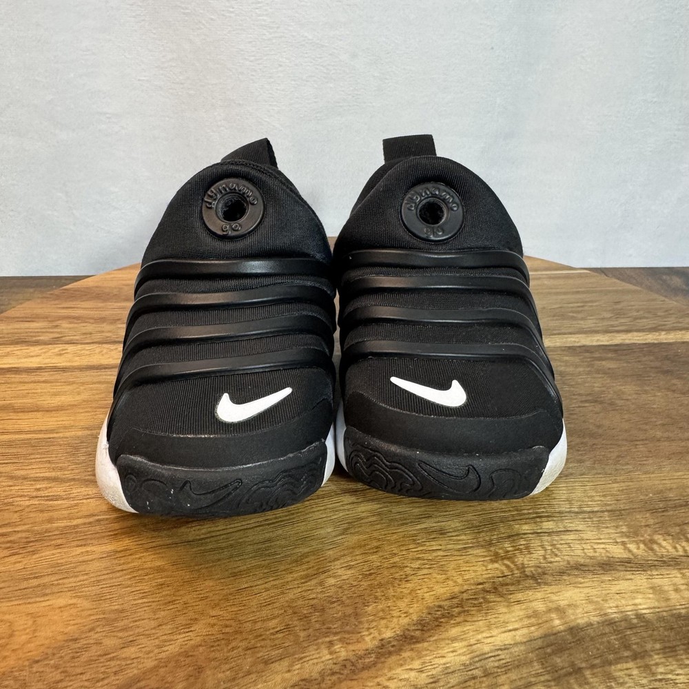 Brand: Nike Style: Dynamo Go slip-on toddler shoes with sculpted foam sole and wave-like rubber overlays. Color: Black upper with white midsole and outsole, black and white Nike Swoosh logos. Size on tag: US 5C; UK 4.5; EUR 21; CM 11; BR 20; CN 110(2.5). Style/Model code: H3438-001 (per inner tag). Details: Easy-on collapsible heel with pull tabs, cushioned textile lining, flexible podded outsole for traction, lightweight everyday sneaker design.