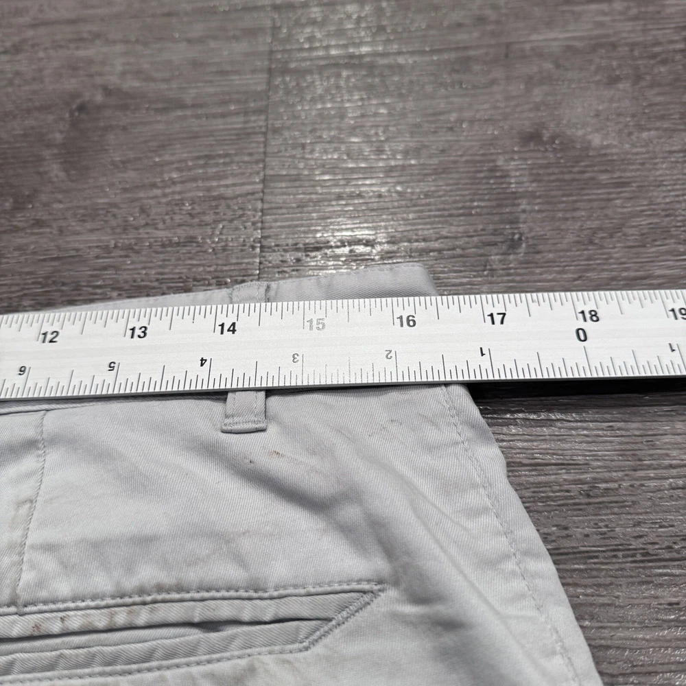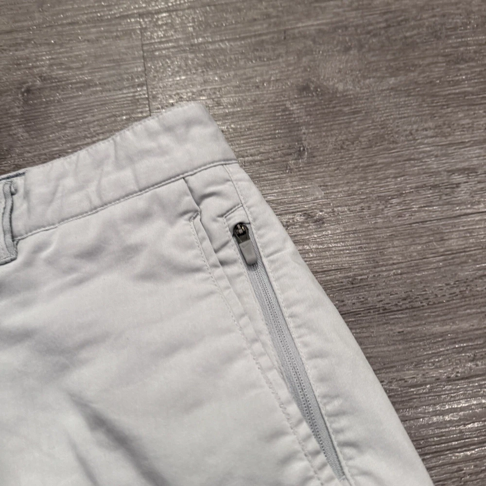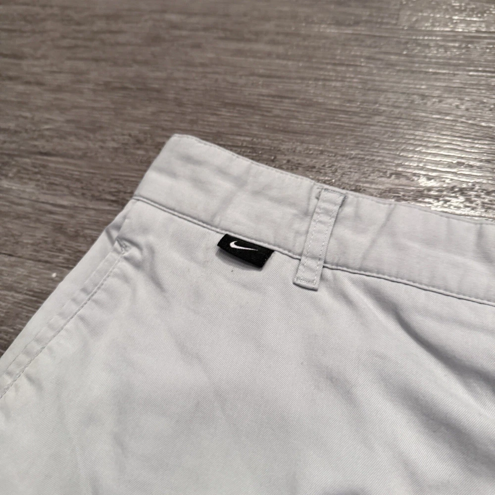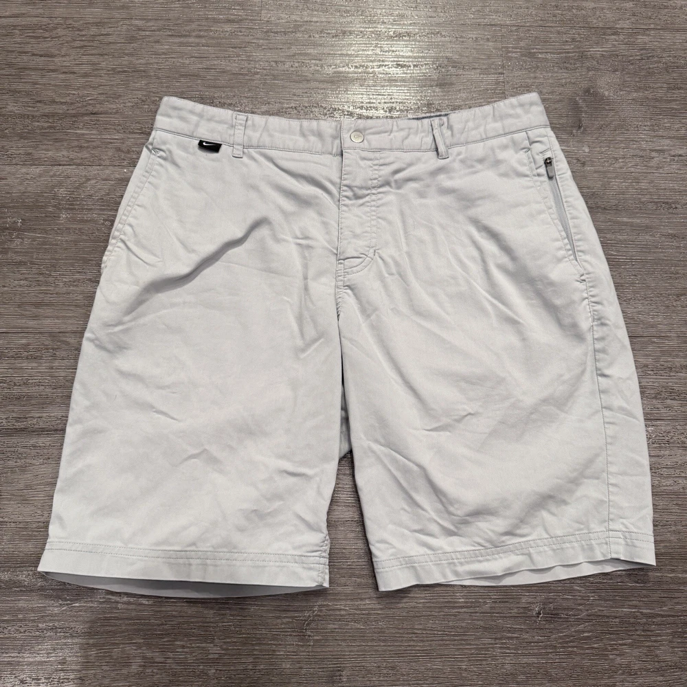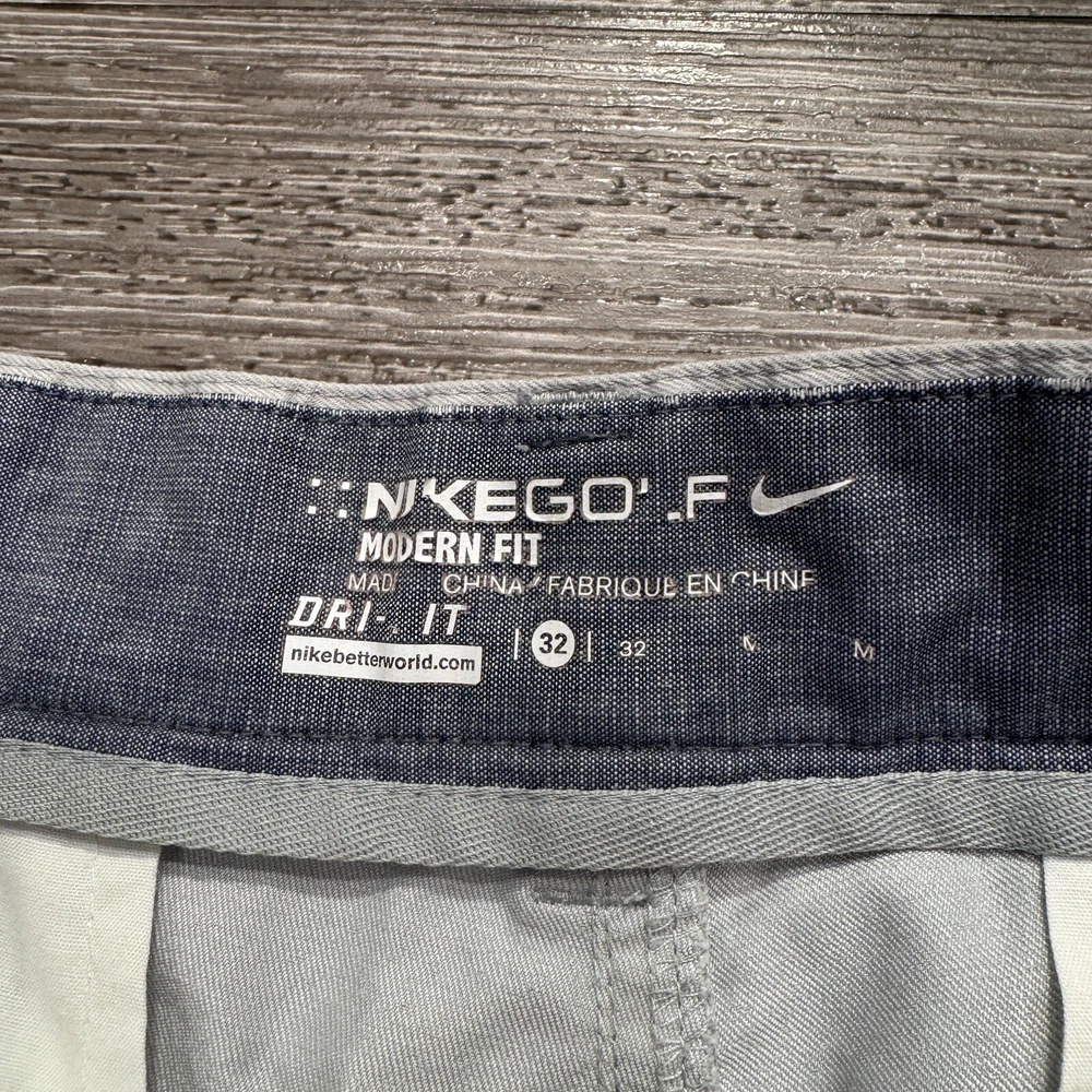 Inseam: 10 in Style: Chino Size: 32 Closure: Zip Country/Region of Manufacture: China gtin13: Does Not apply Vintage: No Pocket Type: Slash Pocket Color: Gray Size Type: Regular Occasion: Casual Material: Polyester, Spandex Features: Stretch Department: Men Theme: Golf Handmade: No UPC: Does Not apply Rise: Mid (10-12 in) Fabric Type: Knit Pattern: Solid Fit: Regular Front Type: Flat Front Accents: Embroidered Garment Care: Machine Washable Season: Fall, Spring, Summer Fabric Wash: Medium Brand: Nike Waist Size: 32 in