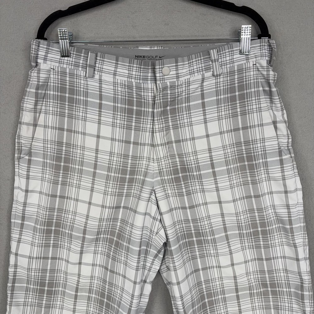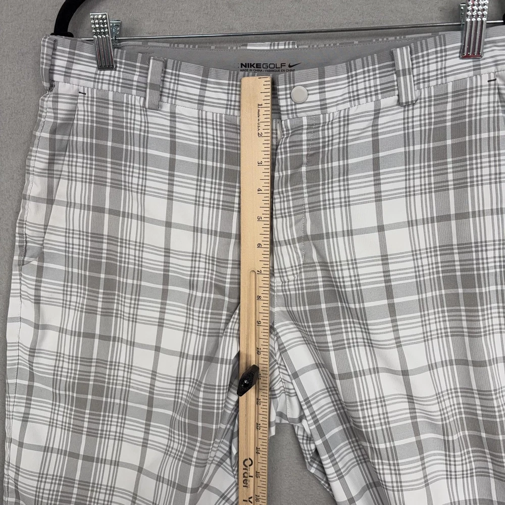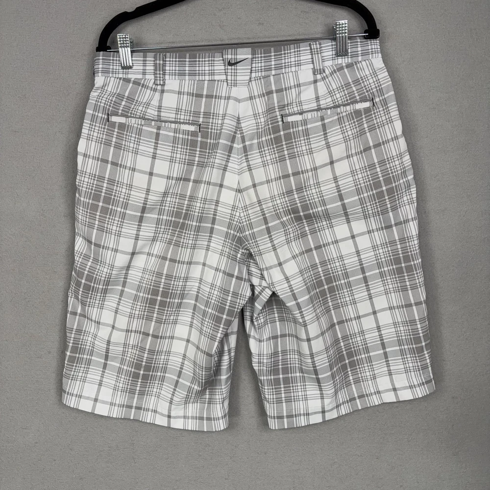 Nike Golf Shorts Mens 32 Gray Plaid Dri-FIT Performance Golf Stretch Chino Small spot on front. Lightly worn Nike Golf shorts with crisp plaid pattern. No holes, or snags; zipper, button, and pockets all functional. Inner care tags present; original retail tags not included. Brand: Nike Golf Style: Mens athletic golf shorts with gray and white plaid pattern and flat-front design. Color: Gray and white plaid; department: Men. Materials: 96% polyester, 4% spandex Dri-FIT moisture-wicking stretch fabric; made in China. Tag size: 32 (mens regular fit). Details: Belt loops, zip fly with button closure, front slant hand pockets, back welt pockets with trim, breathable quick-dry performance fabric suitable for golf or casual wear. Branding and codes: Nike Swoosh logo at back belt loop; inner waistband printed NIKEGOLF and DRI-FIT; inner tag codes SP14 0812HKC and 643379-100; RN 56323 | CA 05553. 24130 Measurements: Previous washings may change sizing on the tag. Refer to photos above for all measurements. Compare our measurements to one of your favorite garments. Measurements are approximate. All items are bagged and sealed after being photographed, then stored in a smoke free environment. Washed per eBay standards. I carefully package and ship daily. Contact me with any questions. Thanks