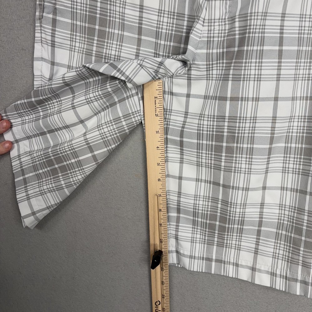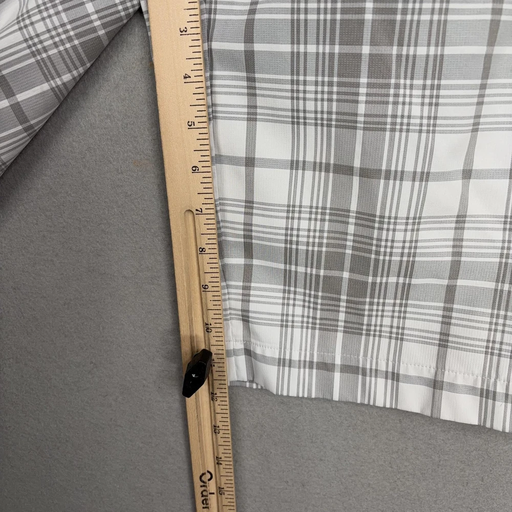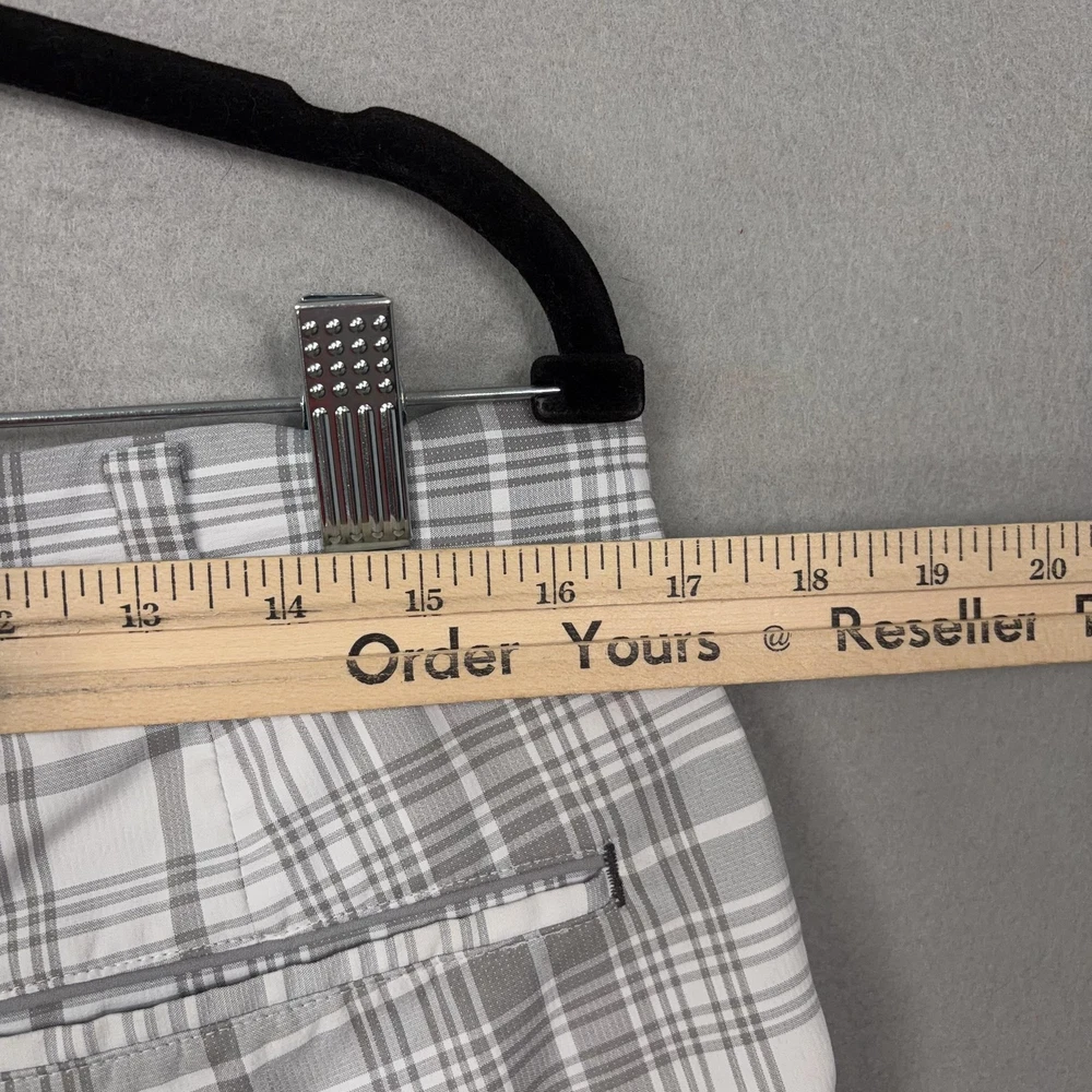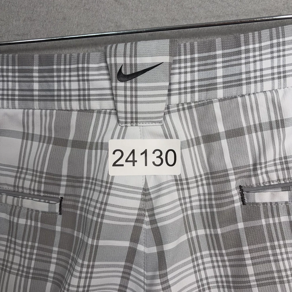 Nike Golf Shorts Mens 32 Gray Plaid Dri-FIT Performance Golf Stretch Chino Small spot on front. Lightly worn Nike Golf shorts with crisp plaid pattern. No holes, or snags; zipper, button, and pockets all functional. Inner care tags present; original retail tags not included. Brand: Nike Golf Style: Mens athletic golf shorts with gray and white plaid pattern and flat-front design. Color: Gray and white plaid; department: Men. Materials: 96% polyester, 4% spandex Dri-FIT moisture-wicking stretch fabric; made in China. Tag size: 32 (mens regular fit). Details: Belt loops, zip fly with button closure, front slant hand pockets, back welt pockets with trim, breathable quick-dry performance fabric suitable for golf or casual wear. Branding and codes: Nike Swoosh logo at back belt loop; inner waistband printed NIKEGOLF and DRI-FIT; inner tag codes SP14 0812HKC and 643379-100; RN 56323 | CA 05553. 24130 Measurements: Previous washings may change sizing on the tag. Refer to photos above for all measurements. Compare our measurements to one of your favorite garments. Measurements are approximate. All items are bagged and sealed after being photographed, then stored in a smoke free environment. Washed per eBay standards. I carefully package and ship daily. Contact me with any questions. Thanks