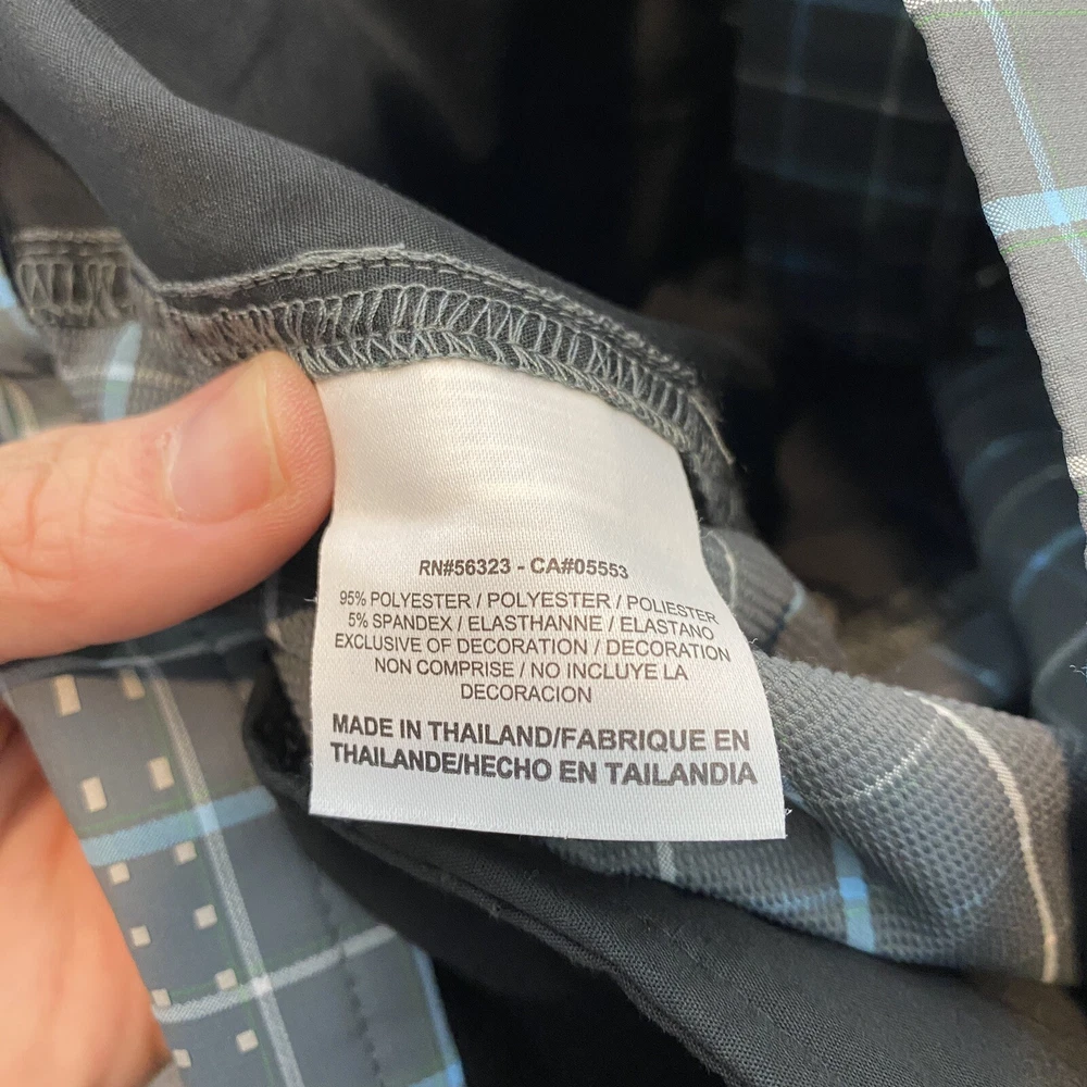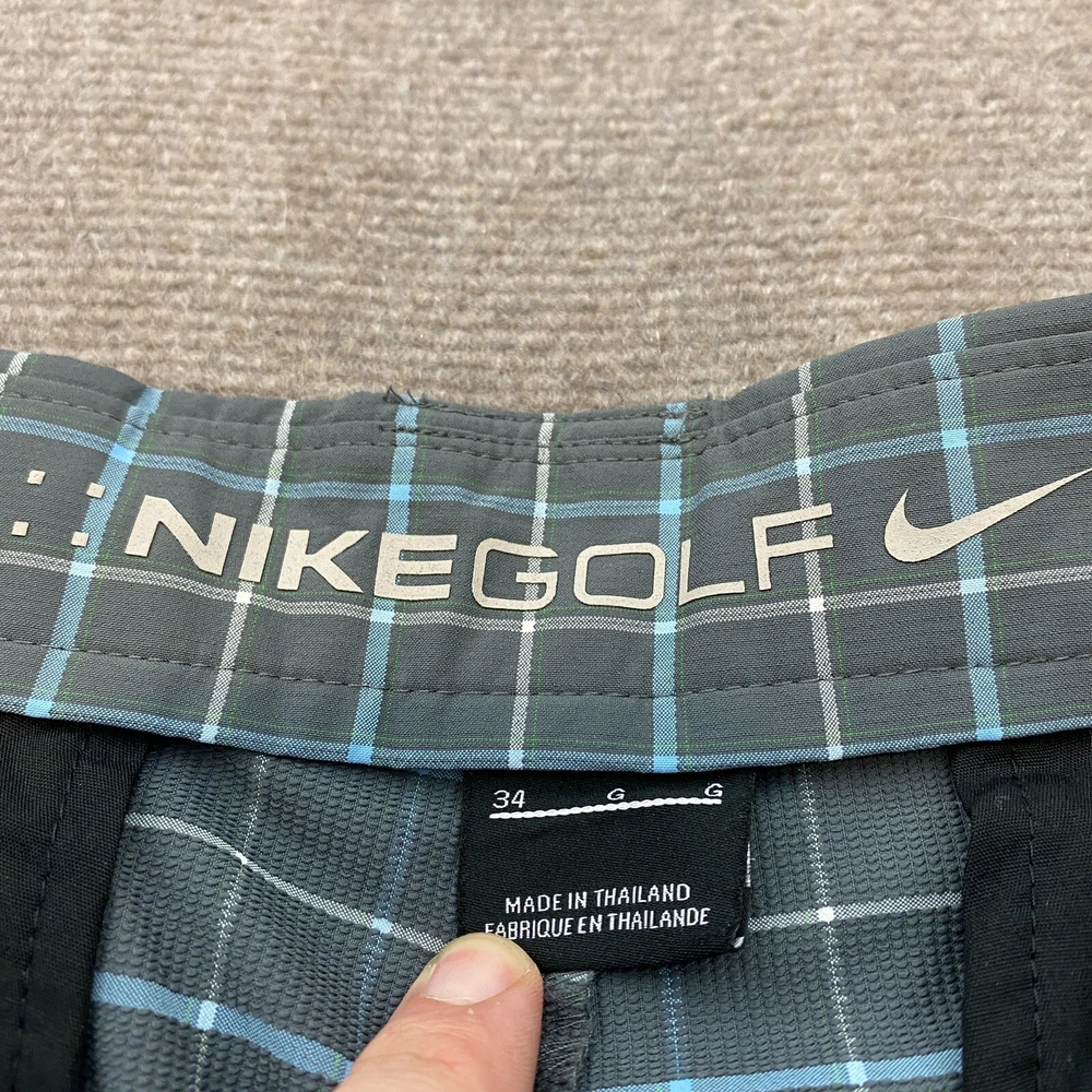 Closure: Zip Theme: Outdoor Style: Chino Fit: Regular Department: Men Fabric Type: Microfiber Vintage: No Material: Polyester, Spandex Features: Stretch Brand: Nike Fabric Wash: Dark Front Type: Flat Front Accents: Logo Waist Size: 34 in Character: Golfer Size Type: Regular Size: 34 Pattern: Plaid Country/Region of Manufacture: China Occasion: Casual Color: Multicolor