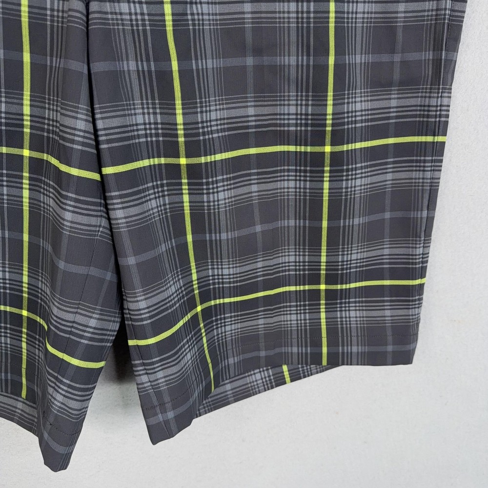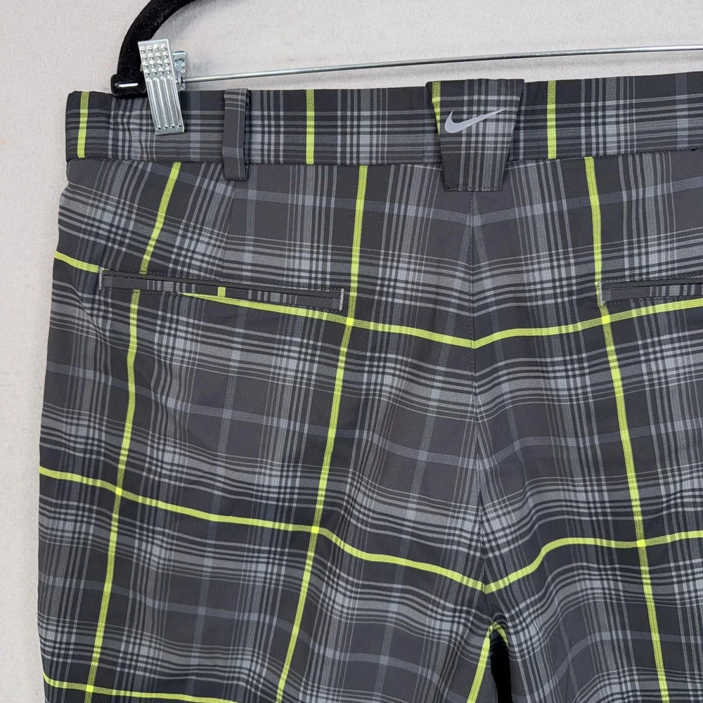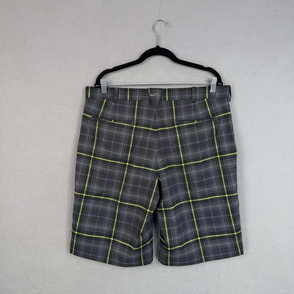 Nike Golf Shorts Mens 36 Gray Plaid Dri-FIT Performance Stretch Golf Chino Pre-owned Nike Golf Dri-FIT shorts with light overall wear from prior use. Fabric is clean and intact with no holes, stains, or fraying; plaid pattern and performance material maintain even color and stretch. Waistband, zipper fly, button closure, and pockets are fully functional with no damage; interior size and content tags are present, and there is no original packaging or retail tags included. Brand: Nike Golf. Style: Mens athletic golf shorts. Color: Gray base with tonal plaid pattern accented by bright chartreuse lines. Size: Mens 36 per interior waistband label. Material: Polyester and spandex blend per interior content tag. Fabric type: Lightweight woven performance fabric with a smooth handfeel and built-in stretch for ease of movement. Details: Flat front design with belt loops, zip fly with button closure, front slant hand pockets, and back welt pockets. Features: Dri-FIT moisture wicking technology, flexible stretch fabrication, and breathable construction designed for comfort during active wear and golf. Branding and logos: Nike Golf printed interior waistband branding, small Swoosh logo at the back belt loop, and interior care/content tags. Country of origin: Made in China as stated on the interior tag. Tag information: Interior labels list polyester/spandex fabrication, Dri-FIT performance technology, care instructions, and style code 408347-010 on the care label. Intended use: Ideal for golf, practice sessions, and casual warm-weather outfits on and off the course. Special notes: Performance plaid golf shorts that combine classic course-ready styling with modern moisture-wicking comfort. 25414 Measurements: Previous washings may change sizing on the tag. Refer to photos above for all measurements. Compare our measurements to one of your favorite garments. Measurements are approximate. All items are bagged and sealed after being photographed, then stored in a smoke free environment. Washed per eBay standards. I carefully package and ship daily. Contact me with any questions. Thanks
