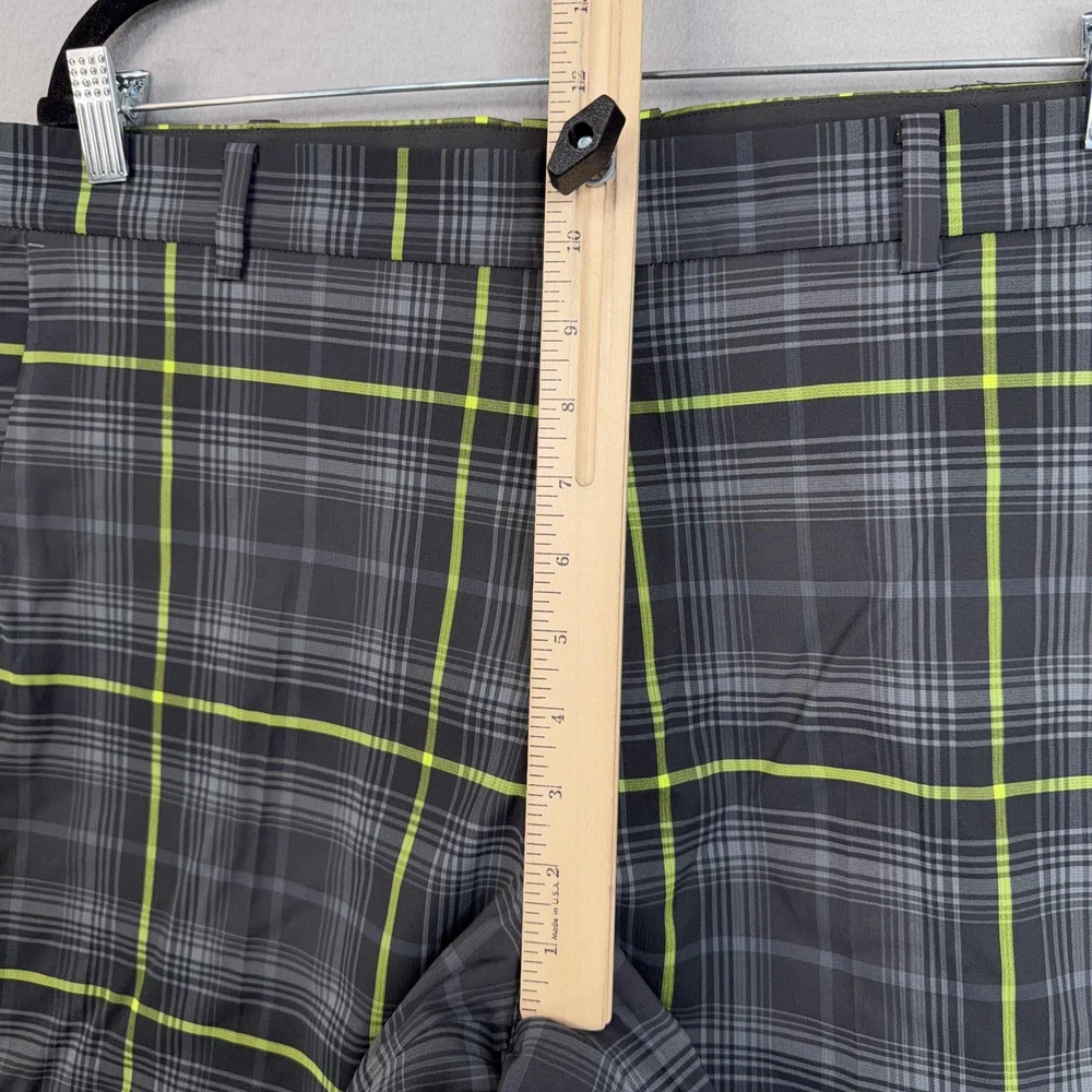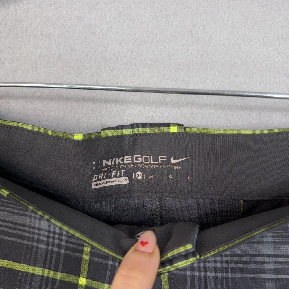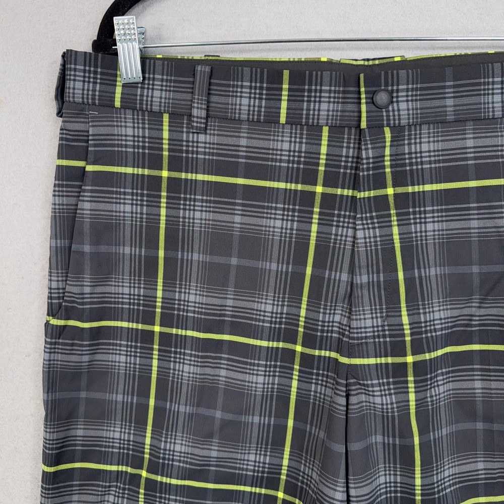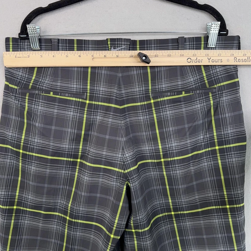 Nike Golf Shorts Mens 36 Gray Plaid Dri-FIT Performance Stretch Golf Chino Pre-owned Nike Golf Dri-FIT shorts with light overall wear from prior use. Fabric is clean and intact with no holes, stains, or fraying; plaid pattern and performance material maintain even color and stretch. Waistband, zipper fly, button closure, and pockets are fully functional with no damage; interior size and content tags are present, and there is no original packaging or retail tags included. Brand: Nike Golf. Style: Mens athletic golf shorts. Color: Gray base with tonal plaid pattern accented by bright chartreuse lines. Size: Mens 36 per interior waistband label. Material: Polyester and spandex blend per interior content tag. Fabric type: Lightweight woven performance fabric with a smooth handfeel and built-in stretch for ease of movement. Details: Flat front design with belt loops, zip fly with button closure, front slant hand pockets, and back welt pockets. Features: Dri-FIT moisture wicking technology, flexible stretch fabrication, and breathable construction designed for comfort during active wear and golf. Branding and logos: Nike Golf printed interior waistband branding, small Swoosh logo at the back belt loop, and interior care/content tags. Country of origin: Made in China as stated on the interior tag. Tag information: Interior labels list polyester/spandex fabrication, Dri-FIT performance technology, care instructions, and style code 408347-010 on the care label. Intended use: Ideal for golf, practice sessions, and casual warm-weather outfits on and off the course. Special notes: Performance plaid golf shorts that combine classic course-ready styling with modern moisture-wicking comfort. 25414 Measurements: Previous washings may change sizing on the tag. Refer to photos above for all measurements. Compare our measurements to one of your favorite garments. Measurements are approximate. All items are bagged and sealed after being photographed, then stored in a smoke free environment. Washed per eBay standards. I carefully package and ship daily. Contact me with any questions. Thanks