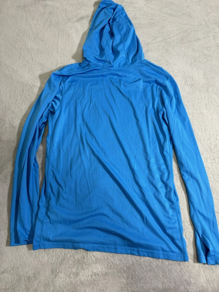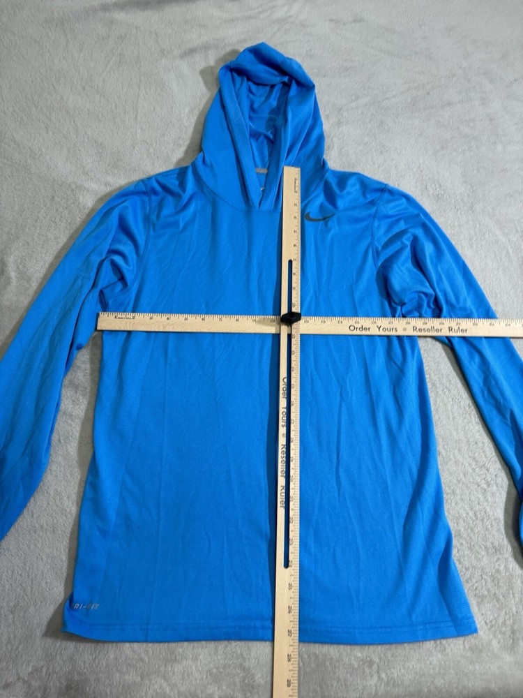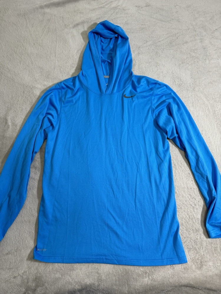 Elevate your activewear game with this Nike hooded shirt in blue, designed for men in size small. The shirt features long sleeves and a pullover closure, making it perfect for gym and training sessions or running and jogging. Made of 100% polyester, the shirt is crafted with Nike's signature Dri-Fit technology to keep you dry and comfortable during intense workouts. The athletic fit and touch training style of this shirt make it a must-have for any serious fitness enthusiast. The Nike Dri-Fit model is known for its high-quality and performance-driven features, making this shirt a reliable addition to your activewear collection.