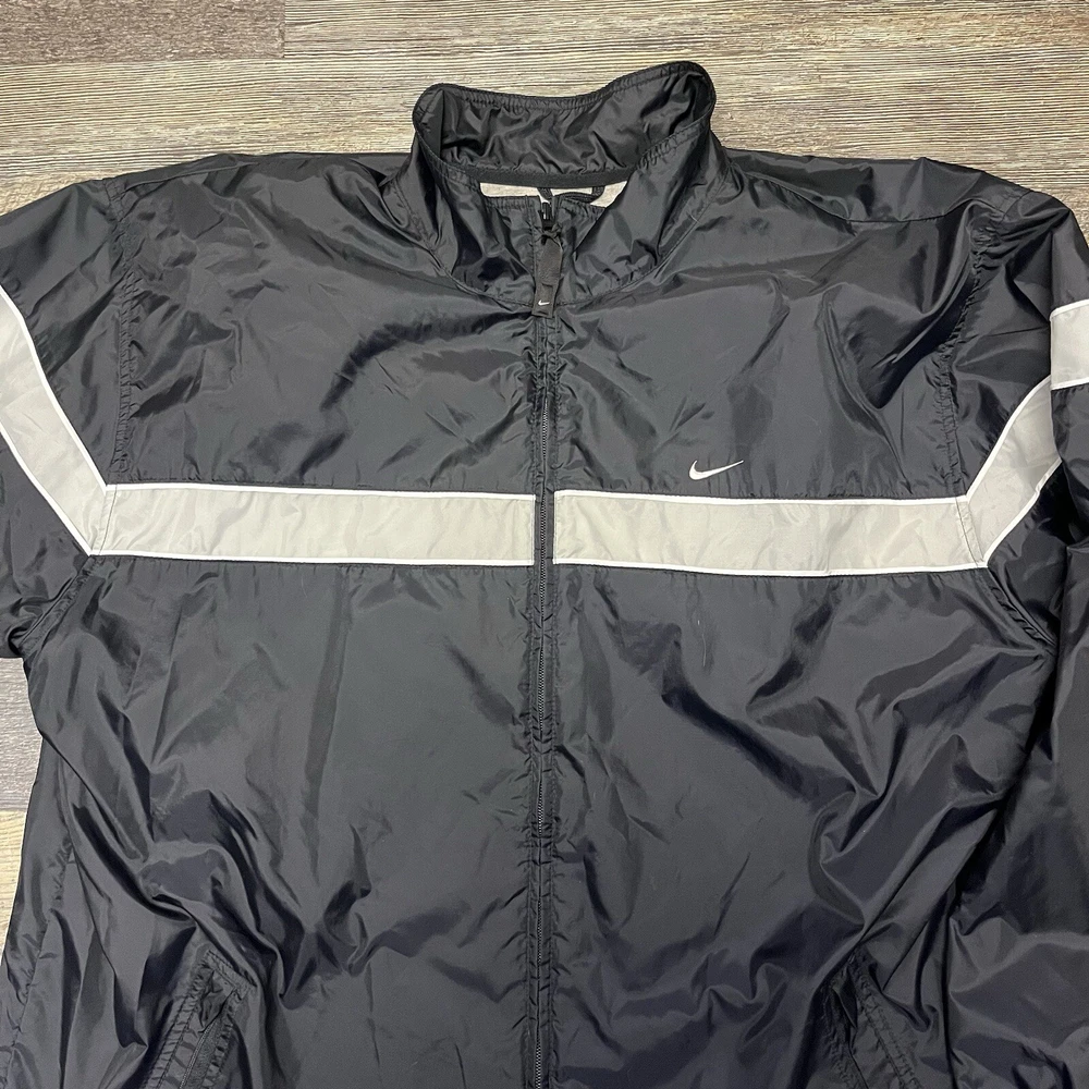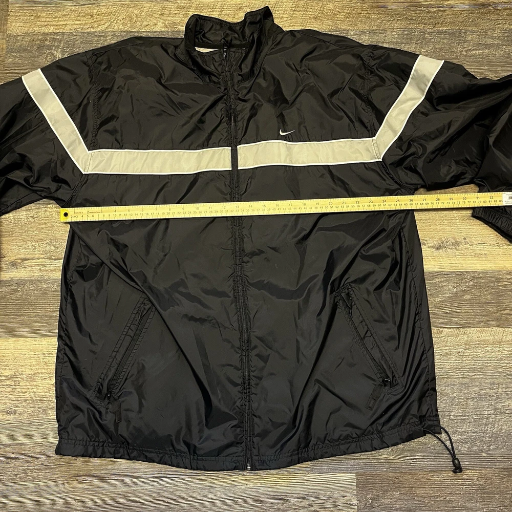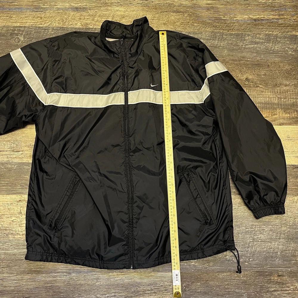 Elevate your style with this Nike jacket that features a black striped pattern and a full zip closure. The mid-length windbreaker is made of lightweight polyester material and is perfect for traveling, casual outings, and workwear. The jacket is machine washable, making it easy to maintain. It comes in a regular fit and is available in size XL. The jacket's features include pockets, a stand-up collar, and a Nike logo embroidered on the chest. The jacket is suitable for various seasons, including winter, summer, fall, and spring, and is perfect for gym and training, walking, and running and jogging activities. This vintage-style jacket is a must-have for any fashion-conscious man.