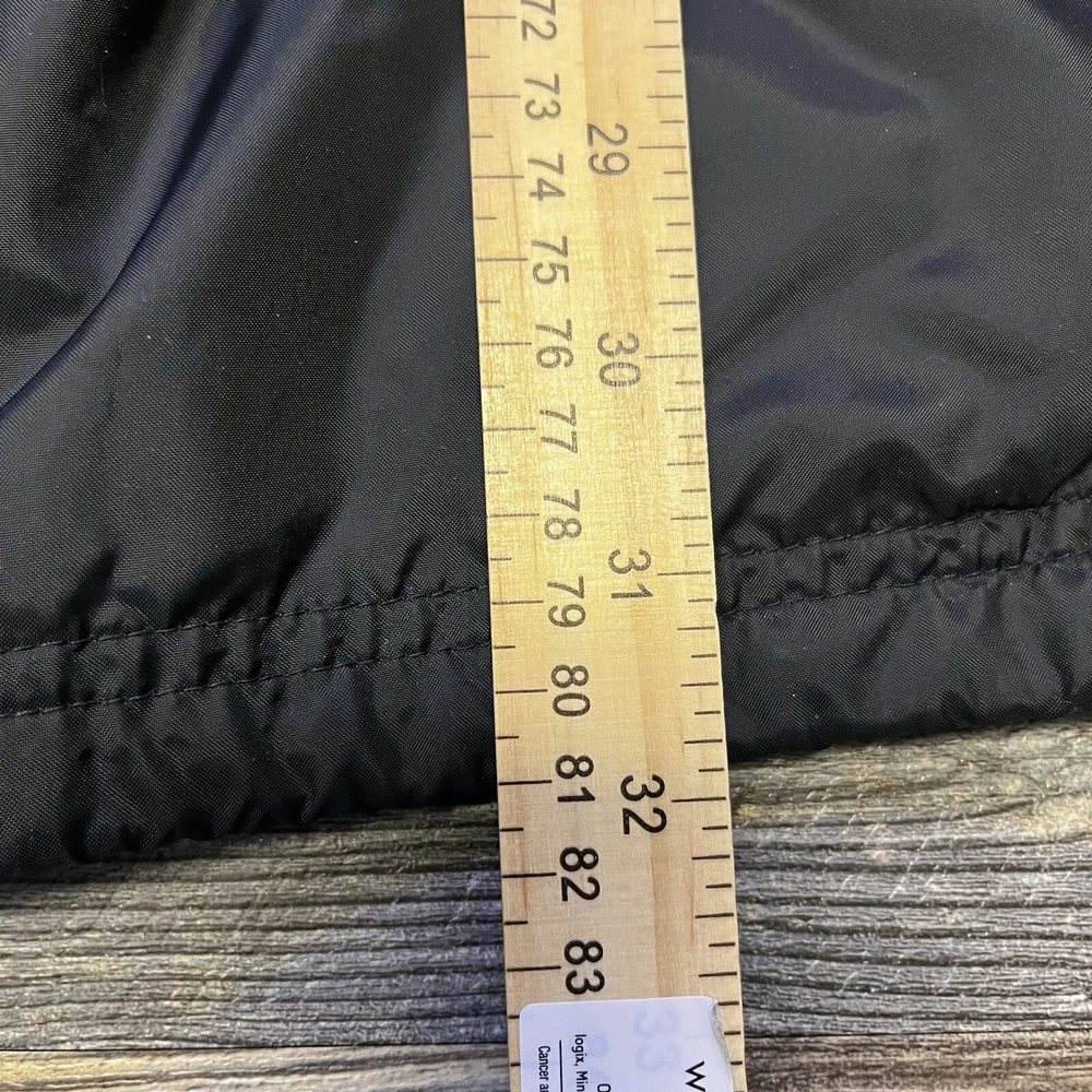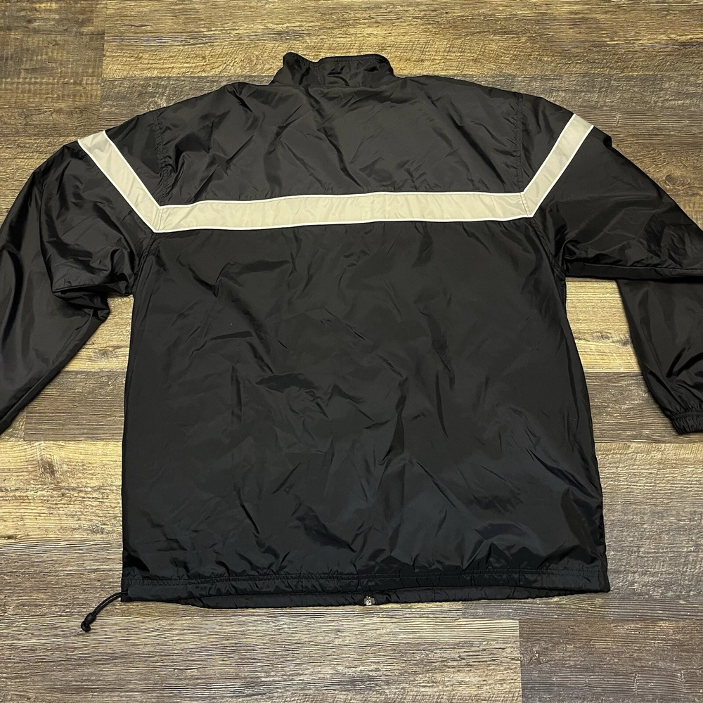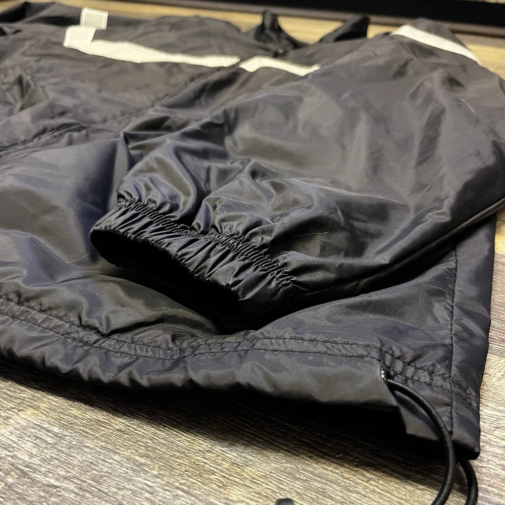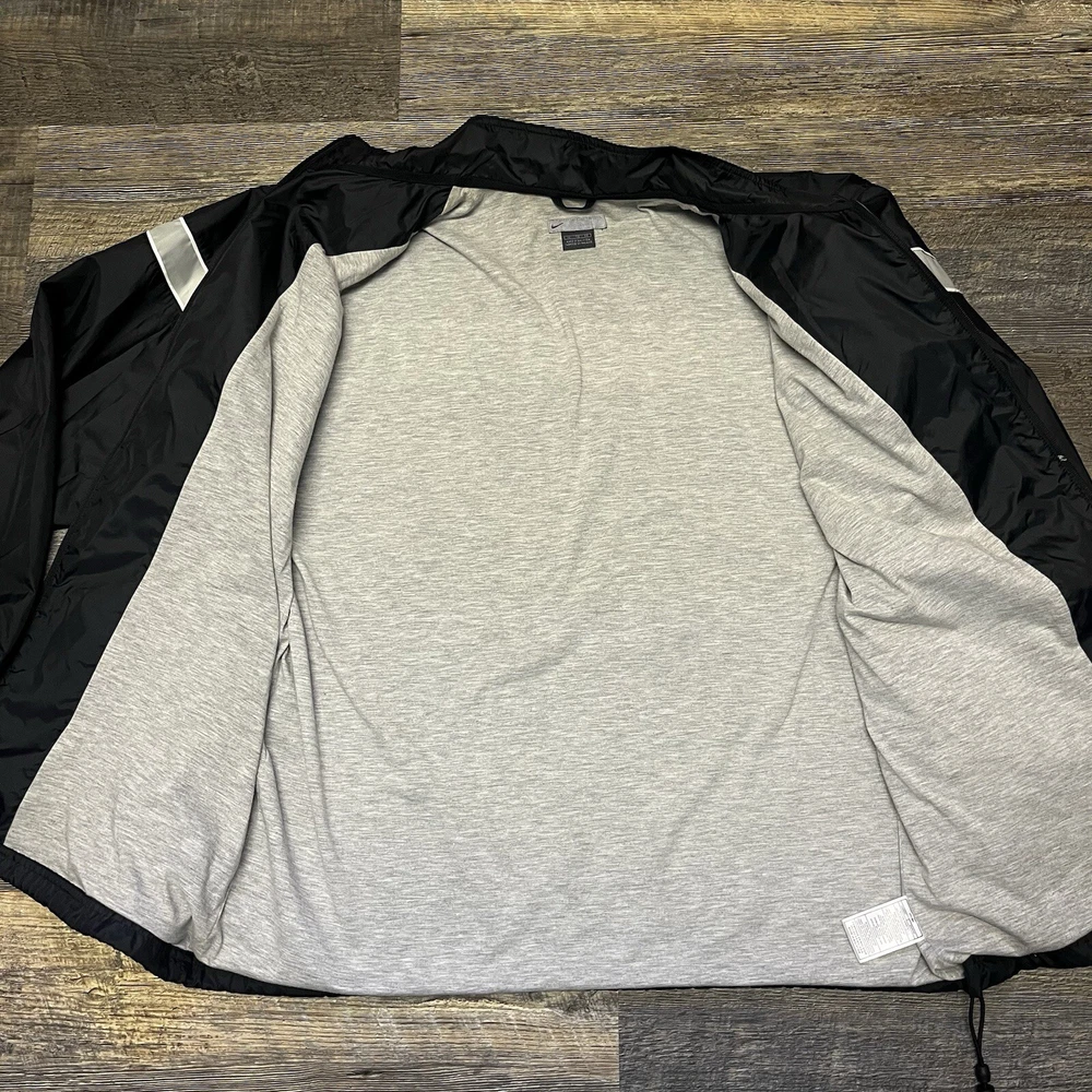 Elevate your style with this Nike jacket that features a black striped pattern and a full zip closure. The mid-length windbreaker is made of lightweight polyester material and is perfect for traveling, casual outings, and workwear. The jacket is machine washable, making it easy to maintain. It comes in a regular fit and is available in size XL. The jacket's features include pockets, a stand-up collar, and a Nike logo embroidered on the chest. The jacket is suitable for various seasons, including winter, summer, fall, and spring, and is perfect for gym and training, walking, and running and jogging activities. This vintage-style jacket is a must-have for any fashion-conscious man.