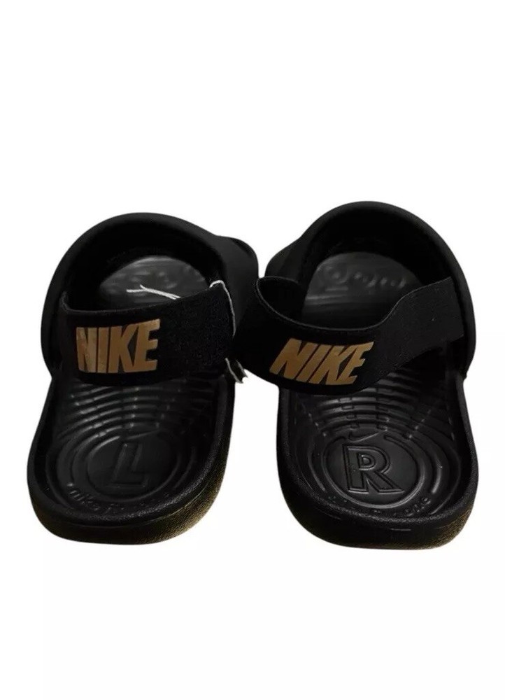 NIKE Kawa slides. Colors are black with gold swoosh/ check and gold NIKE logo on heel strap. Stretchy elastic heel strap holds shoes on securely. New with tags. Toddler size 10C. Please see pictures for details.