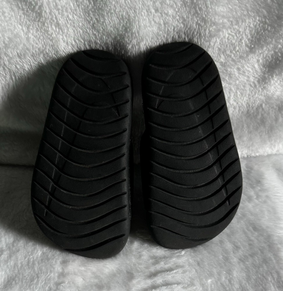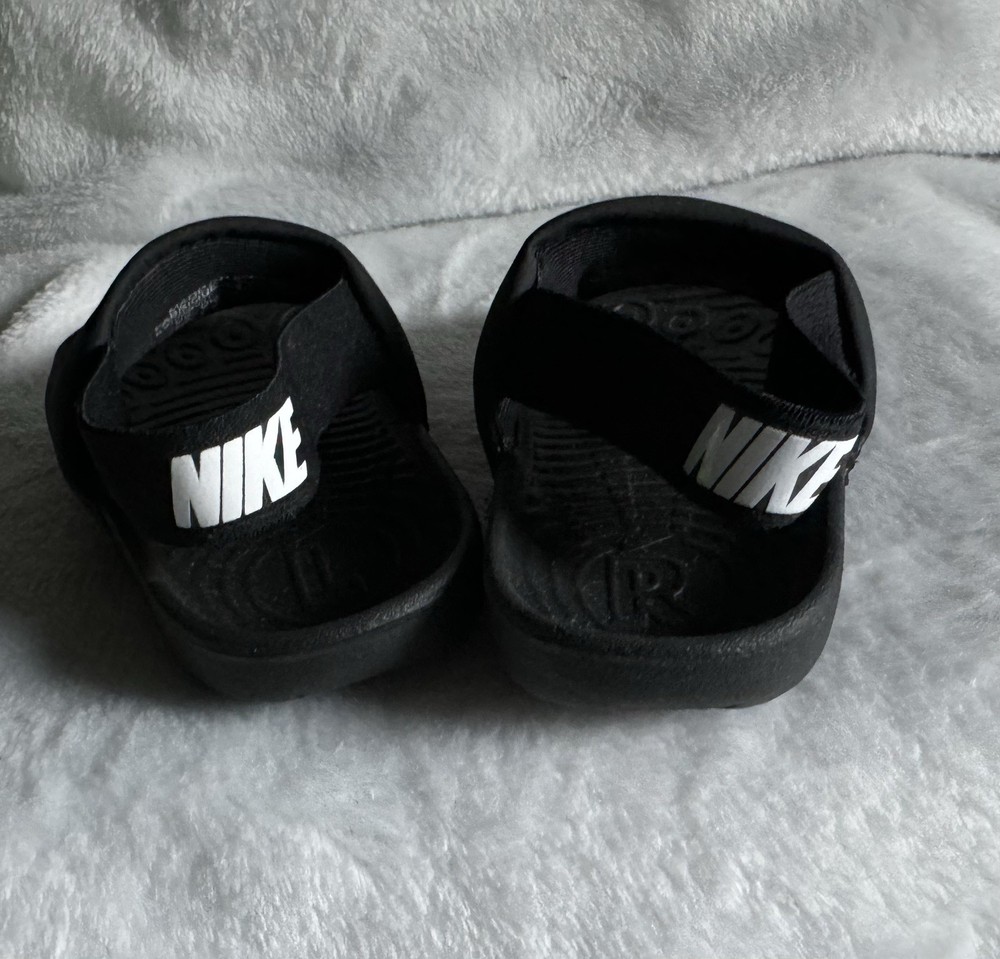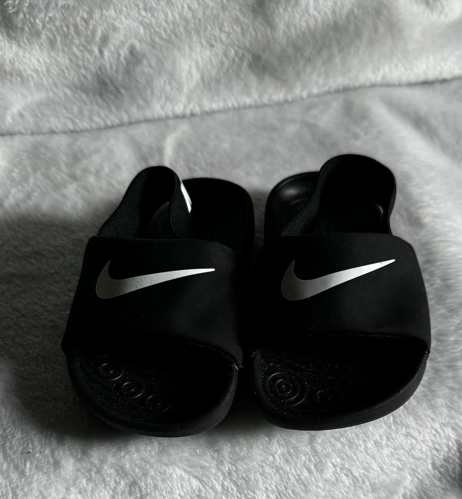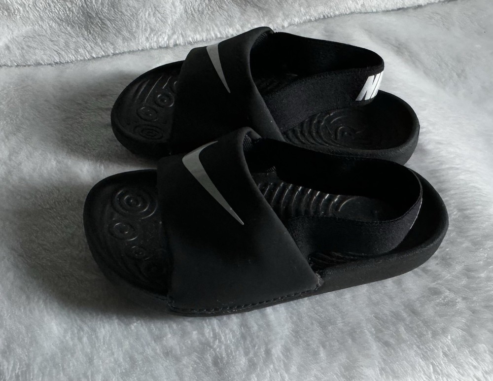 Nike kawa slides sandals with stretch back toddler size 6c 6 kids black white, logo swoosh front & Nike logo back, like new excellent gentle used condition.
