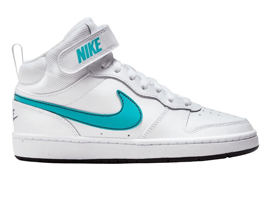 The Nike Kids Court Borough Mid 2 GS Shoes are stylish sneakers designed for unisex kids. They feature a white color with aquamarine and black accents, a lace-up closure, and a standard shoe width. These athletic shoes have a synthetic upper material and a Nike Court product line, providing both comfort and durability. With a US shoe size of 7y/4.5y/3.5y/5.5y, an EU shoe size of 38, and a sleek Nike design, these sneakers are perfect for active kids looking for a trendy and versatile footwear option.