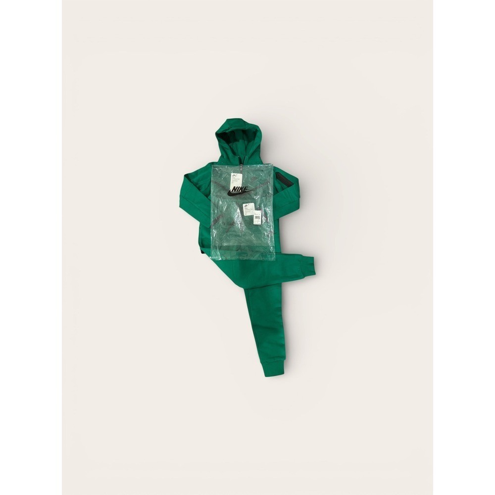 Nike Tech Fleece 2-piece tracksuit set in a vibrant green colorway. This coordinated set includes a full-zip hoodie and matching jogger pants, both crafted from lightweight yet warm Tech Fleece fabric. The hoodie features the signature chevron design line, a bonded sleeve pocket, and a scuba hood for extra coverage. The joggers include an elastic waistband with an adjustable drawcord and a vertical zippered pocket on the side for secure storage. Both pieces are finished with the iconic Nike Futura logo.