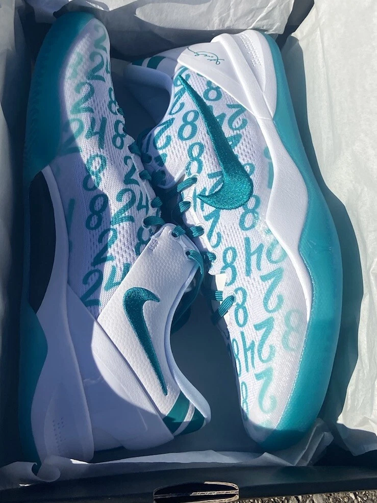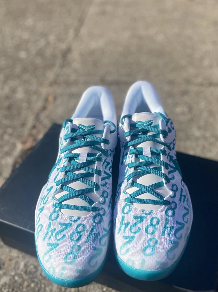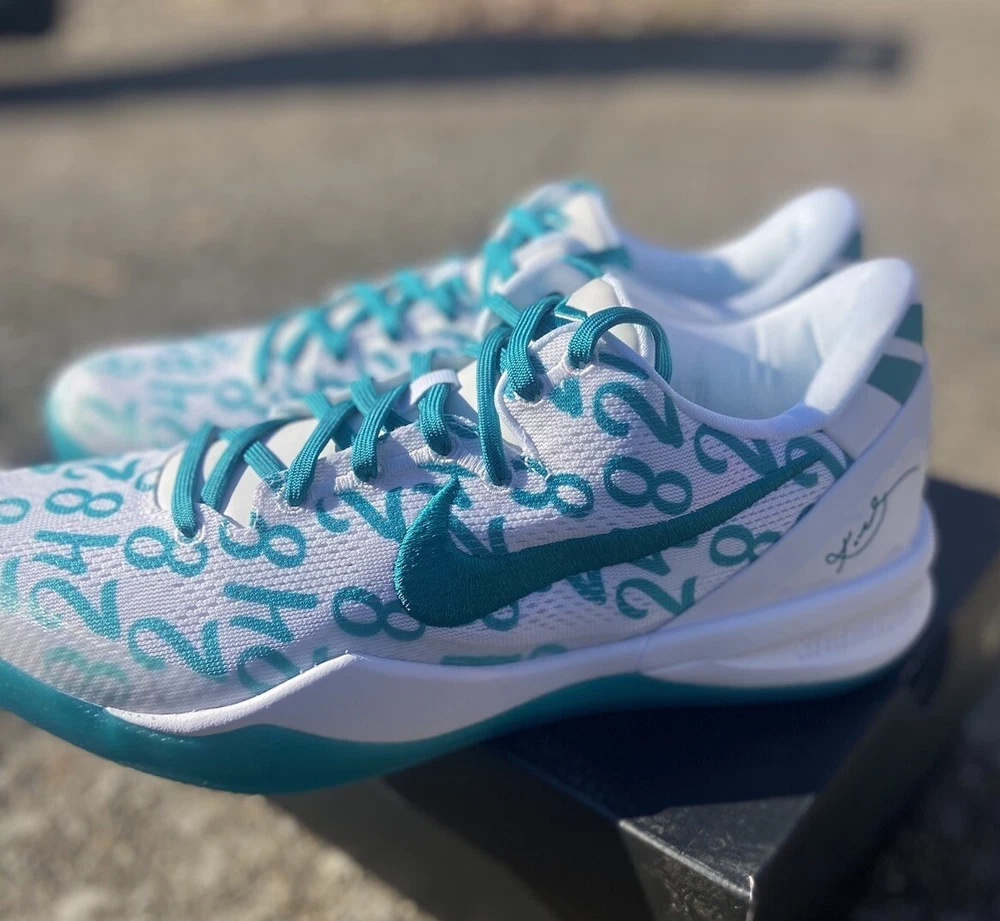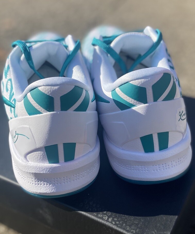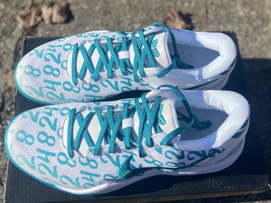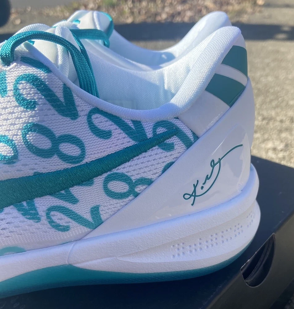 This is a Nike Kobe 8 Protro sneaker in size 10.5, featuring a white and Radiant Emerald colorway. Released in 2024, this basketball shoe is part of the Nike Kobe line, with a mesh upper material and a stylish design. Ideal for men, this brand new shoe pays tribute to Kobe Bryant's legacy. Crafted for the modern athlete and styled for the streets, the Kobe 8 Protro Radiant Emerald is engineered with performance technology that ensures comfort and responsiveness. Its lightweight construction and supportive fit adapt seamlessly to rapid movements, embodying the agility and precision Kobe was known for. The vibrant Radiant Emerald accents add a fresh pop of color, perfectly suited for individuals who appreciate a mix of heritage and style. Dive into the game with the Nike Kobe 8 Protro Radiant Emerald, a sneaker that blends cutting-edge design with a tribute to a basketball legend. This sneaker captures the essence of Kobe Bryant's dynamic playstyle and his legacy on the court, featuring a sleek White/Radiant Emerald/White colorway that stands out in any crowd. The numbers 8, 24, and 2 are displayed on the upper, symbolizing Kobe's iconic numbers with the Lakers and his daughter Gianna's number 2, making it more than just a shoe; it's a piece of history.