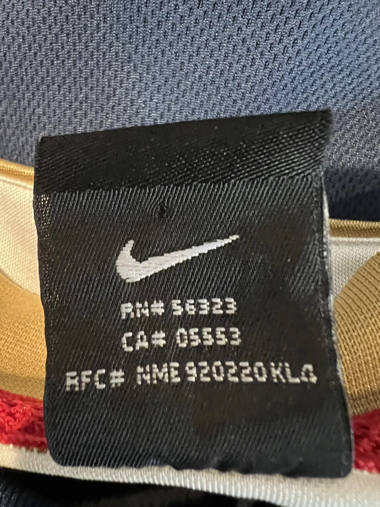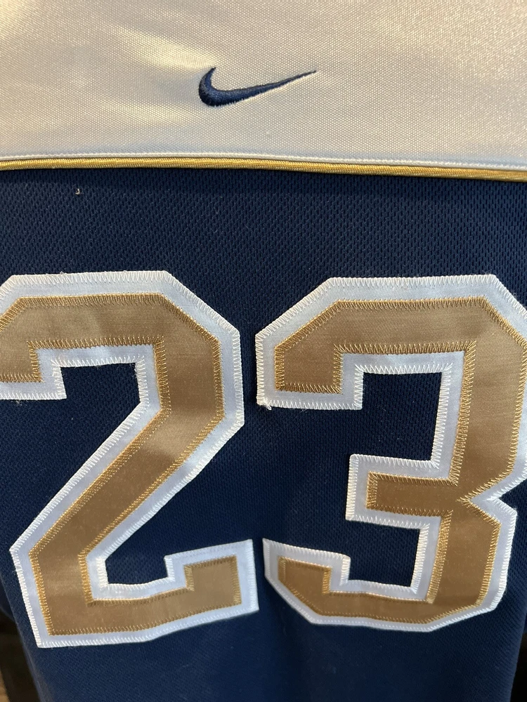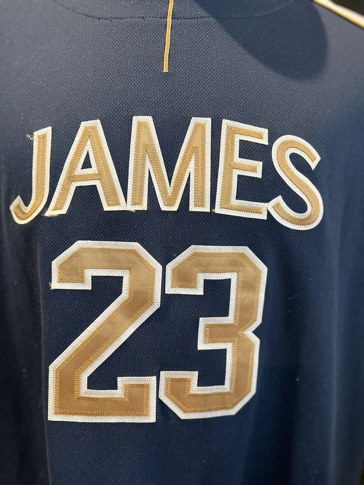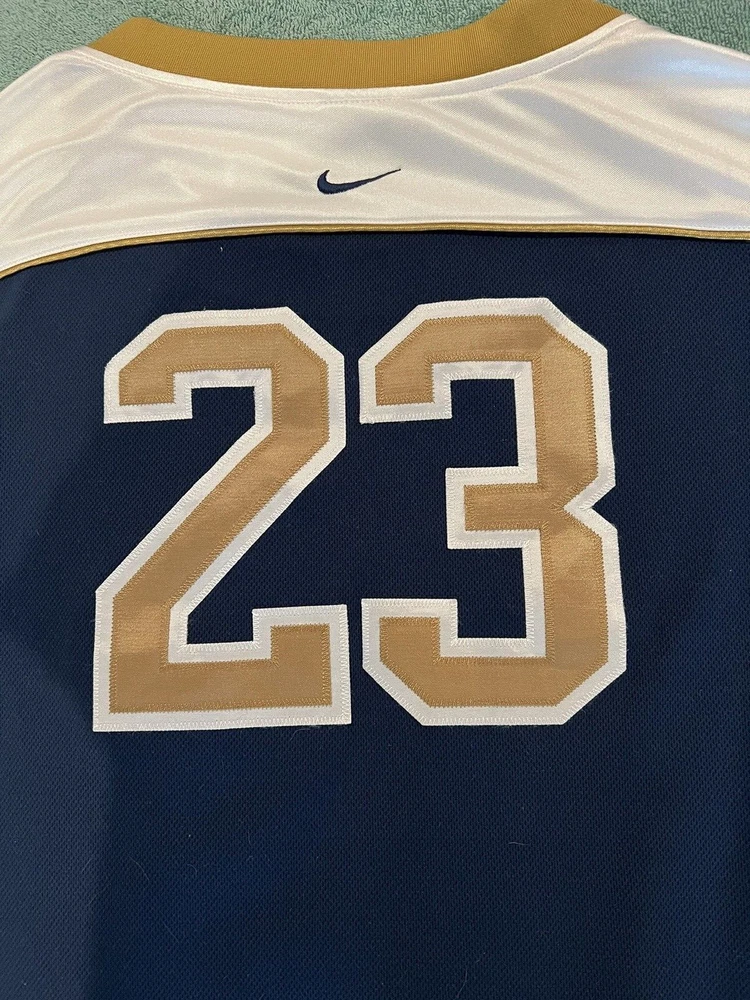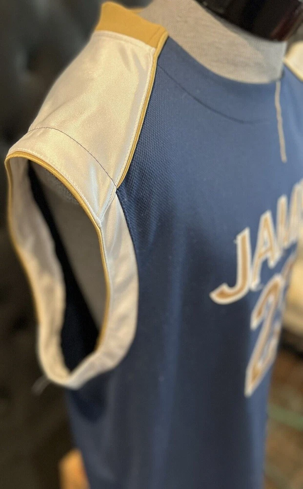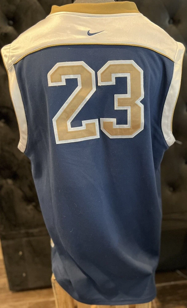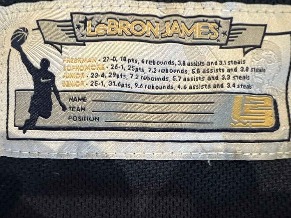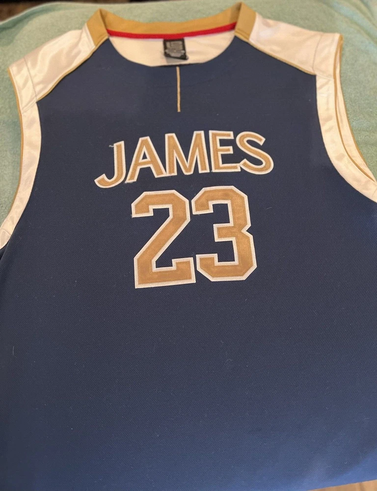 Up for sale is an authentic Nike LeBron James 23 High School Stats Jersey in blue and gold, size large. This jersey features the name and number of the basketball legend himself, LeBron James, along with his high school stats. It is an original product made in Indonesia. Perfect for any fan of LeBron James or basketball memorabilia collectors, this jersey is a great addition to any collection. The jersey is in excellent condition and ready to be worn or displayed. Get your hands on this unique piece of sports history today!