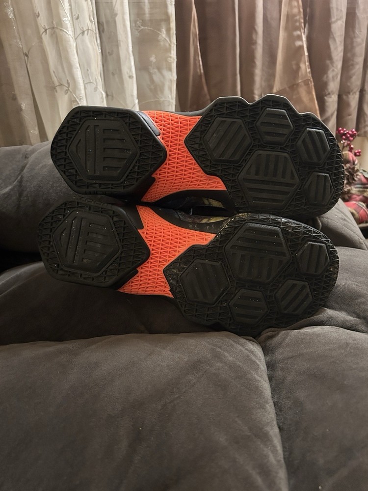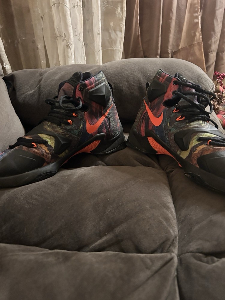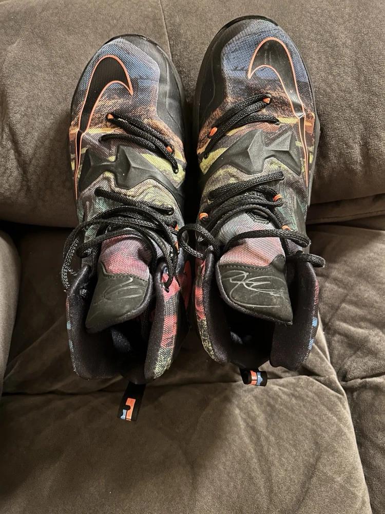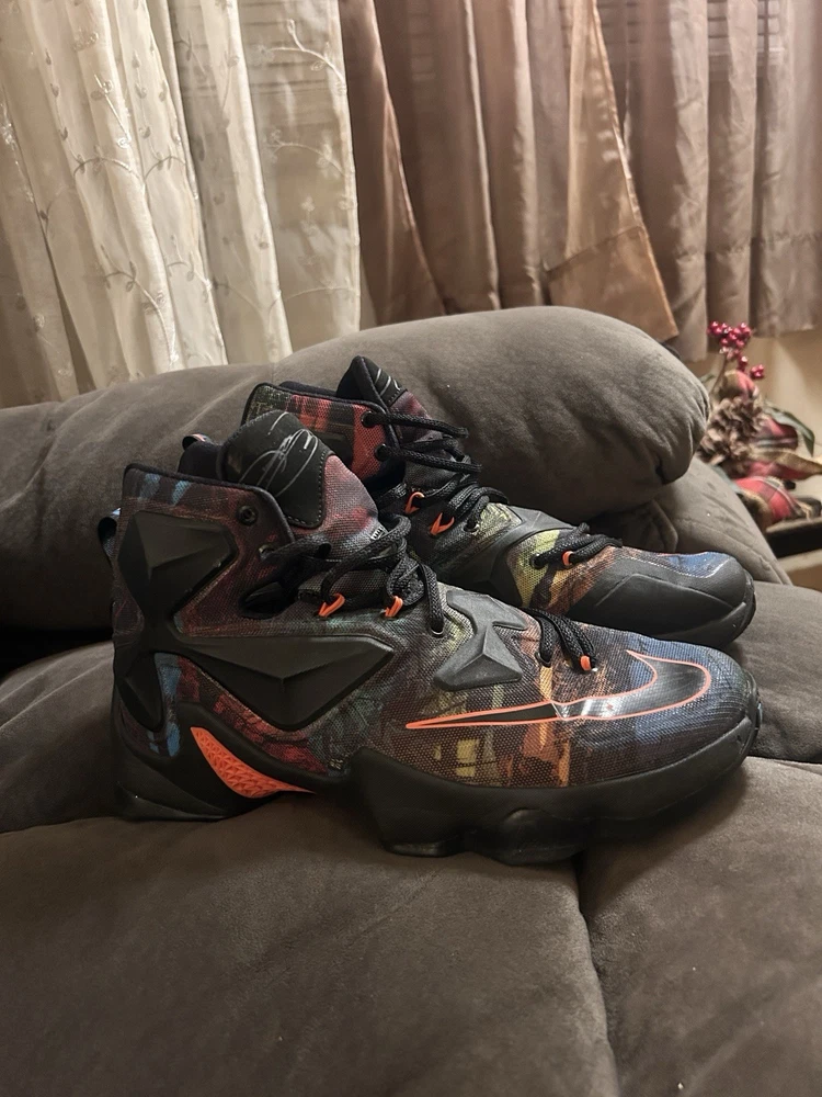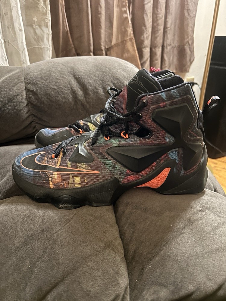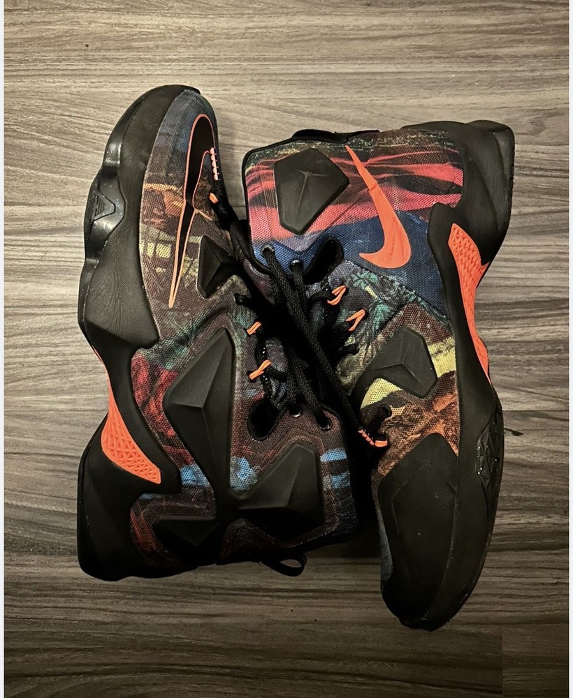 The Nike LeBron James 13 "Akronite" basketball shoes in size 8.5 Youth are a stylish and functional option for young athletes. These lace-up sneakers feature a round toe shape, rubber outsole, and standard shoe width for comfortable wear during basketball games. The multicolor design with the signature LeBron logo adds a touch of flair to these athletic shoes, making them a popular choice for active boys in the summer, fall, and spring seasons. Built by Nike in the 2010-2019 time period, these sneakers are designed for performance and activity on the basketball court.