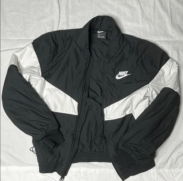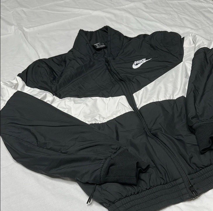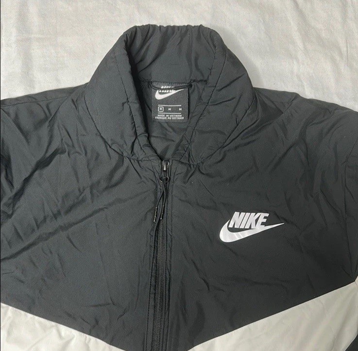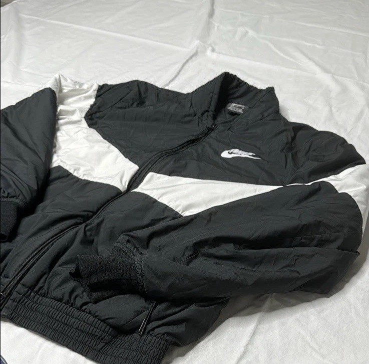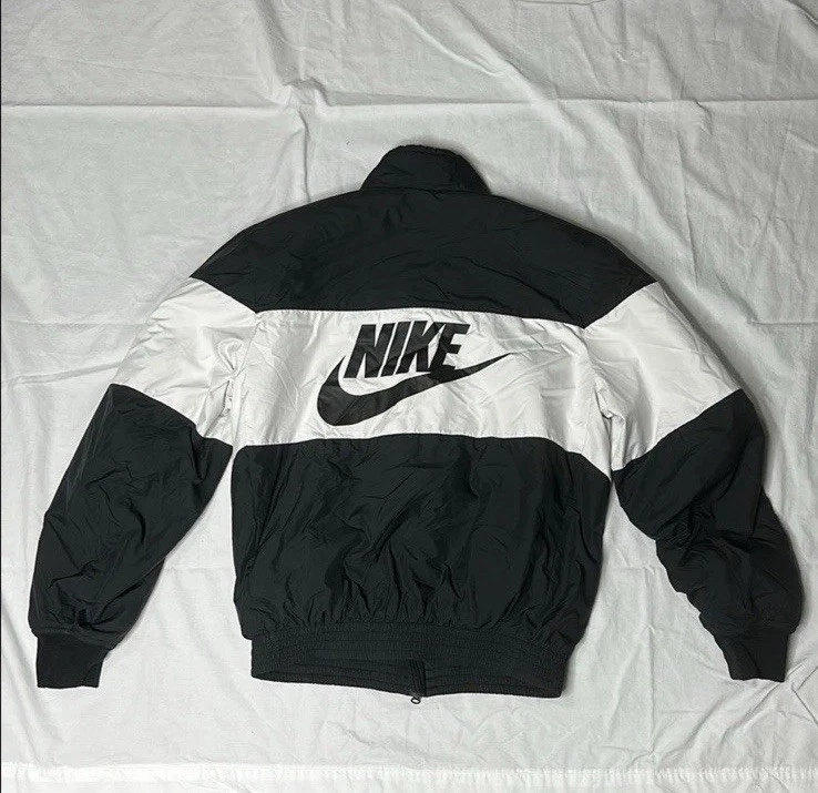 The Nike Men's Black and White Puffer Jacket in size medium is a stylish and practical outerwear option for men.