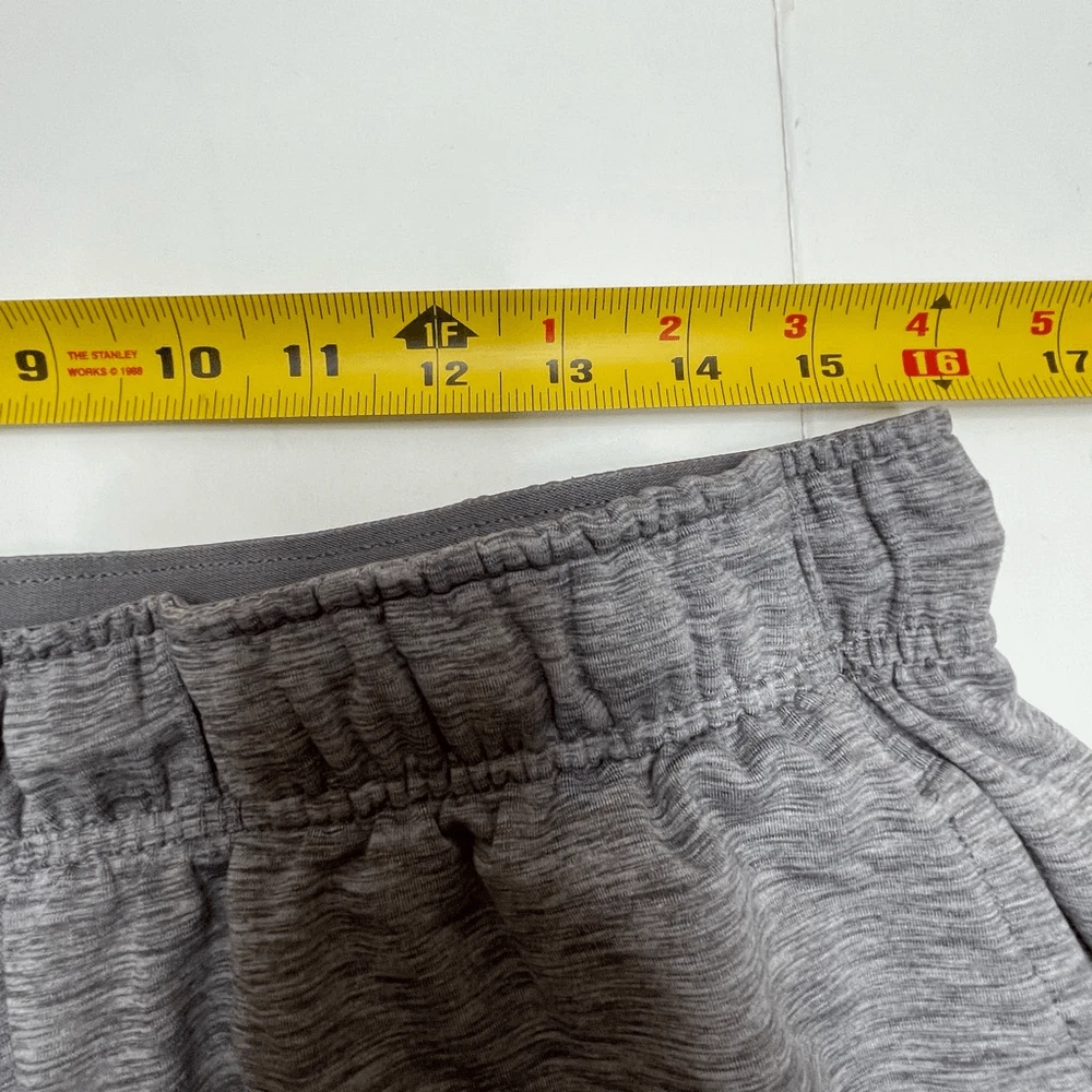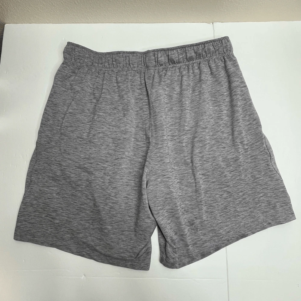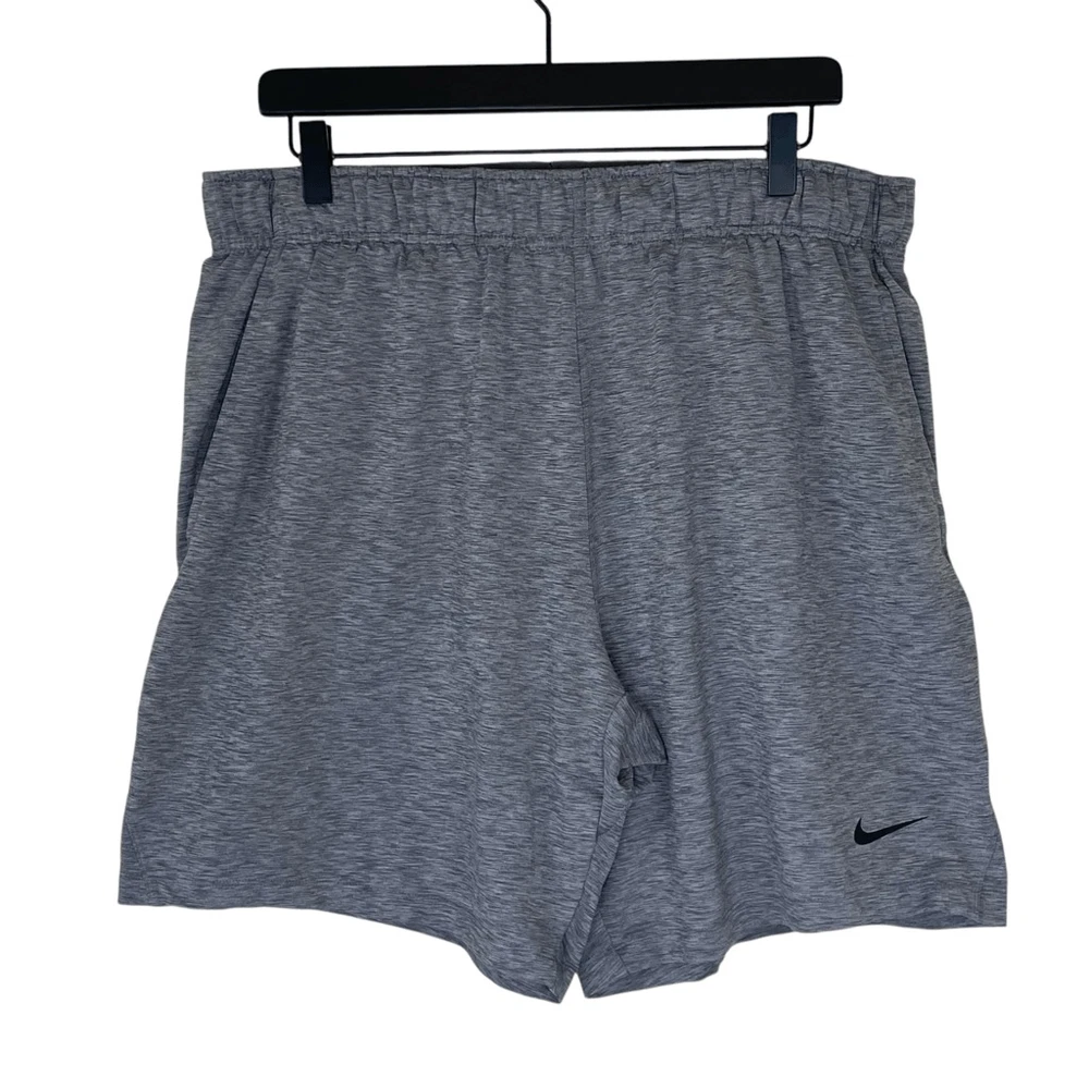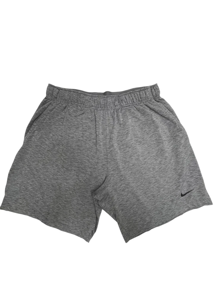 Nike Men’s Dri-Fit Yoga Training Shorts Gray Size XL Nike AT5693-056 Approximate measurements while lying flat are Waist: 16” unstretched Rise: 12” Inseam: 8” Material: 88% polyester, 12% spandex Athletic shorts, gym shorts, yoga shorts The drawstring is out in one side and needs to be fed back through. Shorts function fine without it.