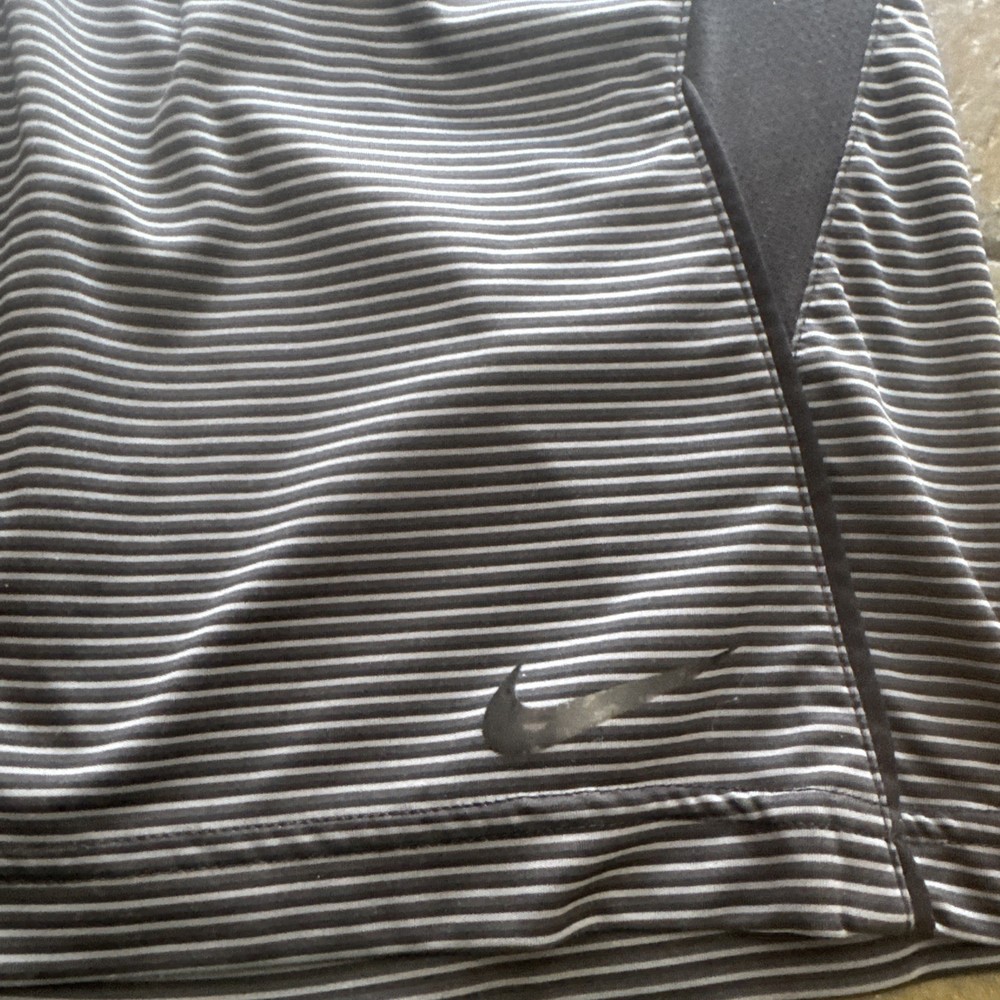 The Nike Men's Gray & Black Striped Dri-FIT Athletic Shorts in size Large feature a classic drawstring closure and a 9" inseam, making them perfect for activewear or casual occasions. Made of 100% polyester mesh fabric, these athletic shorts are not only breathable but also moisture-wicking, making them ideal for gym, basketball, and running activities. With an elastic waist, pockets, and a drawstring closure, these athletic shorts by Nike offer comfort and functionality for the modern man in all seasons.