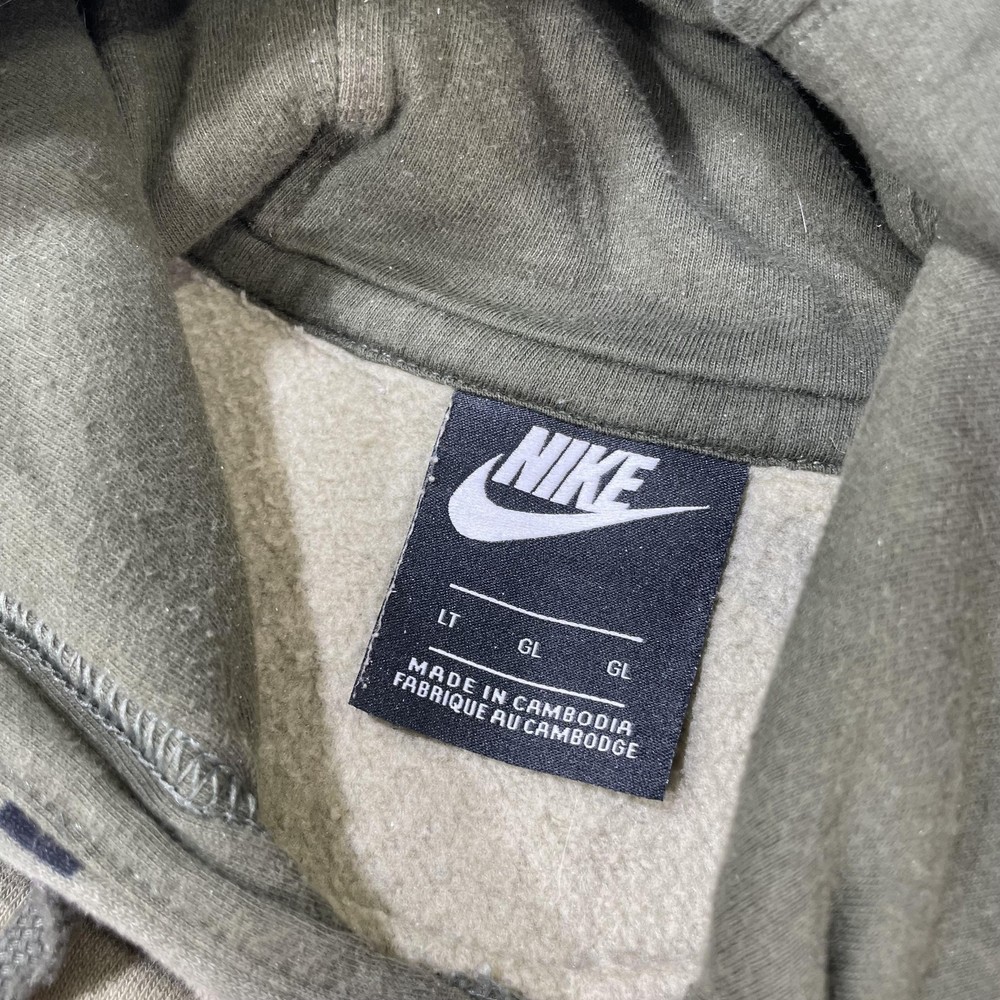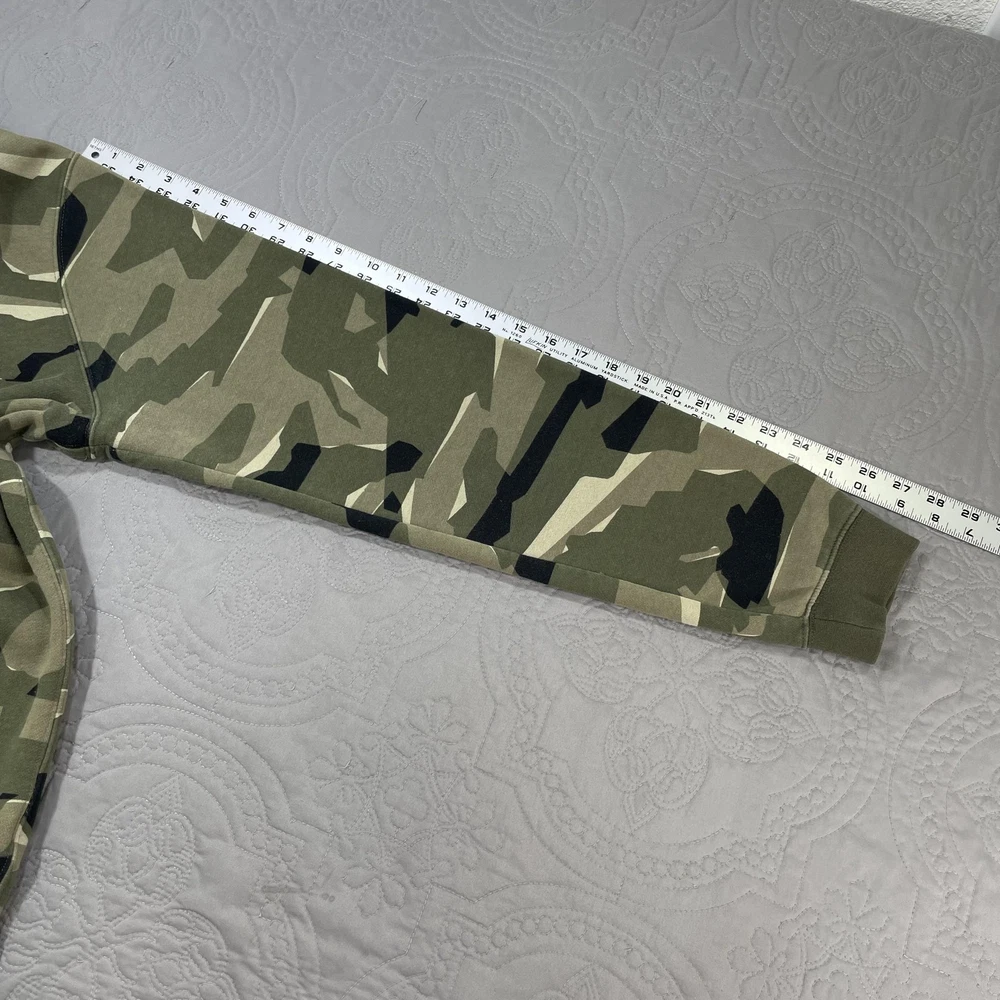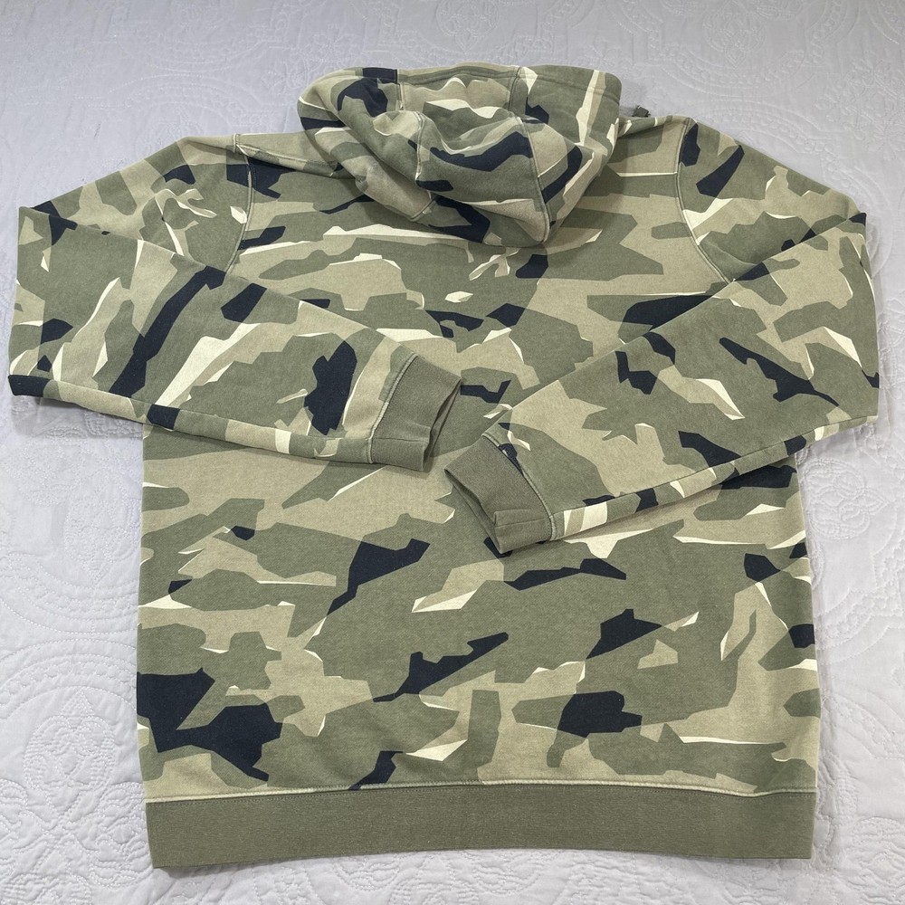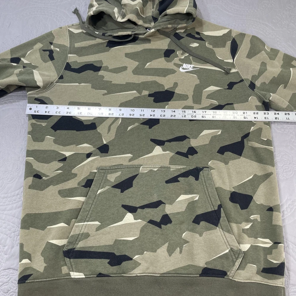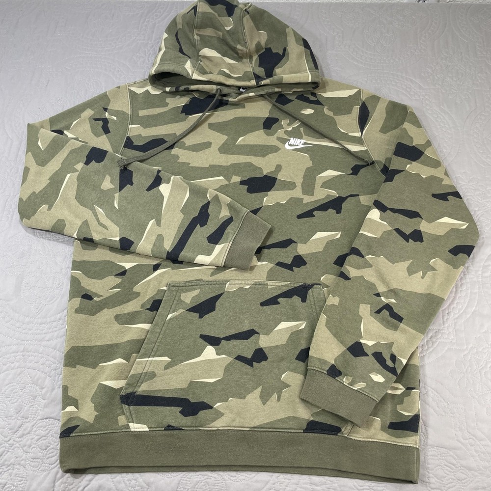 Nike Hoodie Mens Large Green Camo Pullover Fleece Swoosh Logo Sweatshirt Condition: Gently worn, no visible flaws. No stains, holes, or major signs of wear noted in photos. Features an allover green, beige & black camouflage print with Nike Swoosh logo embroidered in white on left chest Classic pullover design with drawstring hood and front kangaroo pocket Material: Cozy fleece interior; shell tag not shown, but typical for this style is a cotton/poly blend Tag Size: Large (Mens) Flat measurements (approximate): Pit to pit 24", length 29", sleeve from collar 31" Made in Cambodia Style great for streetwear, loungewear, or athletic use