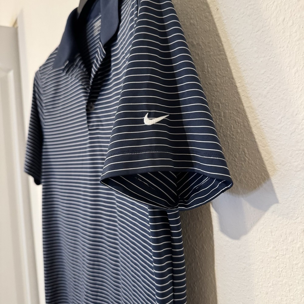 Elevate your style with this Nike blue striped polo, perfect for both the golf course and casual outings. Crafted from high-quality fabric, this polo offers a regular fit with short sleeves, ensuring comfort and ease of movement. The classic polo collar and button-up placket add a touch of sophistication, while the iconic Nike swoosh emblem subtly enhances its sporty appeal. Ideal for summer, this versatile piece transitions seamlessly from a day on the green to a relaxed evening with friends. Machine washable for easy care. Pre-owned, in excellent condition. Keywords: Nike polo, blue striped polo, men's polo shirt, golf shirt, casual wear, sportswear, summer fashion, short sleeve polo, collared shirt, Nike swoosh, button-up placket, regular fit, machine washable, pre-owned polo, men's fashion. Brand: Nike Color: Blue Department: Men Size: M Type: Polo Performance/activity: Golf, Casual, Sports Sleeve length: Short Sleeve Pattern: Striped Fit: Regular Material: High-quality fabric Features: Classic polo collar, Nike swoosh emblem, Button-up placket Neckline: Collared Season: Summer Garment care: Machine Washable
