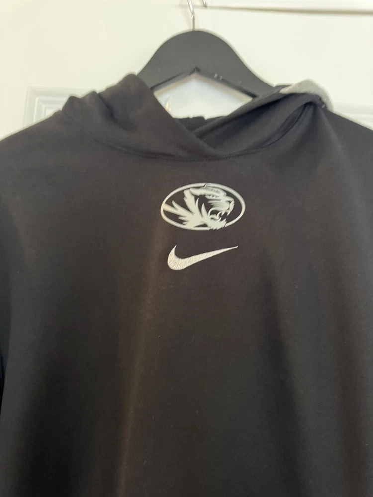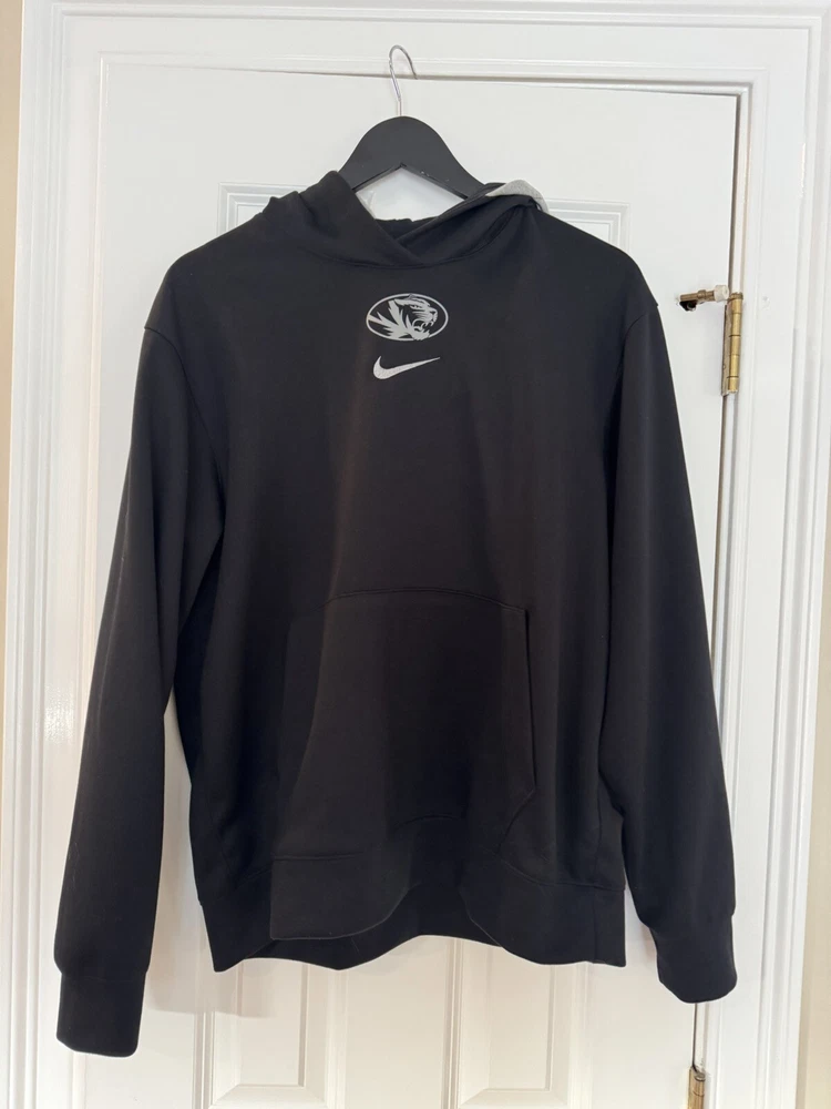 Show off your team spirit with this Nike Men's Black Missouri Tigers Long Sleeve Hoodie. The hoodie features the official Mizzou logo, making it the perfect choice for any die-hard fan. Made with comfortable material, this sweatshirt is perfect for wearing during the regular season or on game day. It's officially licensed and perfect for men who want to show their support for the Missouri Tigers. The hoodie comes in size medium and is black in color. Get ready to cheer on your favorite team with this stylish and comfortable Nike sweatshirt.