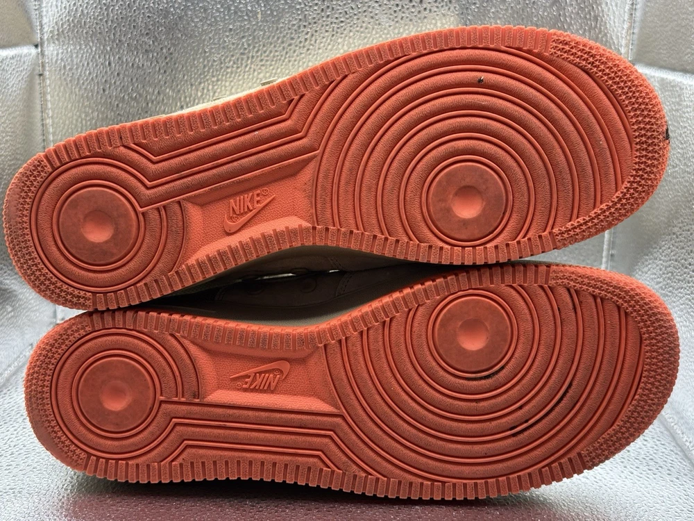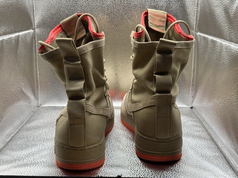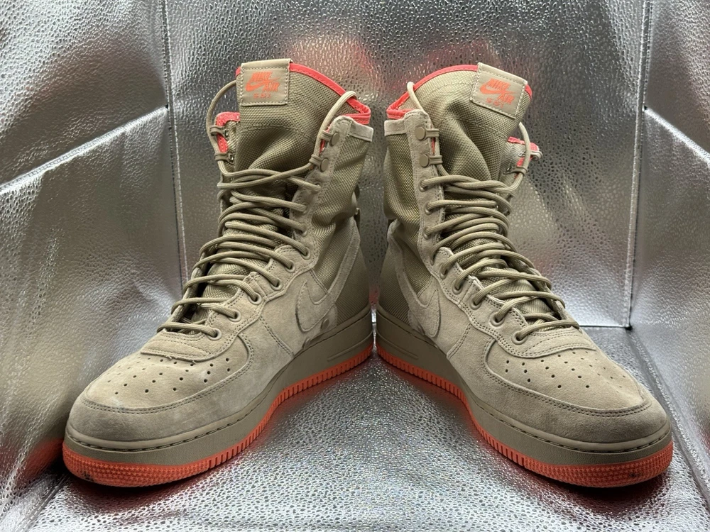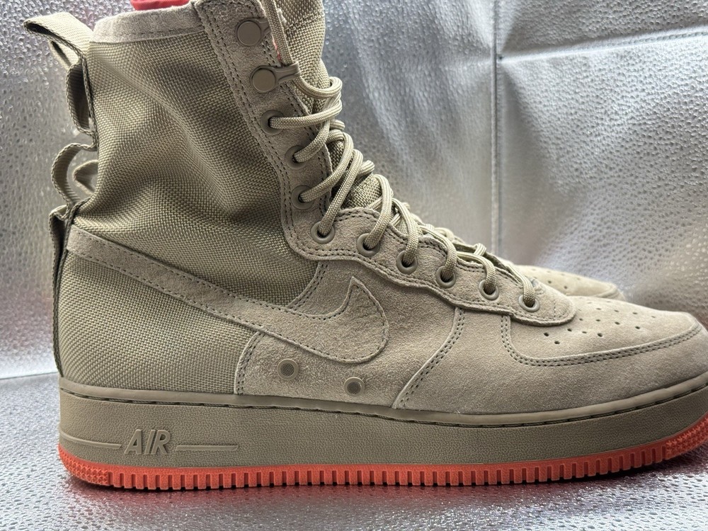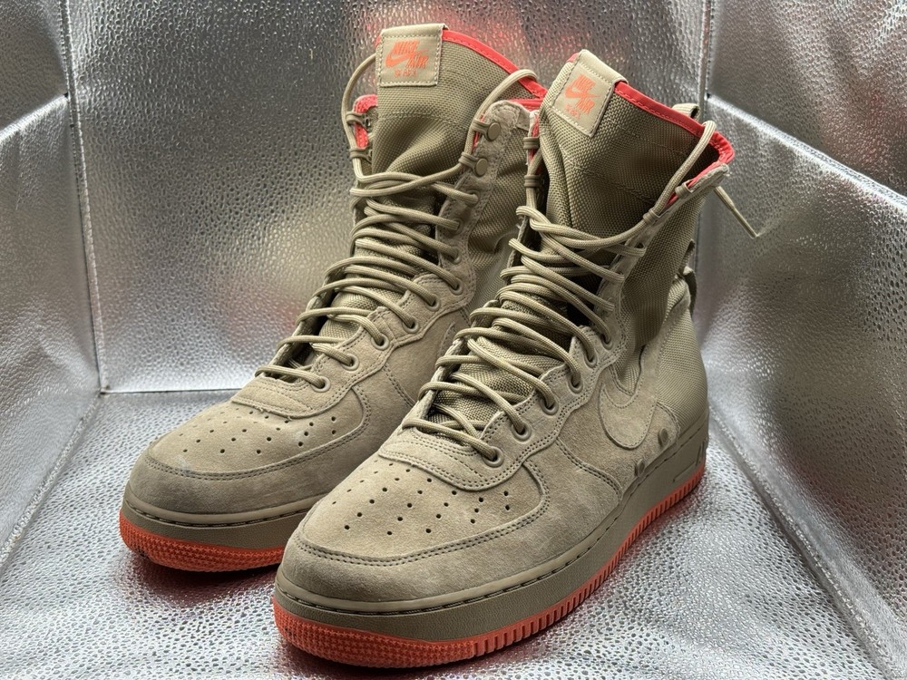 The product is a rare pair of size 11.5 Nike Men's Special Force AF1 sneaker boots in khaki color. These high-top lace-up boots are designed for activewear, casual wear, and workwear, featuring a rubber outsole for durability and comfort. The sneakers also include straps for added style and support, and are part of the Nike Air Force One product line. With a multicolor solid pattern and a standard shoe width, these boots are perfect for summer, fall, and spring seasons, making them a versatile addition to any wardrobe for those who enjoy walking, hiking, running, or jogging.