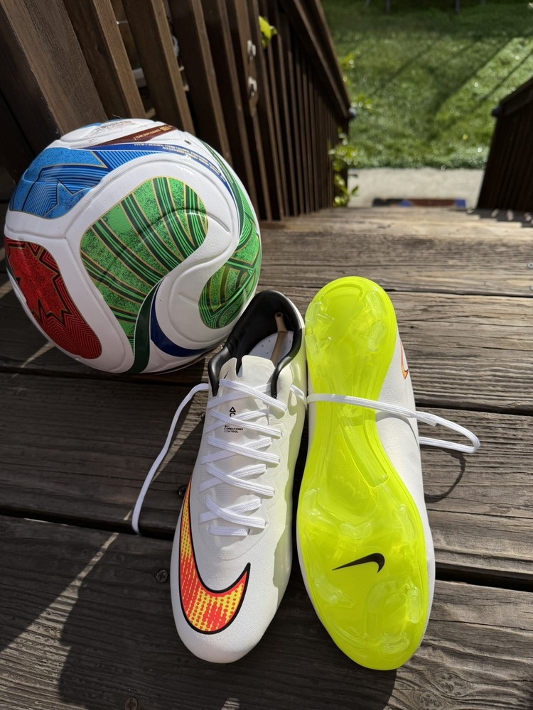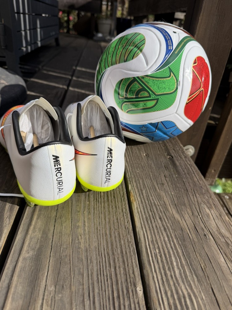 The Nike Mercurial Vapor X white and green ACC football soccer cleats boots in size US 10 are top-tier footwear designed specifically for soccer players. With a sleek white design and enhanced agility, these cleats offer superior performance on the field. The Nike brand is renowned for quality and innovation, making these boots a reliable choice for serious athletes looking to enhance their game. Perfect for professional or amateur soccer players, these cleats are sure to provide the support and traction needed to excel on the field.