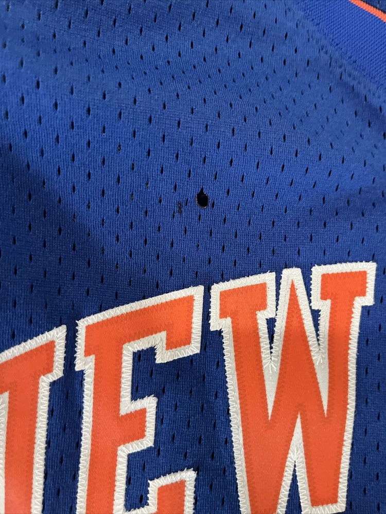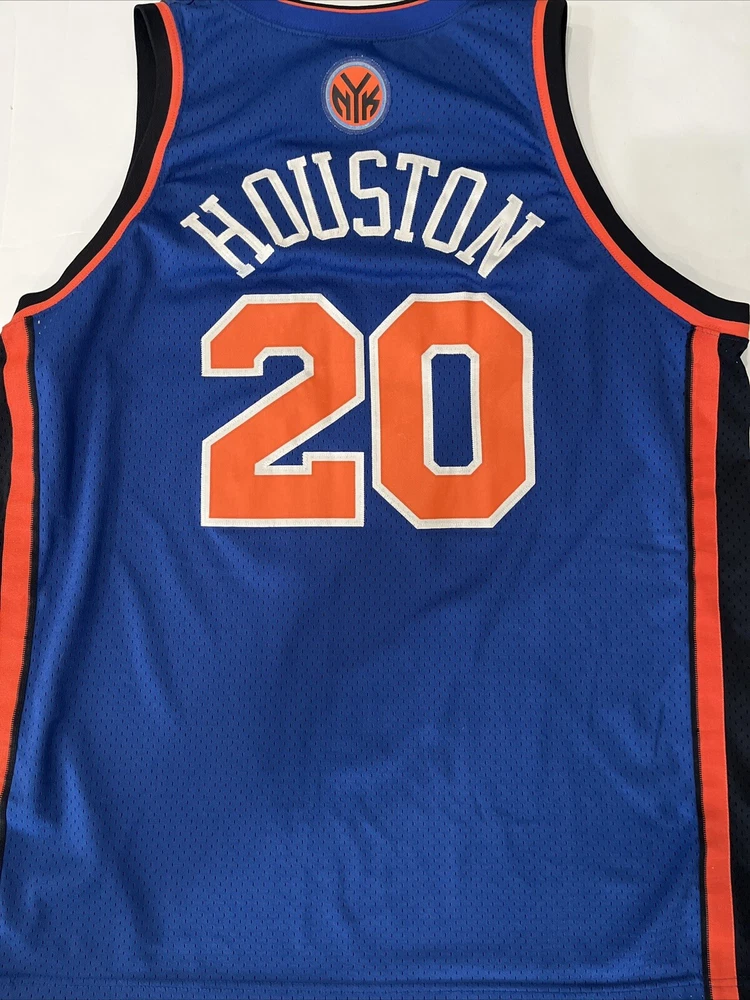 Show your support for the New York Knicks with this Nike NBA #20 Allan Houston Road Away Throwback Jersey. This officially licensed jersey is perfect for any basketball fan and features the iconic blue color of the team. The 2XL size is designed for men and is made with high-quality materials for maximum comfort and durability. This jersey is perfect for wearing to games or just around town to show off your team spirit. It features the name and number of Allan Houston, a former player for the New York Knicks who played in the NBA. This product is made in Korea, Republic of and is a must-have for any Knicks fan. There is a tiny hole in the Jersey, please see pictures.