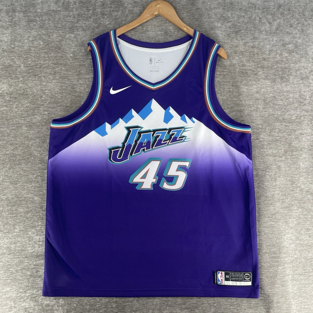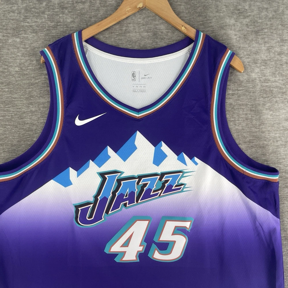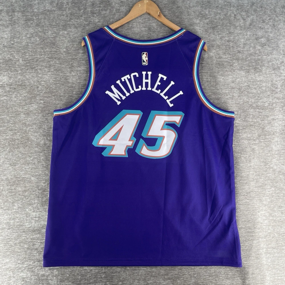 The product is a Nike NBA Retro Jersey for the Utah Jazz featuring player Donovan Mitchell's #45. This men's jersey is in size 2XL and comes in a purple colorway. It is officially licensed by the National Basketball Association (NBA) and designed for fans of the Utah Jazz or Donovan Mitchell to show their support in style. Perfect for wearing during the regular NBA season, this jersey combines retro design elements with modern Nike technology for both comfort and performance on and off the basketball court.
