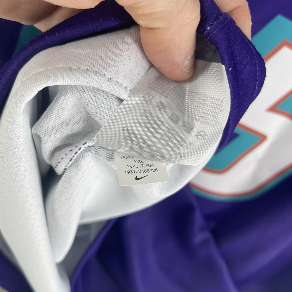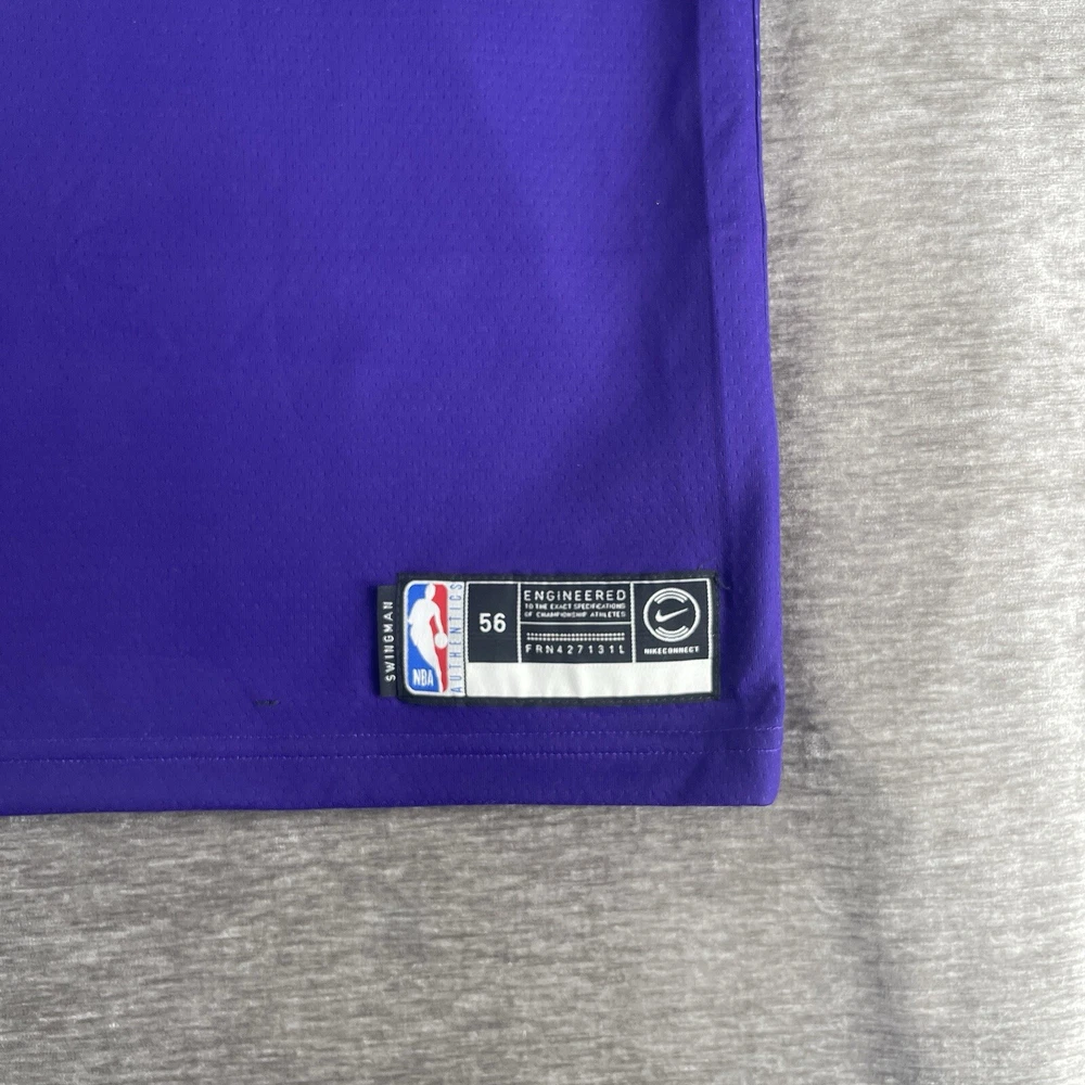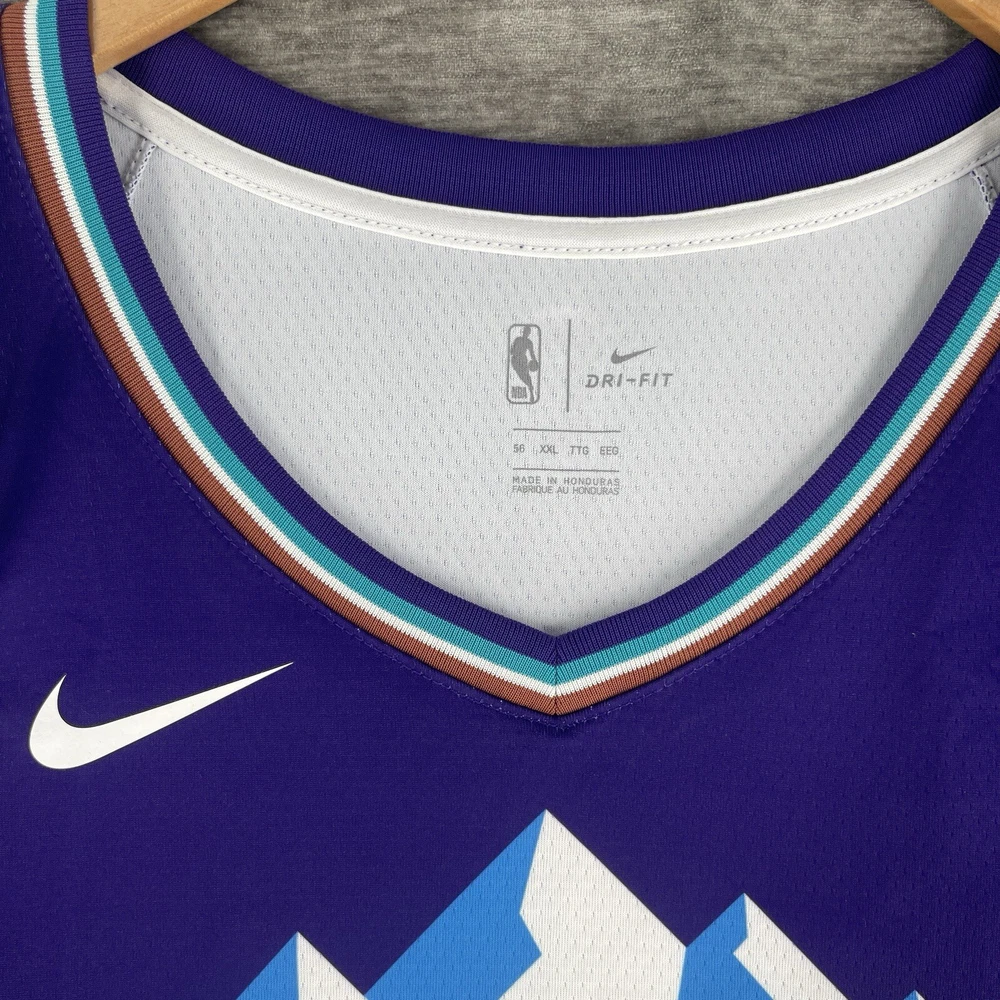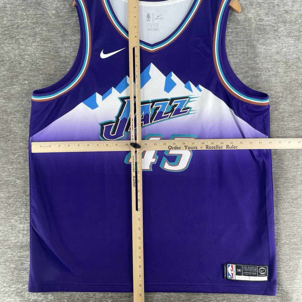 The product is a Nike NBA Retro Jersey for the Utah Jazz featuring player Donovan Mitchell's #45. This men's jersey is in size 2XL and comes in a purple colorway. It is officially licensed by the National Basketball Association (NBA) and designed for fans of the Utah Jazz or Donovan Mitchell to show their support in style. Perfect for wearing during the regular NBA season, this jersey combines retro design elements with modern Nike technology for both comfort and performance on and off the basketball court.