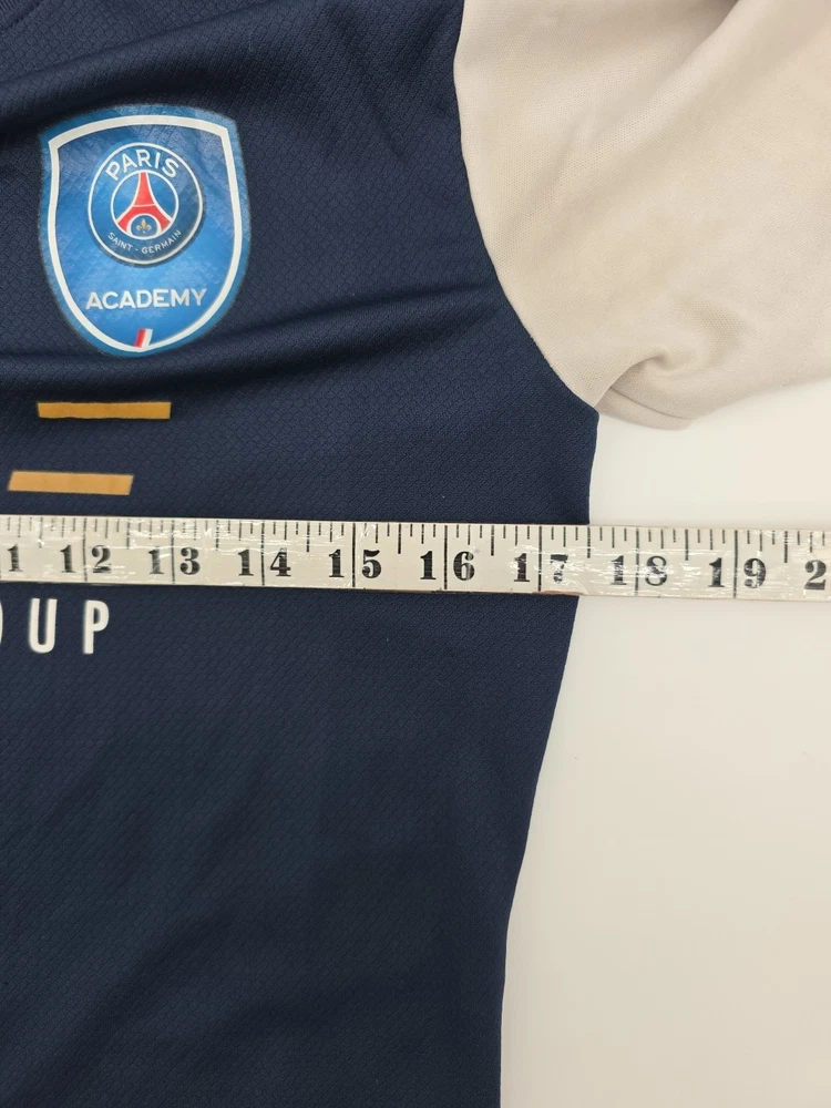 The Nike PSG Paris Saint-Germain Academy Shirt in blue is a stylish and high-quality piece of fan apparel perfect for soccer enthusiasts. With a slim fit and size small, this shirt is designed for men who support the iconic Paris Saint-Germain team. Made with Dri-FIT technology, this shirt ensures comfort and breathability during intense matches or casual wear. Show your team spirit and stay sporty with this authentic Nike PSG shirt. Check pictures for flaws and measurements