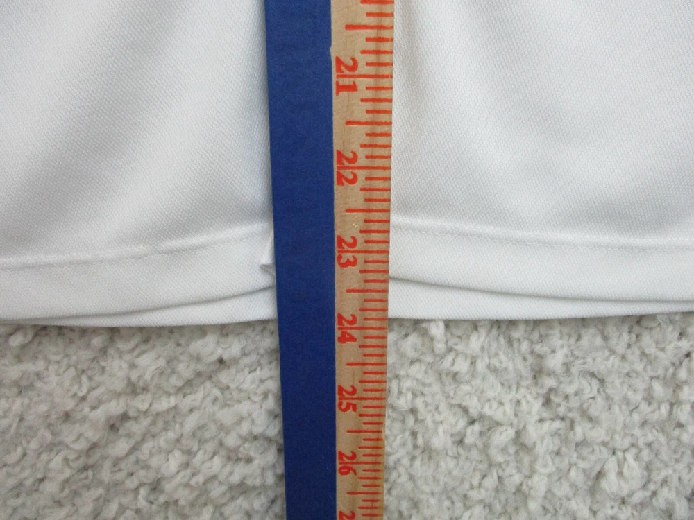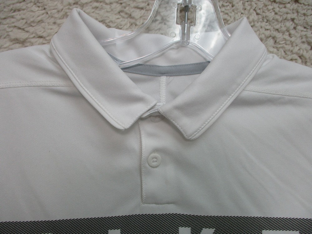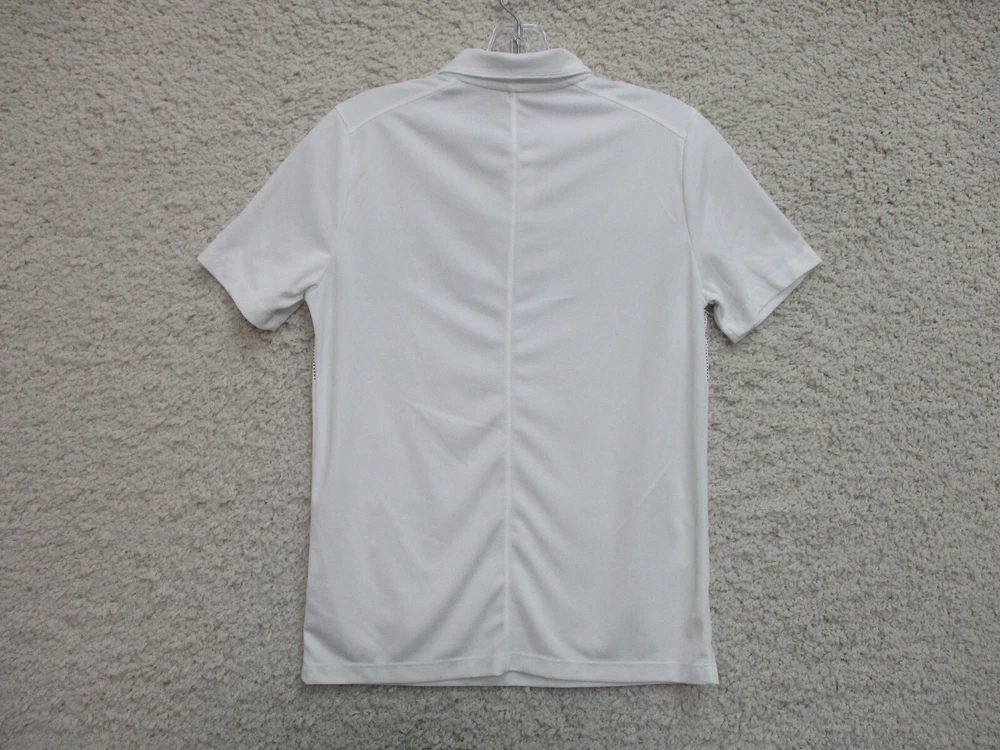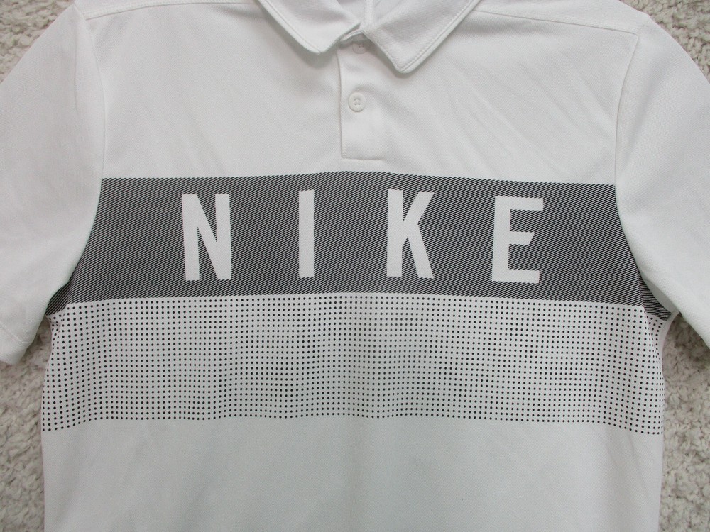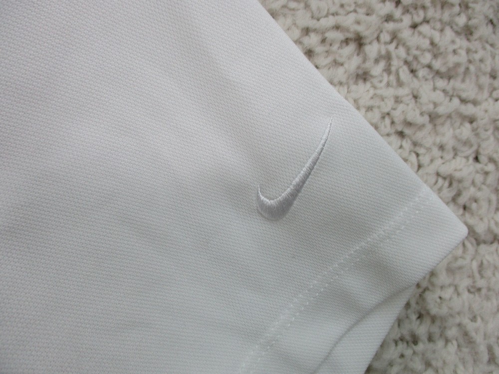 Accents: Logo Pattern: Solid Country/Region of Manufacture: China Sleeve Type: Casual Sleeve Size: L Type: Polo Occasion: Casual Style: Basic Department: Women Sleeve Length: Short Sleeve Color: White Fit: Regular Theme: Logo, Modern, USA Vintage: No Material: Polyester Blend Brand: Nike Neckline: Collared Size Type: Regular Closure: Button Features: All Seasons, Easy Care, Stretch, Lightweight Seller Notes: “Very Good Used Condition. Please, See Pictures for Full Condition and Measurements.” Season: Fall, Spring, Summer, Winter