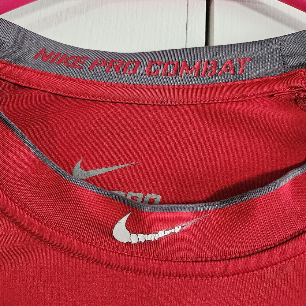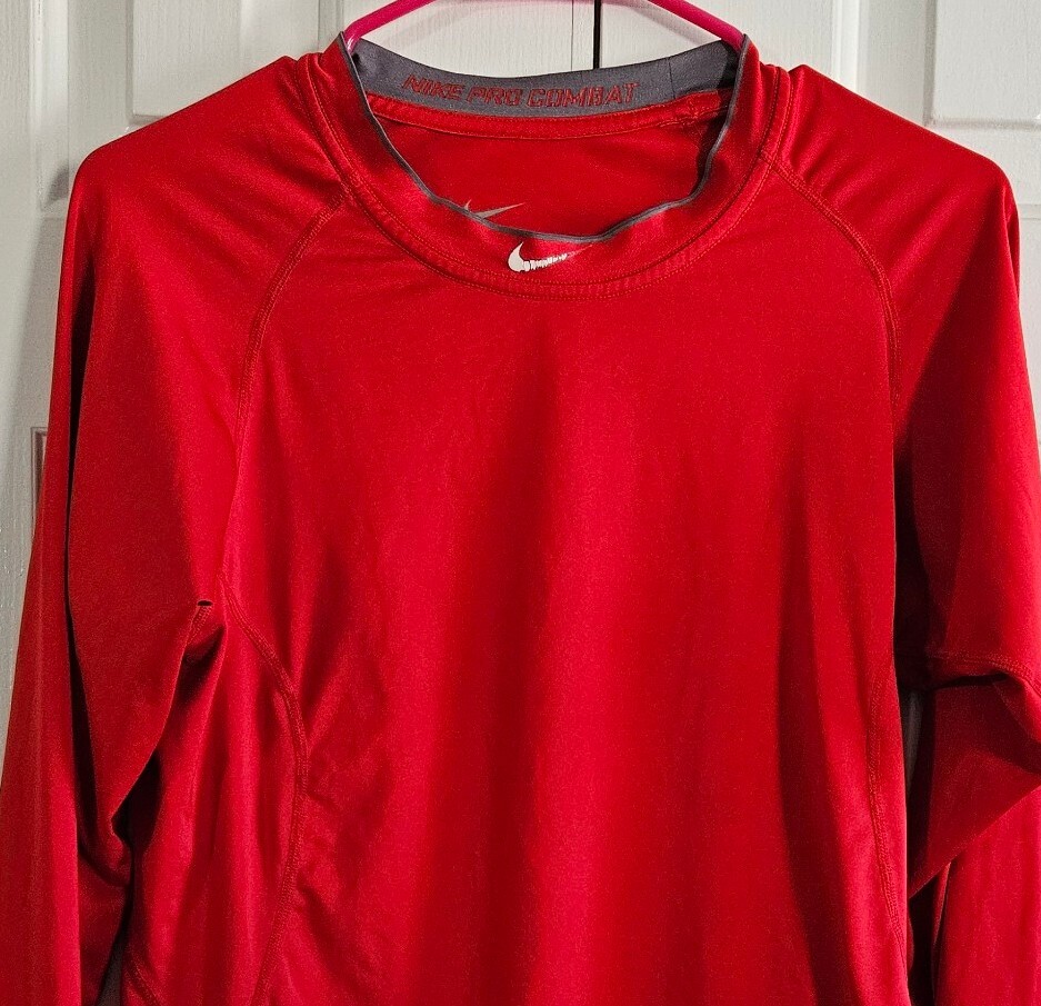 Nike Pro Combat Men's Dri-fit Fitted Compression Long Sleeve Shirt Overall good pre-owned condition, logo at neck does have some cracking and peeling (see pictures), no other flaws 84% polyester, 16% spandex, stretchy Marked a size S Approximate measurements 18 1/4 inches 26.5 inches in length from top of shoulder to bottom of hem in front