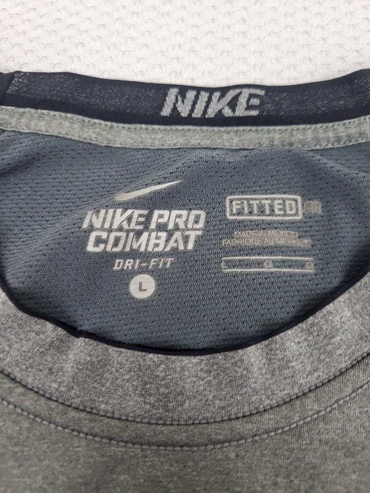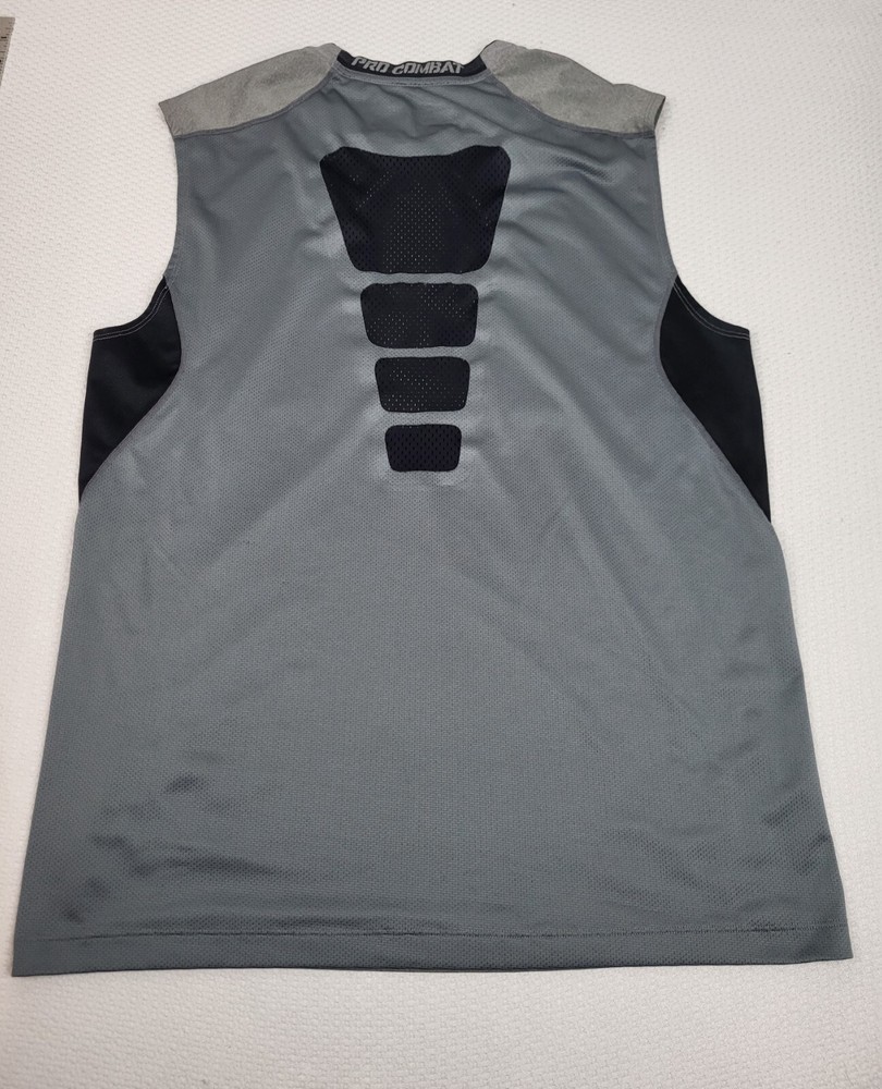 Department:MenFit:AthleticBrand:NikeTheme:Logo, SportsSeller Notes:“No holes, no stains shirt is a little faded from wear as pictured”Sleeve Length:SleevelessColor:GrayProduct Line:Nike Pro CombatStyle:BasicOccasion:ActivewearMaterial:Polyester, SpandexSize Type:RegularNeckline:Crew NeckSize:LType:TankPerformance/Activity:Cross Training, Gym & Training, Running & Jogging