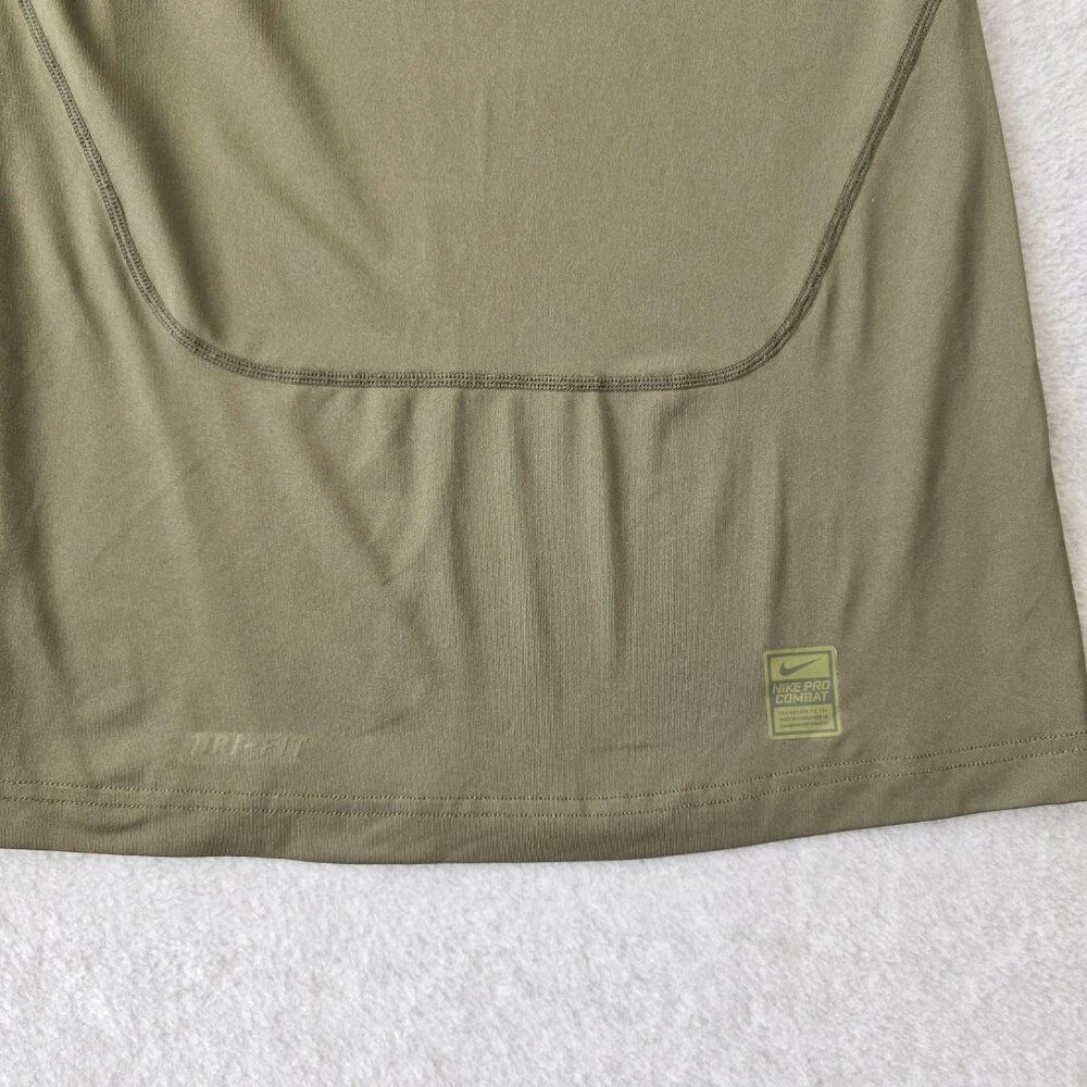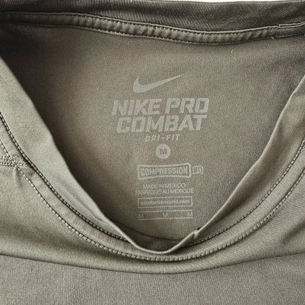 Nike Pro Combat Mens Green Olive Fitted Dri-Fit Compression Short Sleeve Shirt Pullover Active Performance CONDITION: Gently Used, No rips or stains (See Pictures) Size: Medium Material: Polyester/Spandex Approximate Measurements: Arm pit to Arm Pit: 14 1/2 " Length 26 1/2" Thanks for Visiting!