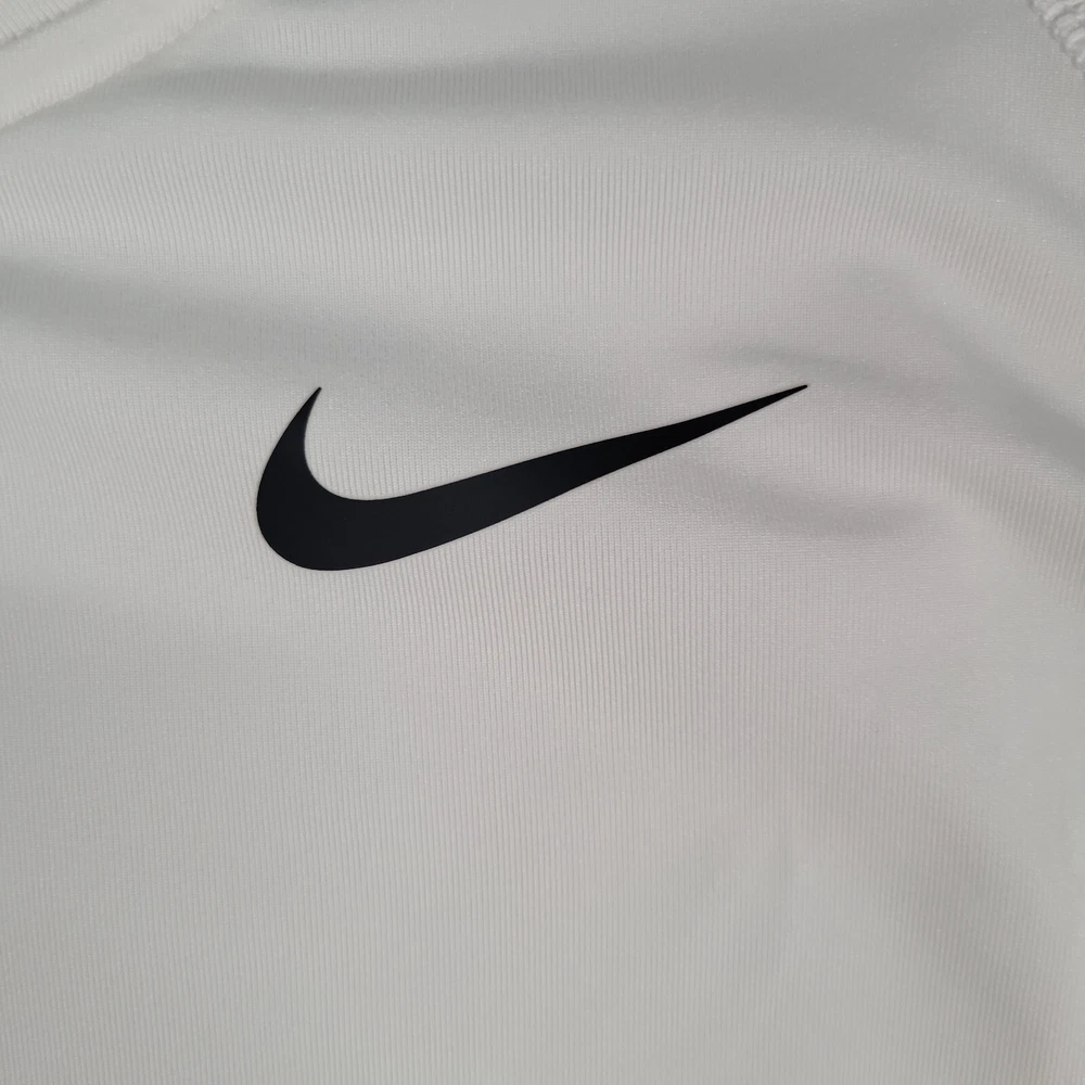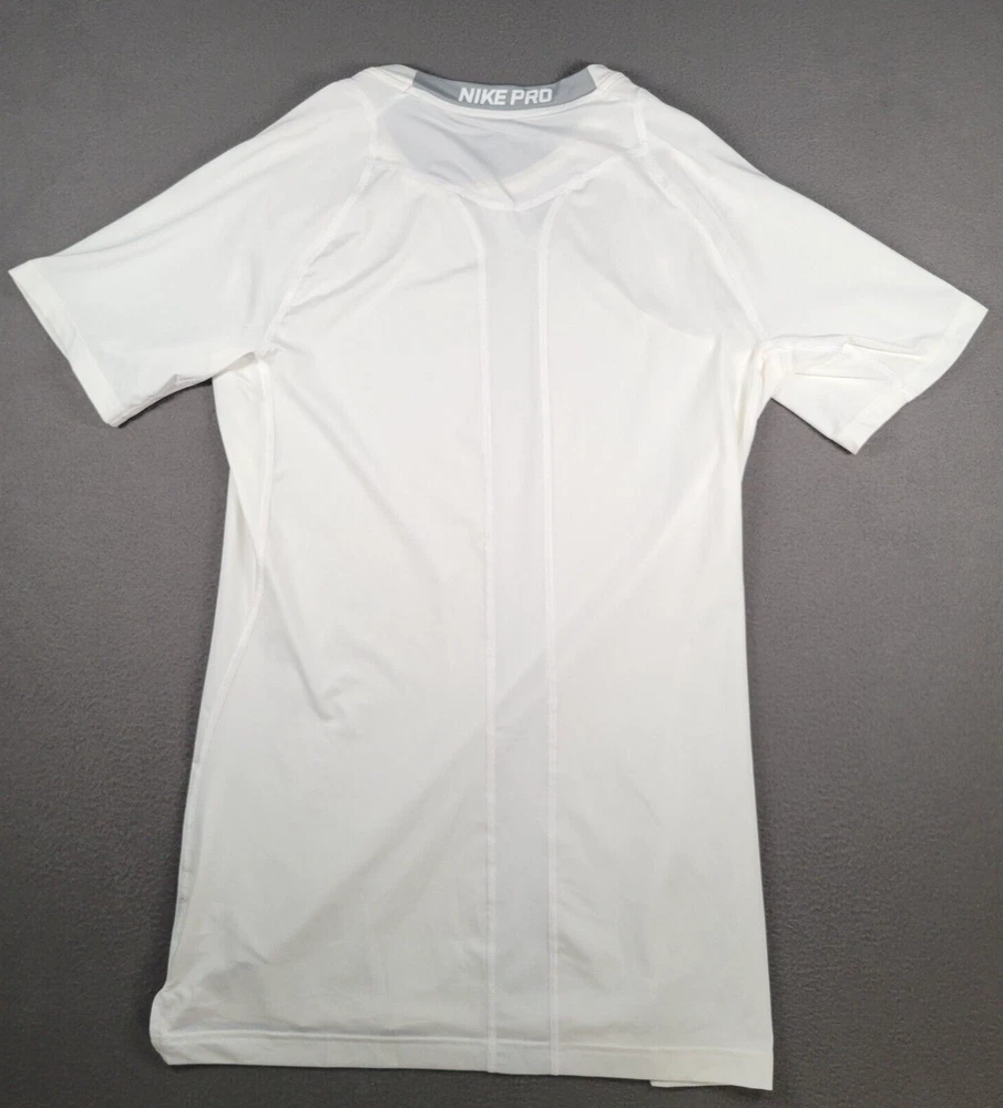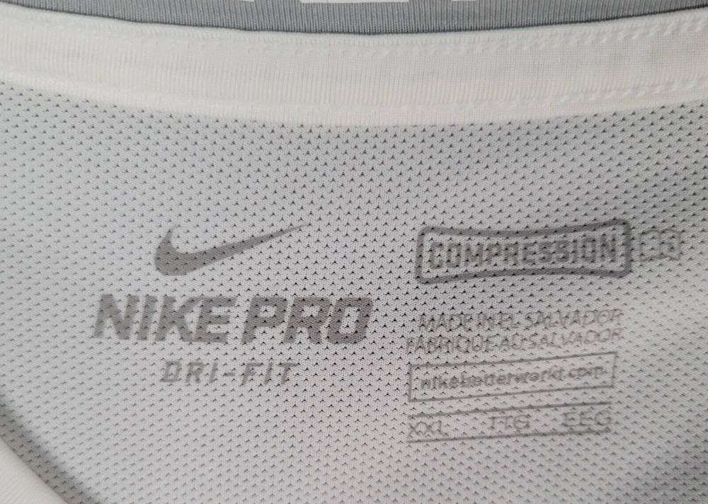 Occasion: Activewear Neckline: Crew Neck Season: Spring, Summer Color: White Handmade: No Fit: Athletic Shirt Length: 30 in Type: T-Shirt Brand: Nike Collar Style: Band Country/Region of Manufacture: El Salvador Department: Men Character: N/A Garment Care: Machine Washable Chest Size: 38 in Pattern: Solid Features: Lightweight, Moisture Wicking, Quick Dry, Stretch Material: Polyester, Spandex Sleeve Length: Short Sleeve Closure: Pullover Size: 2XL Vintage: No Accents: Logo Fabric Wash: Medium Size Type: Regular Personalize: No Theme: Logo, Outdoor, Sports Fabric Type: Jersey Compression Level: Firm Product Line: Nike Pro Compression Performance/Activity: CrossFit, Cross Training, Gym & Training, Running & Jogging Style: Pullover Sleeve Type: Classic/Fitted Sleeve Model: Nike Dri-Fit