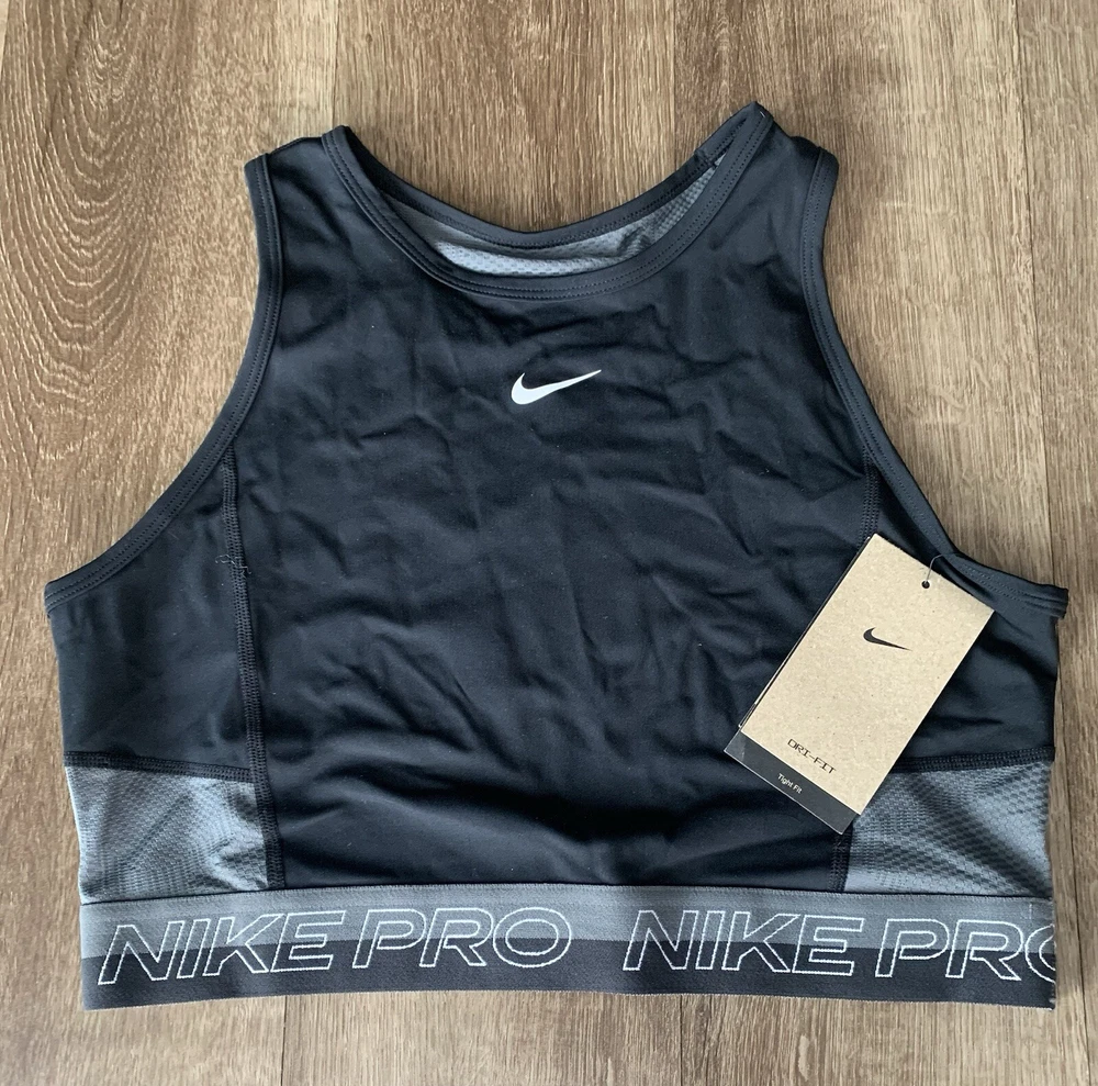 Elevate your workout wardrobe with the Nike Pro Dri-FIT Cropped Training Tank Top. Designed for the modern woman who seeks both style and functionality, this tank features Nike's innovative Dri-FIT technology, ensuring you stay cool and dry during even the most intense workouts. The sleek black and gray color scheme pairs effortlessly with your favorite activewear, making it a versatile addition to any fitness enthusiast's collection. Crafted with a focus on performance, this cropped tank top is part of the esteemed Nike Pro product line, known for its high-quality fabrics and impeccable craftsmanship. The regular size small fits true to size, providing a comfortable and flattering silhouette. Whether you're hitting the gym or enjoying an outdoor jog, this Nike Dri-FIT tank is engineered to support your active lifestyle.