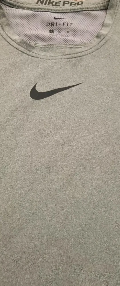 This Nike Pro Dri-Fit Men's Tee is a solid gray short sleeve shirt designed for athletic performance. Made of a polyester-spandex blended fabric, it features a crew neck and pullover closure. The shirt is lightweight, moisture-wicking, and breathable, making it ideal for activities like gym training, cross-training, bodybuilding, and running. With its athletic fit and Nike Pro branding, this XL tee is a versatile choice for sports and workouts. In good condition!