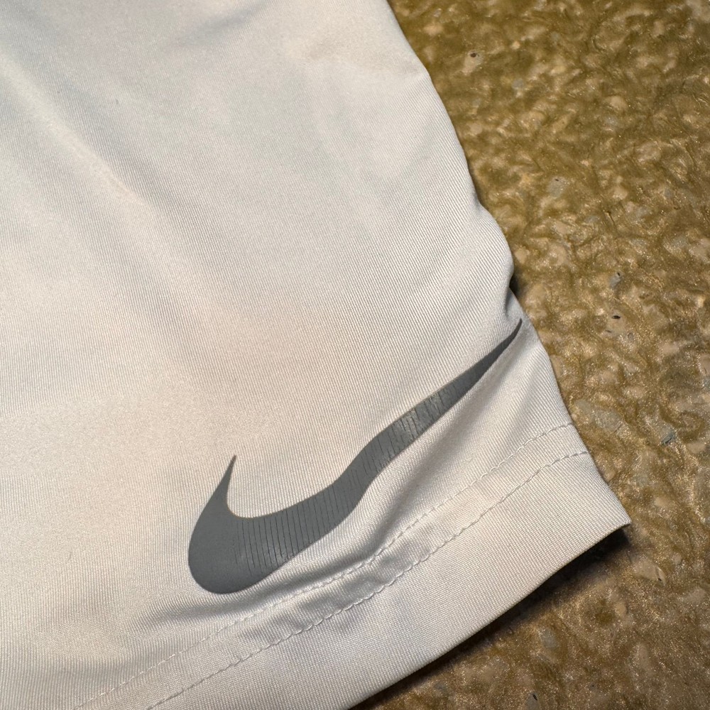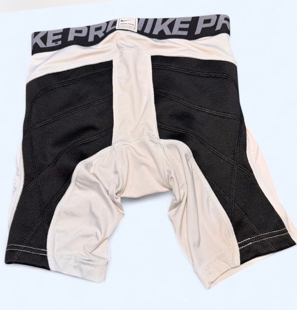 Nike Pro Hyperstrong Baseball Compression Shorts in white, size Small. These shorts are designed for athletic performance, offering tight fit compression for support during baseball or other sports. Featuring a classic Nike Pro waistband and grey Nike swoosh logo on the leg, they are made from a durable, moisture-wicking fabric blend. Ideal for athletes seeking comfort and support. Excellent pre-owned condition with no significant flaws. Made in Sri Lanka.